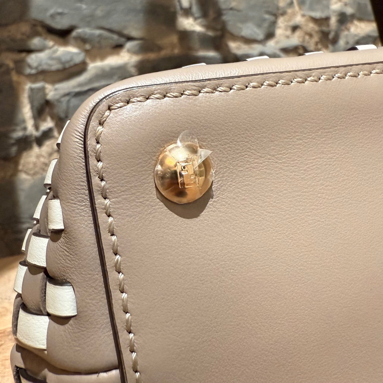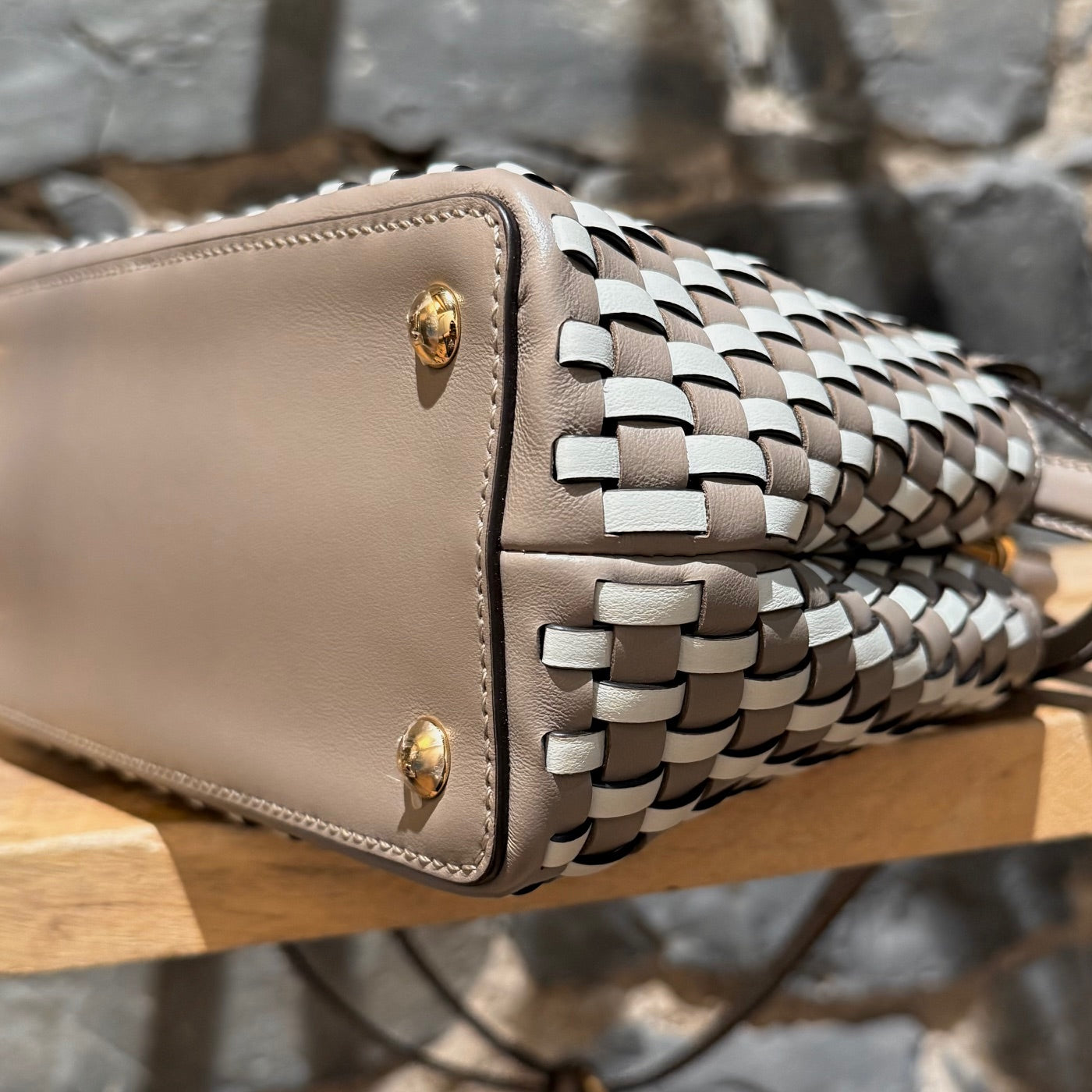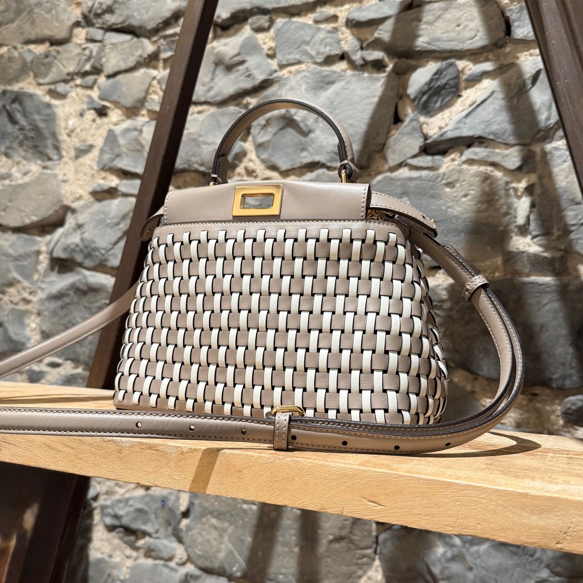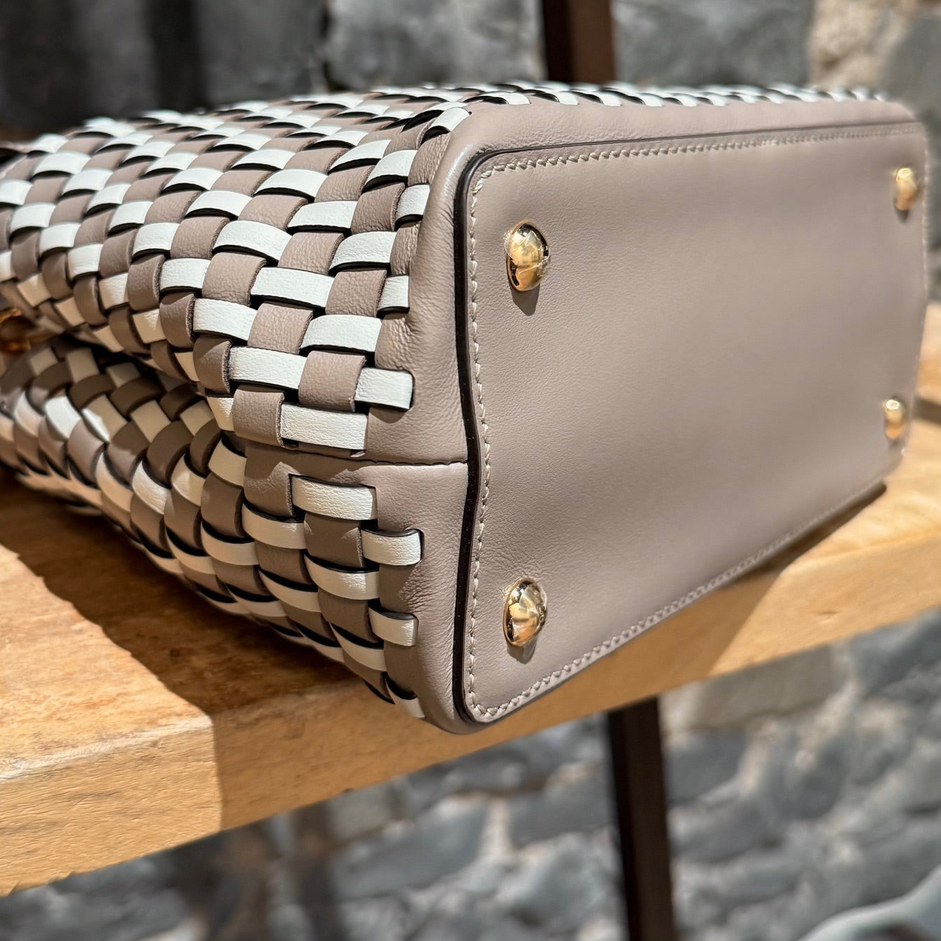 Sac mini structuré à poignée supérieure simple. Cuir tissé bicolore blanc et taupe. Motif intreccio tissé à la main. Panneau supérieur et base en cuir taupe. Fermetures torsadées Peekaboo signature en métal doré sur les deux côtés. Bandoulière en cuir ajustable et amovible pour porté épaule et bandoulière. Pieds de protection en métal doré. Doublure en cuir taupe. Double compartiment avec poche zippée. Quincaillerie en métal doré signée sur l’ensemble. Plaque métallique intérieure Fendi. Fait en Italie. Livré avec le sac poussière Fendi original, la pochette de protection et la carte d’authenticité.