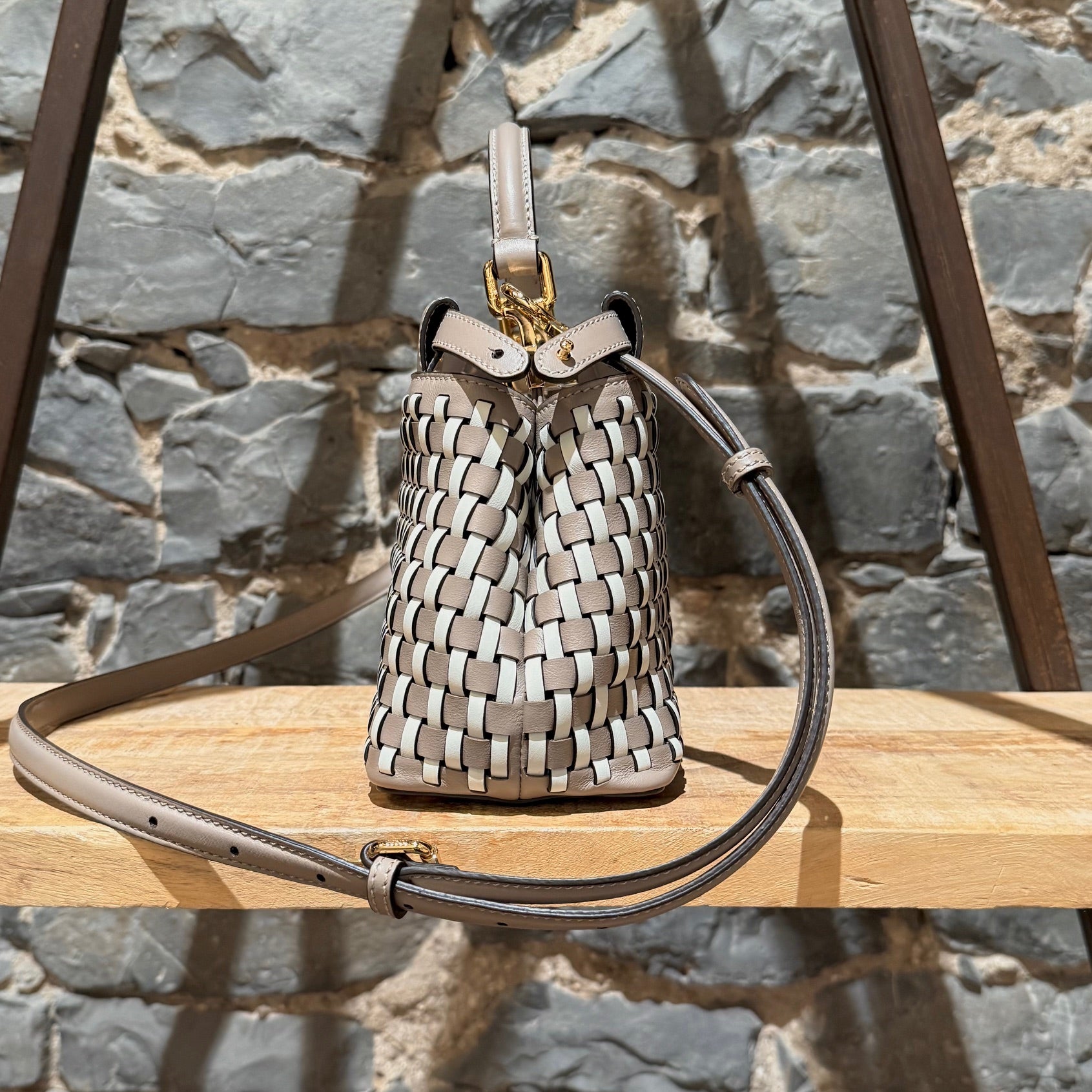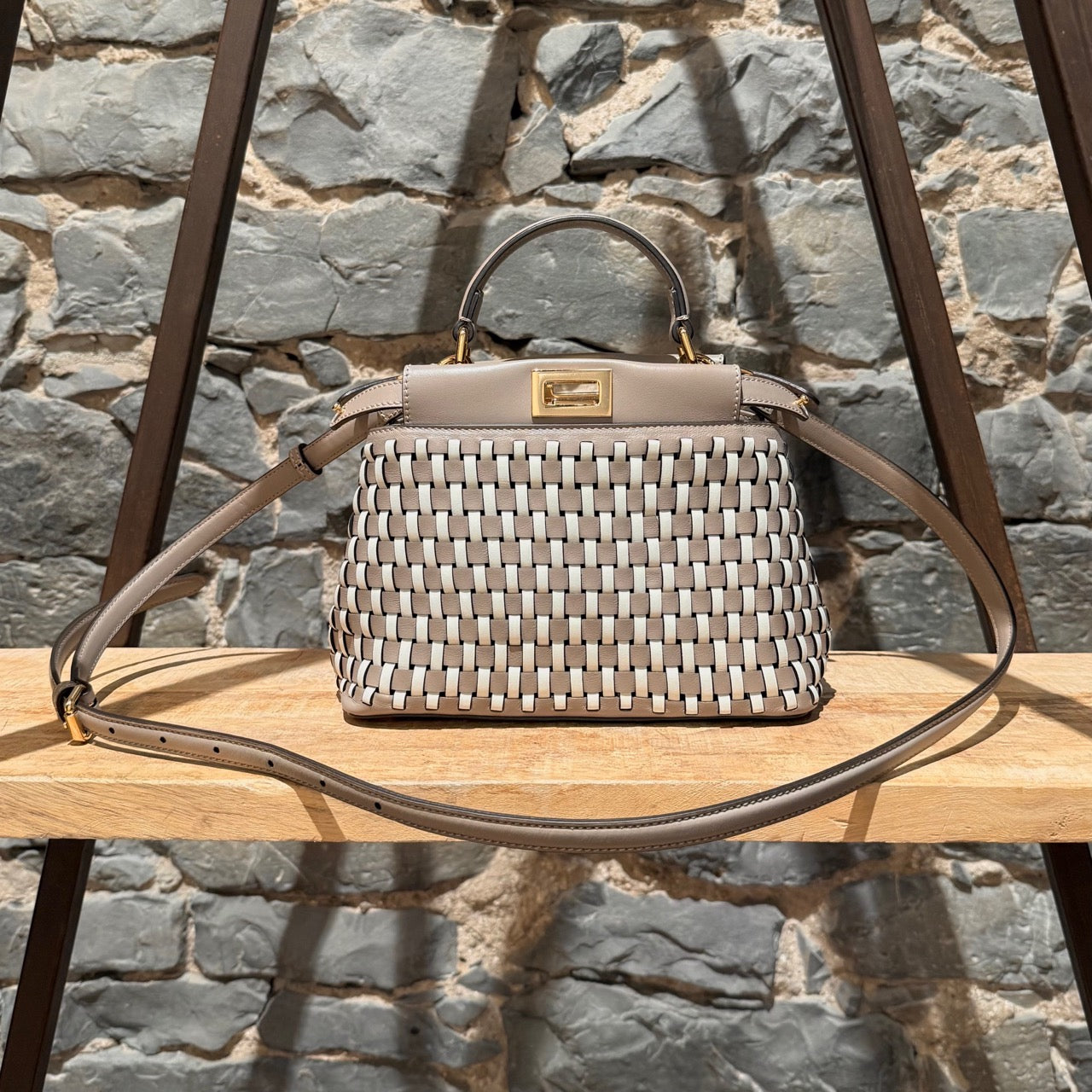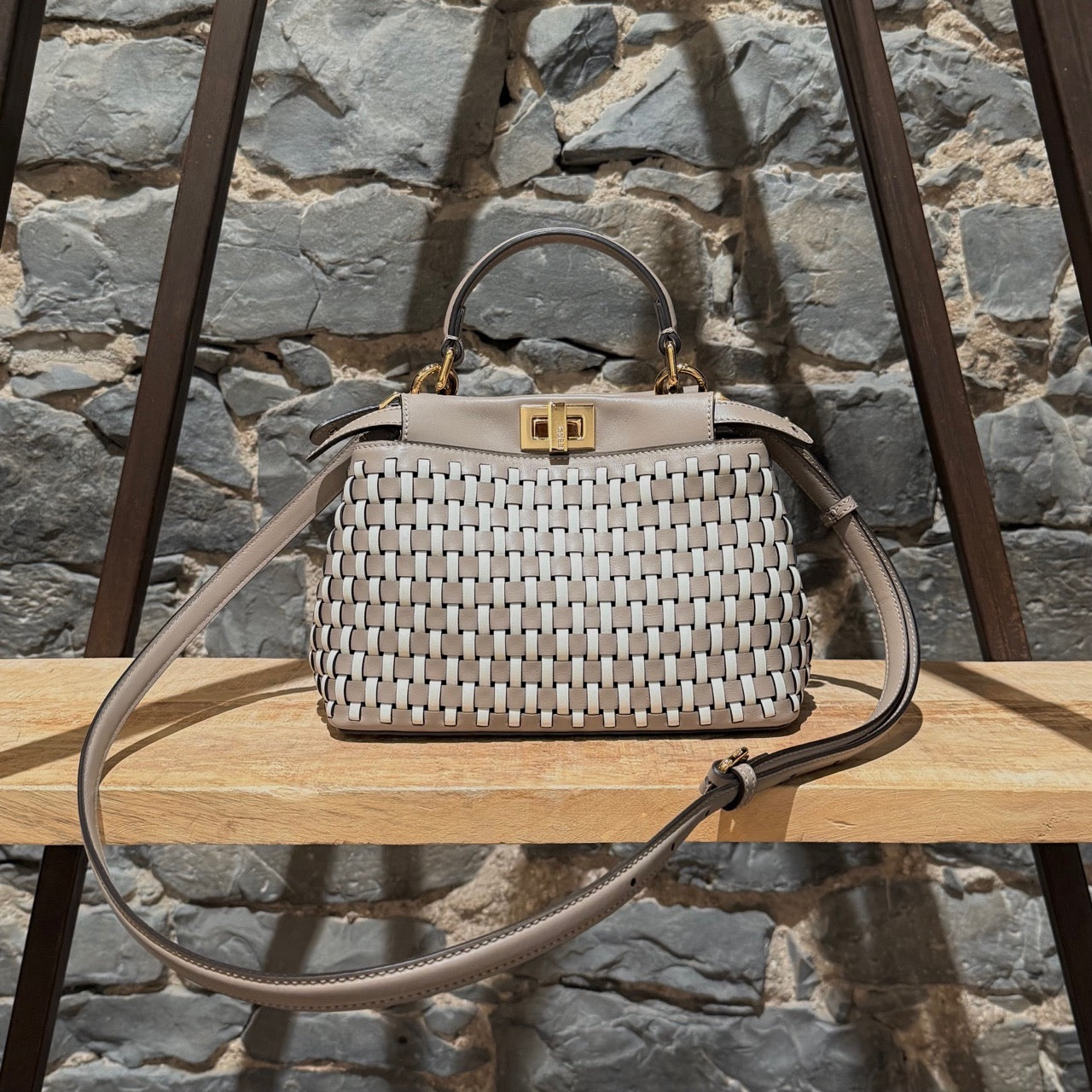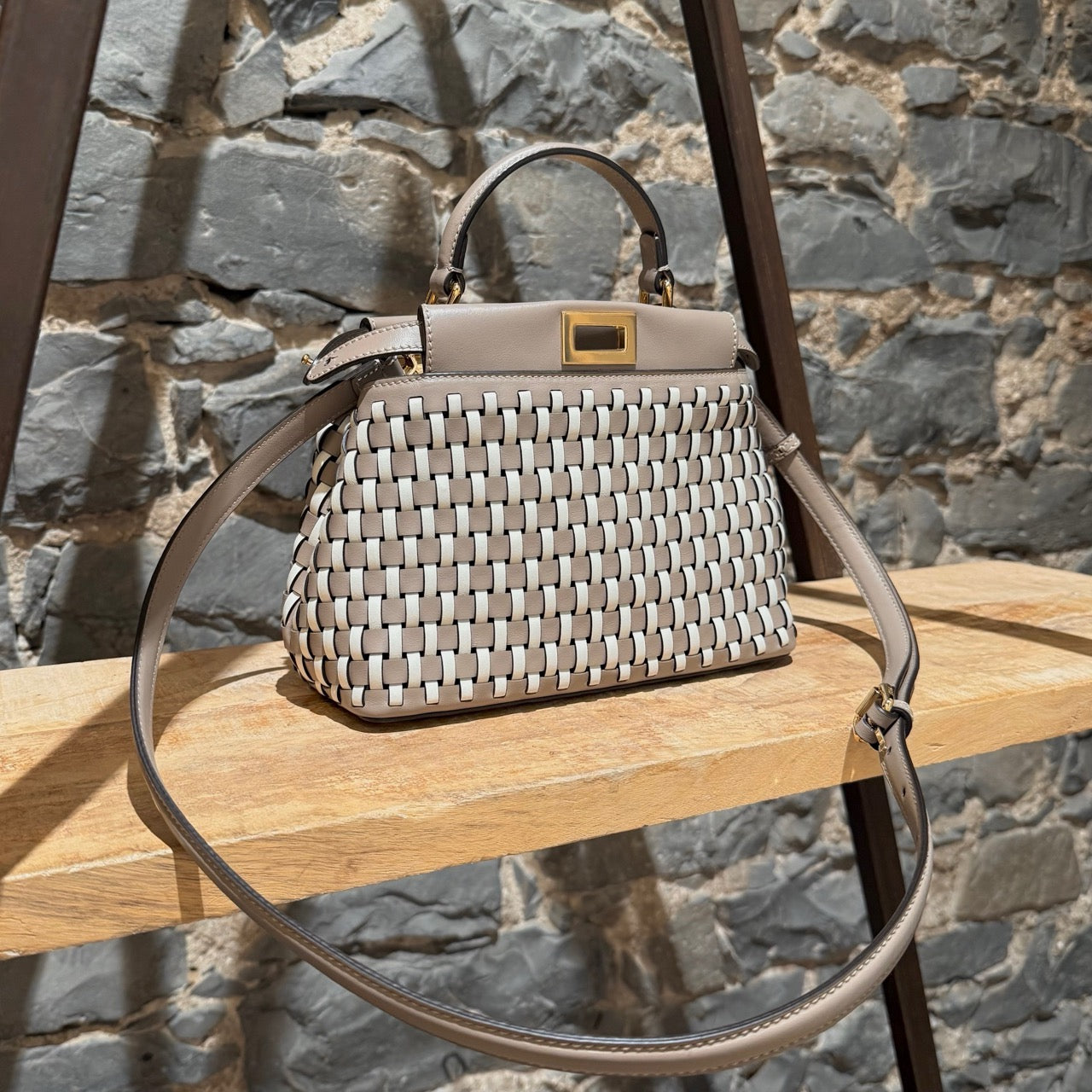 Sac mini structuré à poignée supérieure simple. Cuir tissé bicolore blanc et taupe. Motif intreccio tissé à la main. Panneau supérieur et base en cuir taupe. Fermetures torsadées Peekaboo signature en métal doré sur les deux côtés. Bandoulière en cuir ajustable et amovible pour porté épaule et bandoulière. Pieds de protection en métal doré. Doublure en cuir taupe. Double compartiment avec poche zippée. Quincaillerie en métal doré signée sur l’ensemble. Plaque métallique intérieure Fendi. Fait en Italie. Livré avec le sac poussière Fendi original, la pochette de protection et la carte d’authenticité.