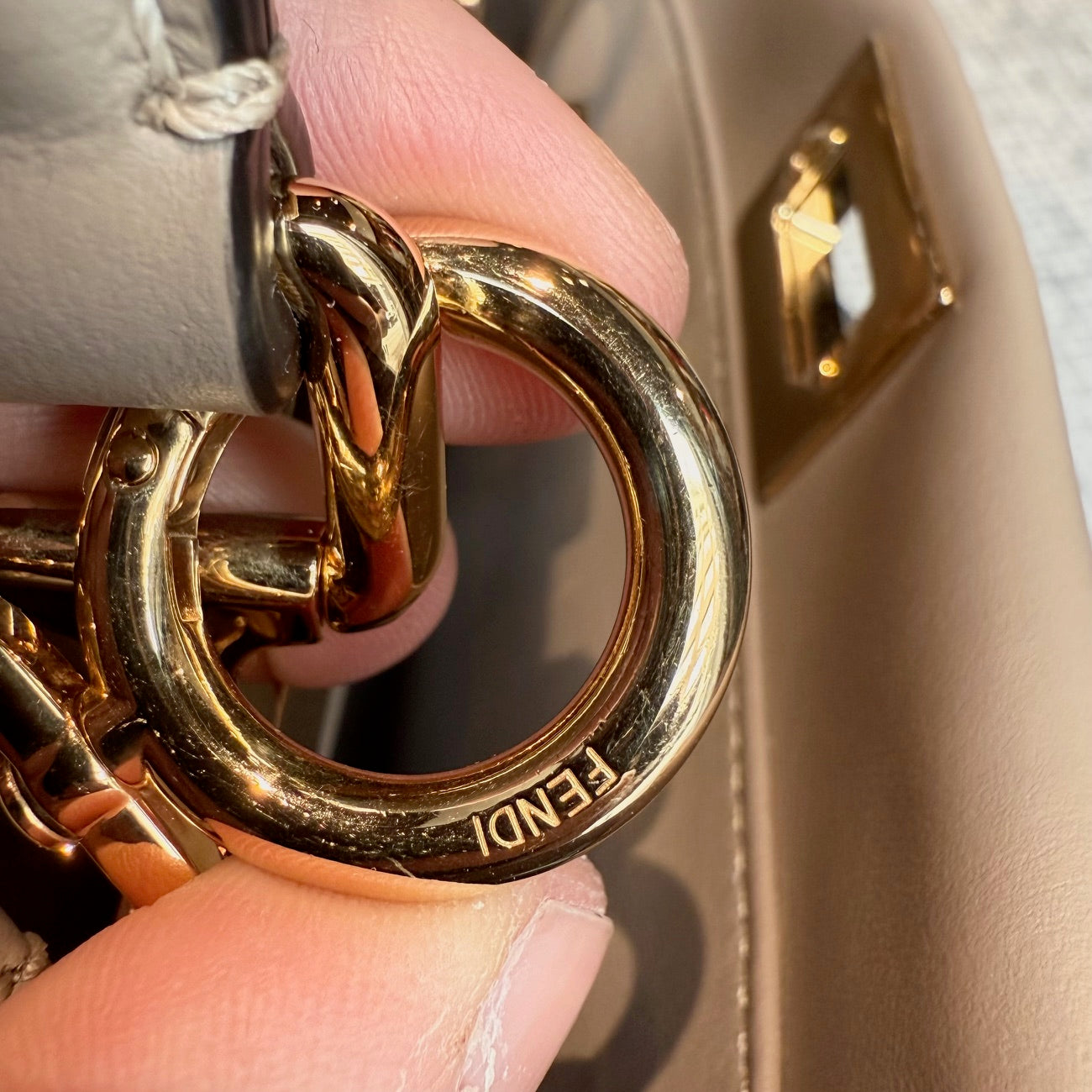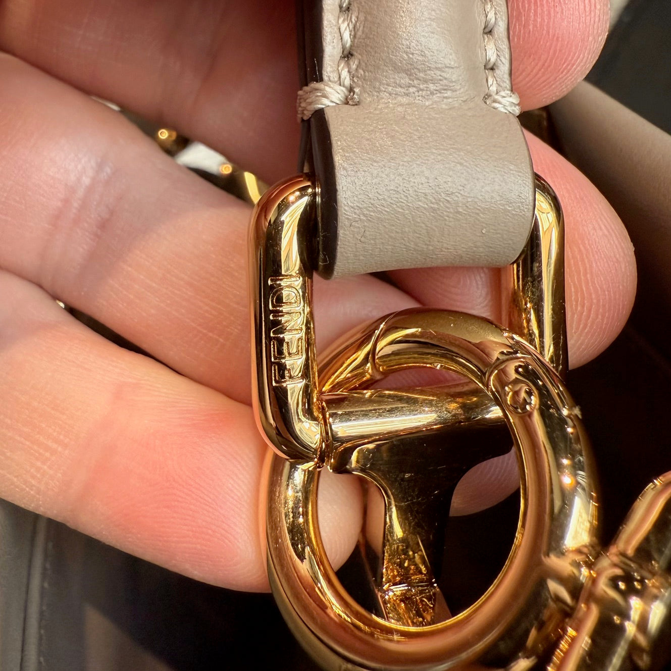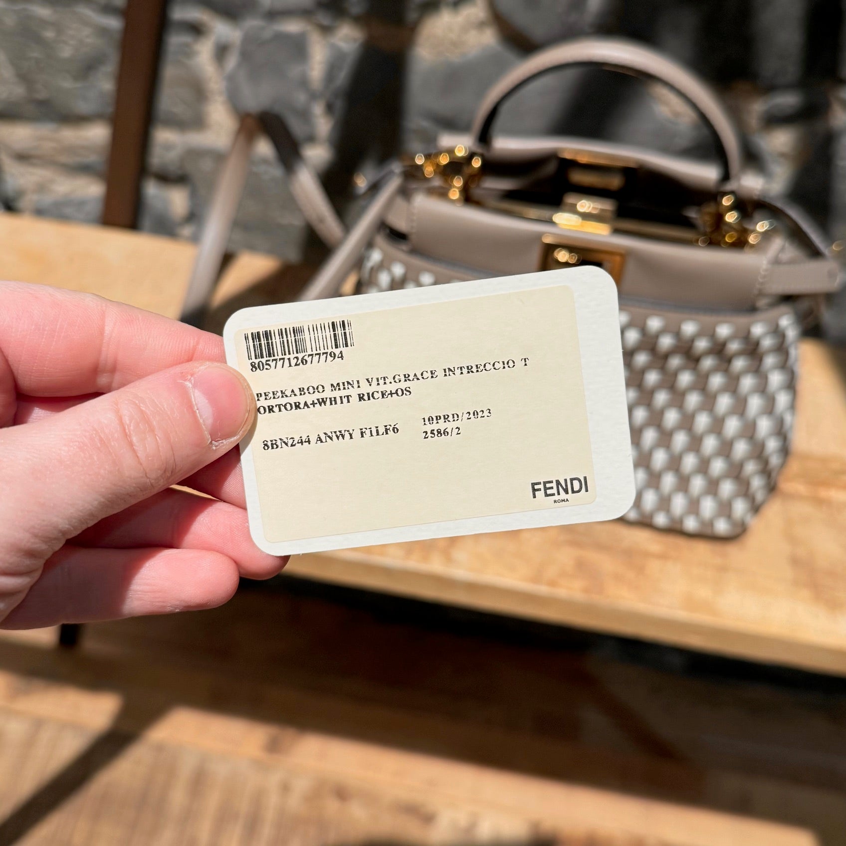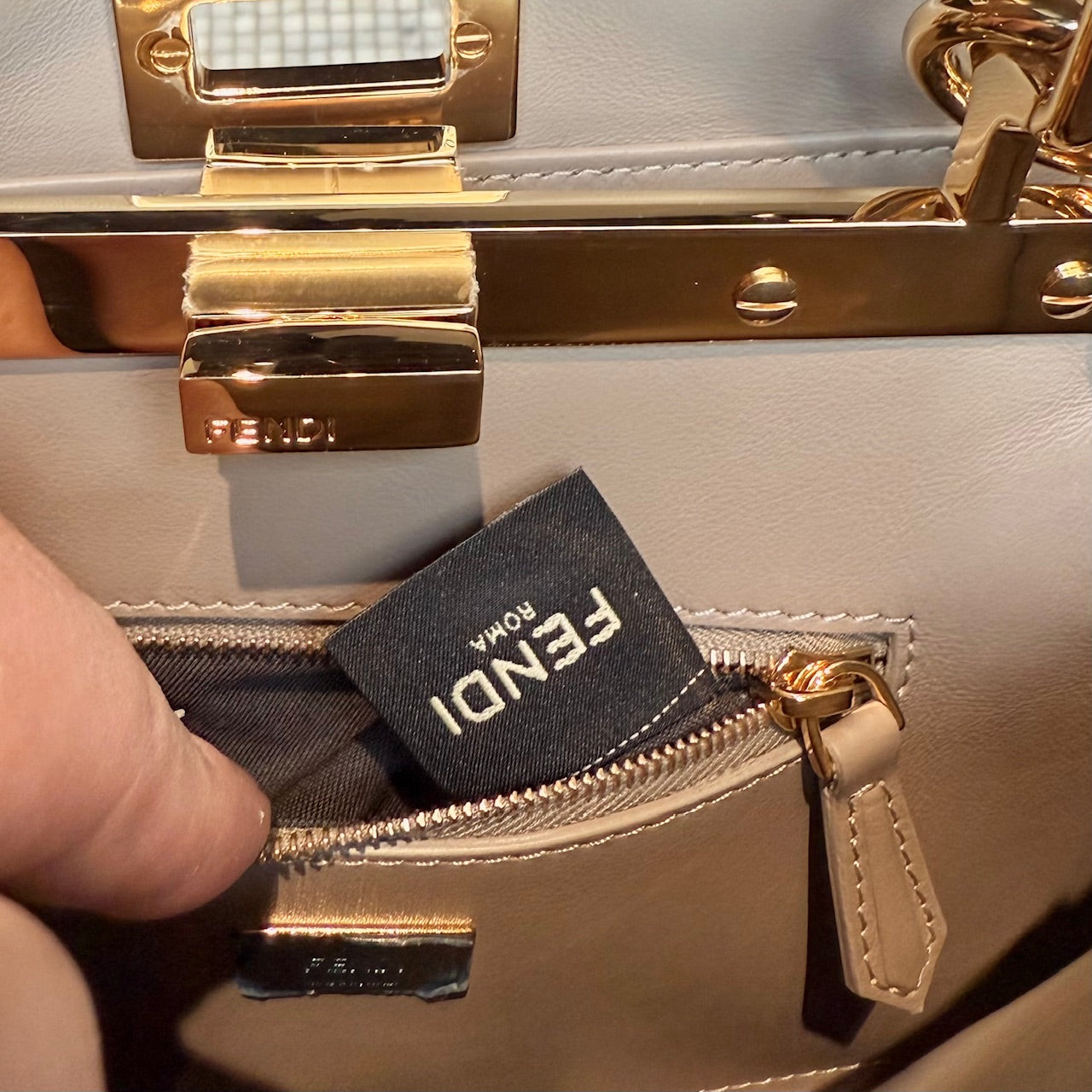 Sac mini structuré à poignée supérieure simple. Cuir tissé bicolore blanc et taupe. Motif intreccio tissé à la main. Panneau supérieur et base en cuir taupe. Fermetures torsadées Peekaboo signature en métal doré sur les deux côtés. Bandoulière en cuir ajustable et amovible pour porté épaule et bandoulière. Pieds de protection en métal doré. Doublure en cuir taupe. Double compartiment avec poche zippée. Quincaillerie en métal doré signée sur l’ensemble. Plaque métallique intérieure Fendi. Fait en Italie. Livré avec le sac poussière Fendi original, la pochette de protection et la carte d’authenticité.