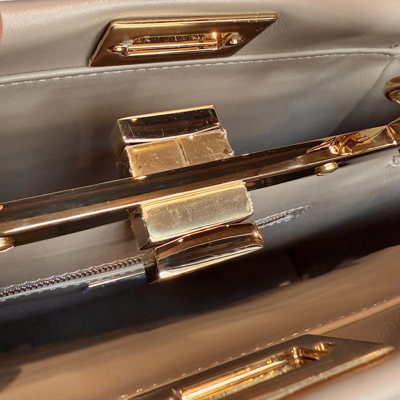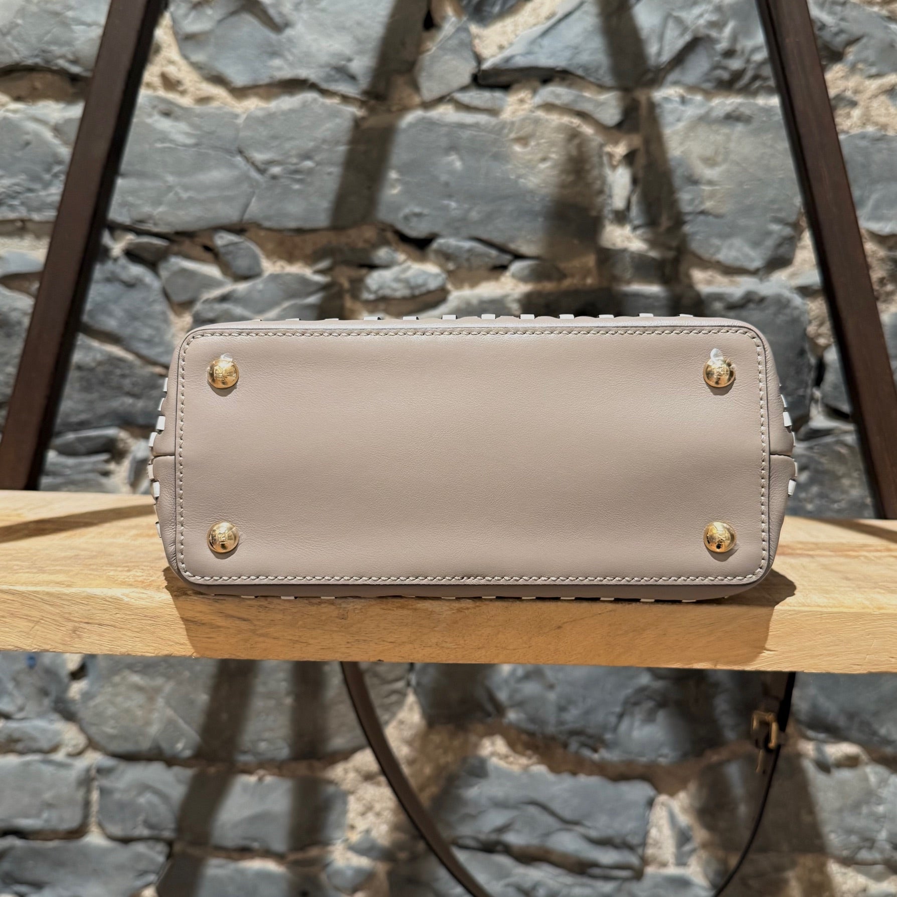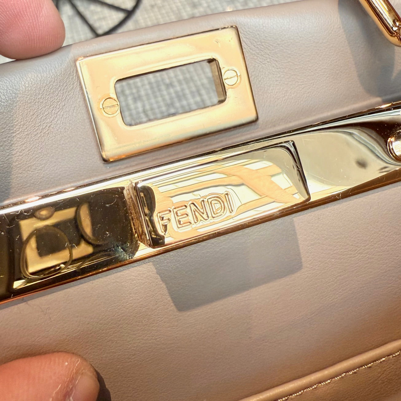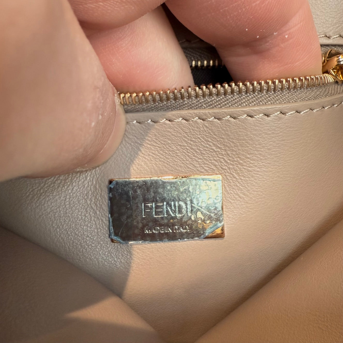 Sac mini structuré à poignée supérieure simple. Cuir tissé bicolore blanc et taupe. Motif intreccio tissé à la main. Panneau supérieur et base en cuir taupe. Fermetures torsadées Peekaboo signature en métal doré sur les deux côtés. Bandoulière en cuir ajustable et amovible pour porté épaule et bandoulière. Pieds de protection en métal doré. Doublure en cuir taupe. Double compartiment avec poche zippée. Quincaillerie en métal doré signée sur l’ensemble. Plaque métallique intérieure Fendi. Fait en Italie. Livré avec le sac poussière Fendi original, la pochette de protection et la carte d’authenticité.