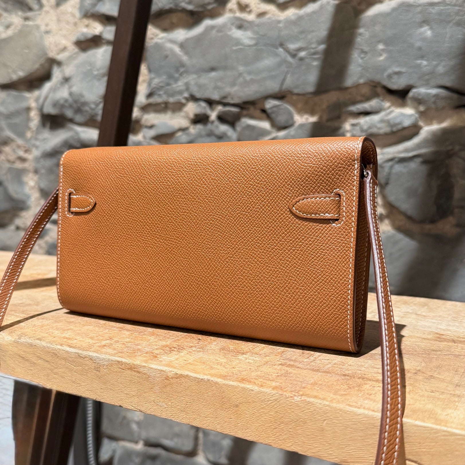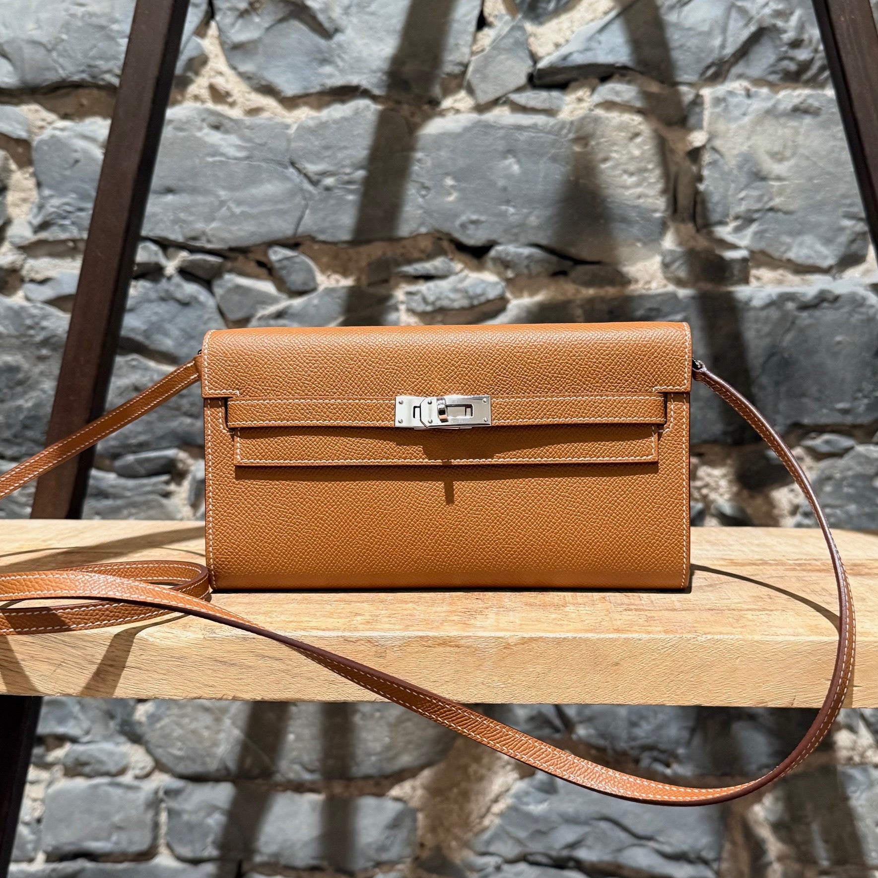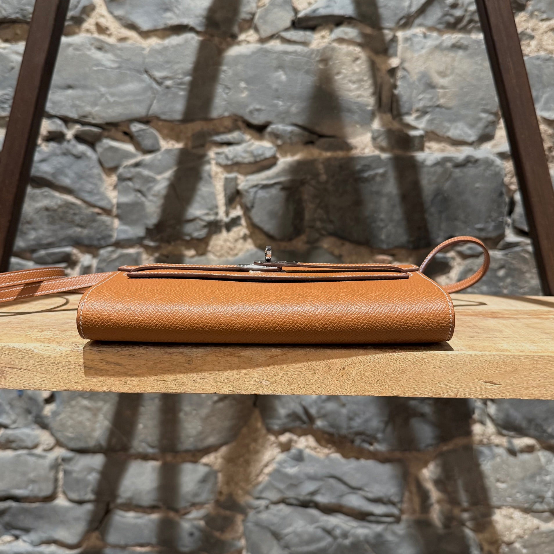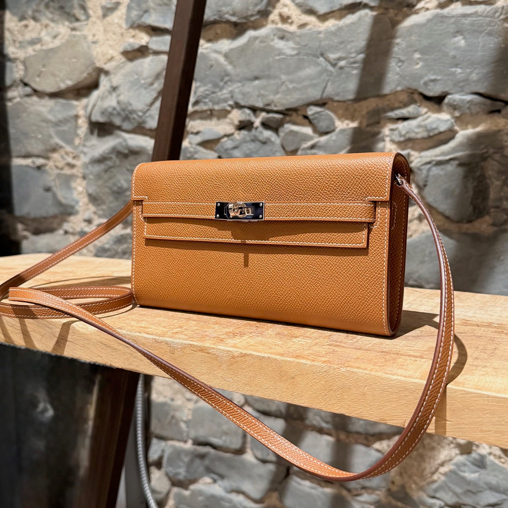 Portefeuille Kelly compact avec bandoulière. Silhouette rectangulaire structurée en cuir Epsom couleur or. Quincaillerie en métal finition palladium gravée Hermès Paris. Rabat avant avec fermeture Kelly à sangles et tourniquet. Bandoulière fine amovible en cuir permettant un porté à l’épaule ou en bandoulière. Marquage de la marque à l’avant. Intérieur accordéon doublé de cuir avec 2 (deux) compartiments, 4 (quatre) fentes pour cartes et un compartiment central zippé avec breloque cadenas. Estampille Y – 2020. Fait en France. Livré avec boîte Hermès et sac poussière.