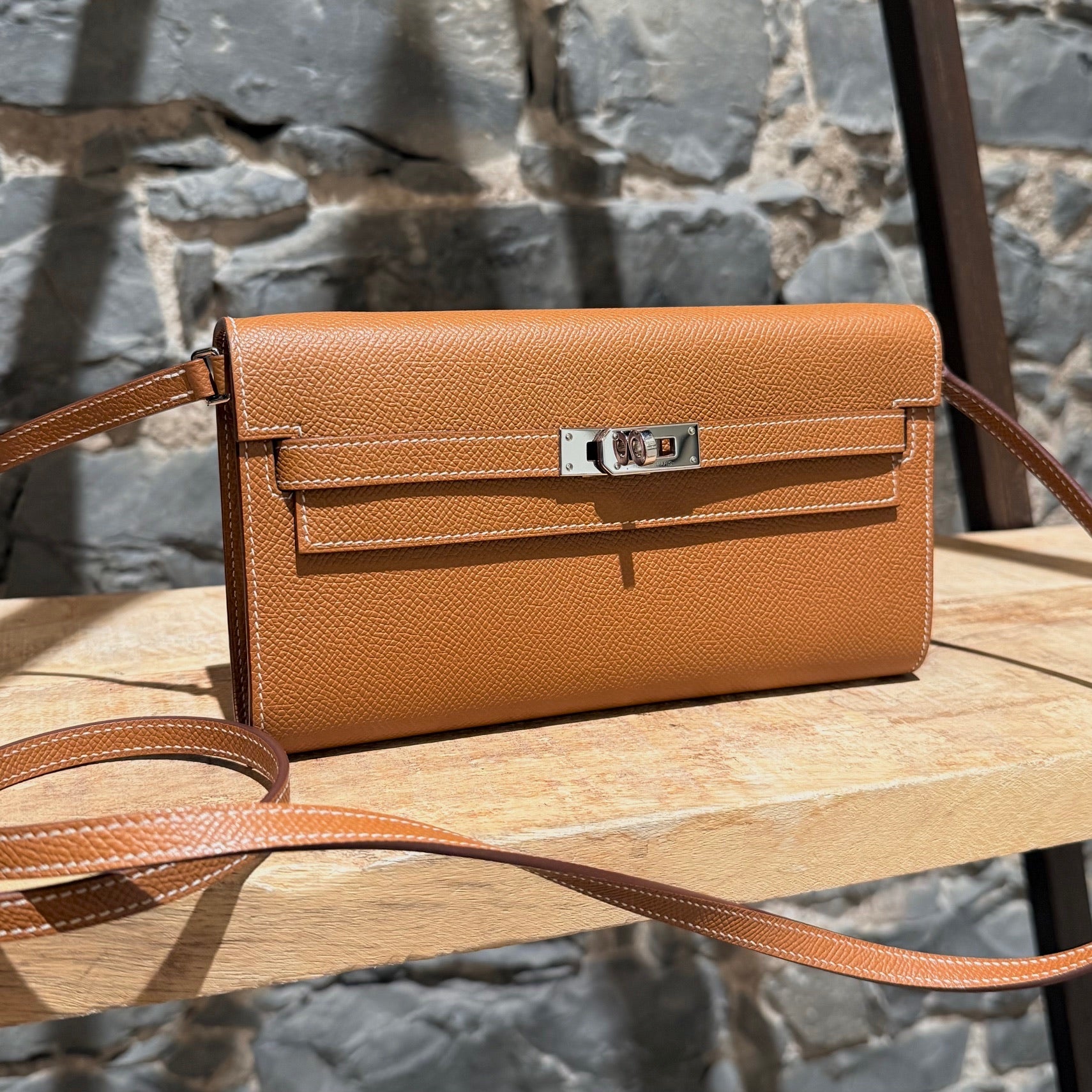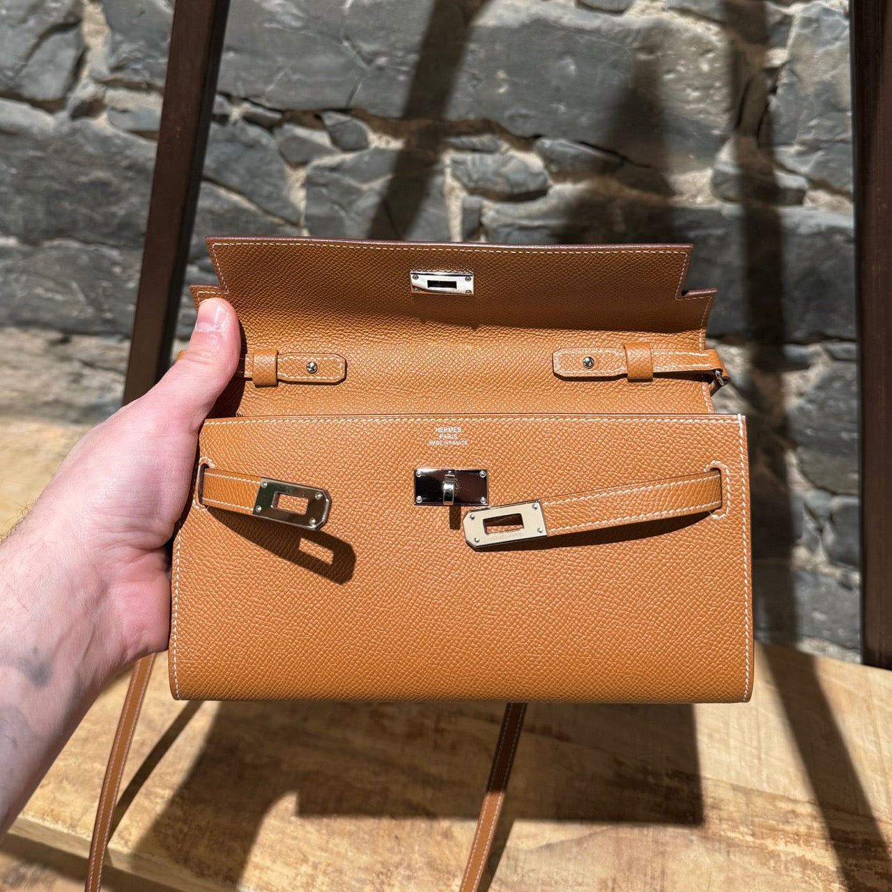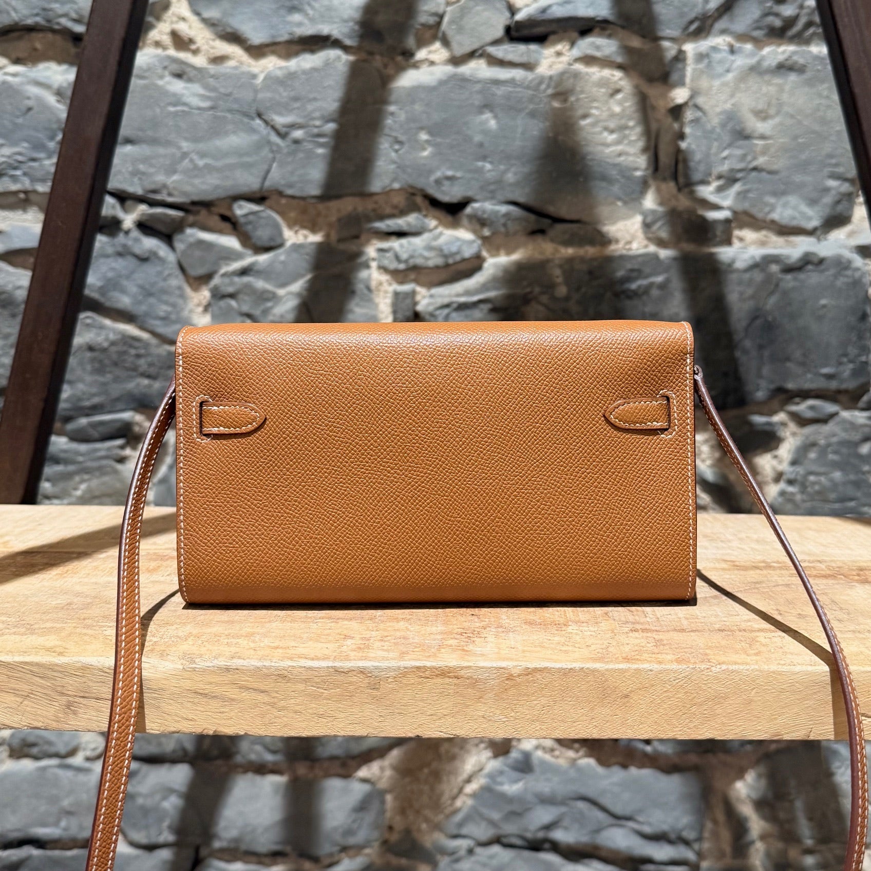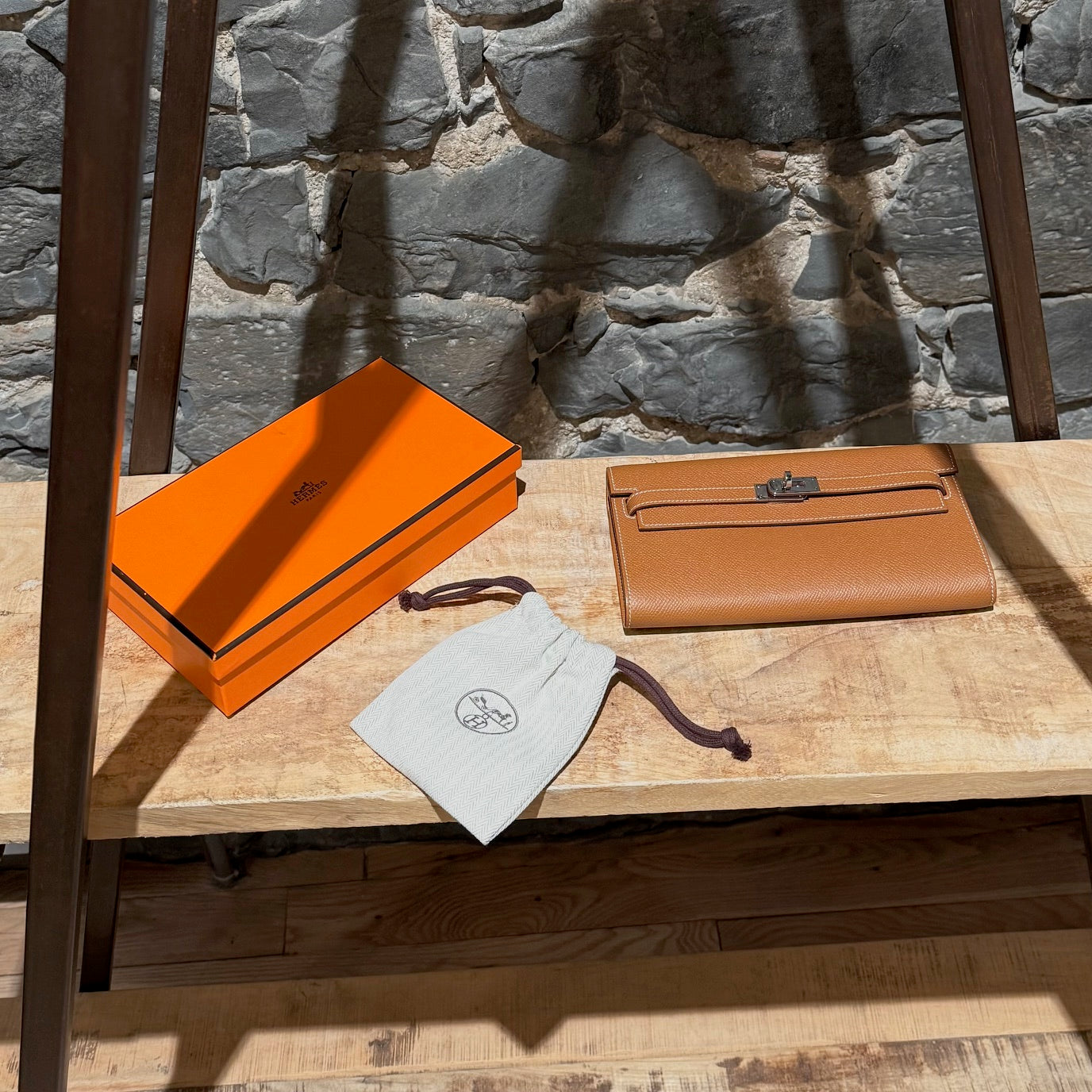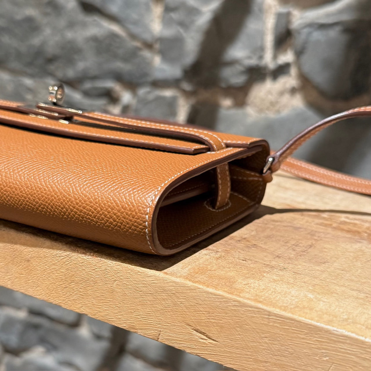 Portefeuille Kelly compact avec bandoulière. Silhouette rectangulaire structurée en cuir Epsom couleur or. Quincaillerie en métal finition palladium gravée Hermès Paris. Rabat avant avec fermeture Kelly à sangles et tourniquet. Bandoulière fine amovible en cuir permettant un porté à l’épaule ou en bandoulière. Marquage de la marque à l’avant. Intérieur accordéon doublé de cuir avec 2 (deux) compartiments, 4 (quatre) fentes pour cartes et un compartiment central zippé avec breloque cadenas. Estampille Y – 2020. Fait en France. Livré avec boîte Hermès et sac poussière.