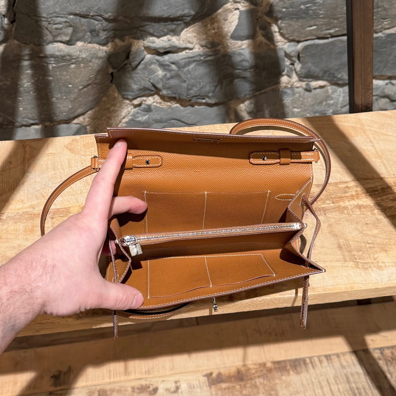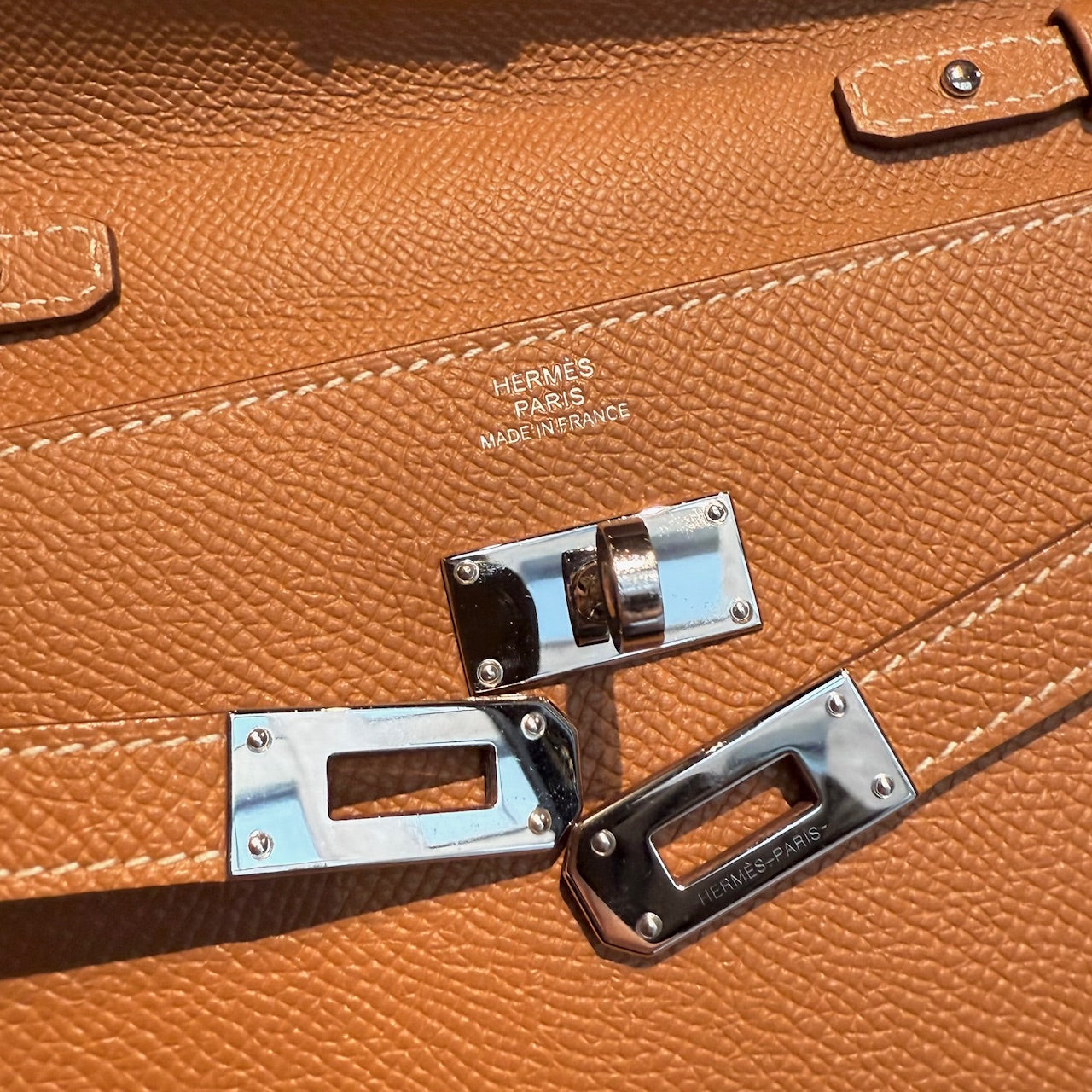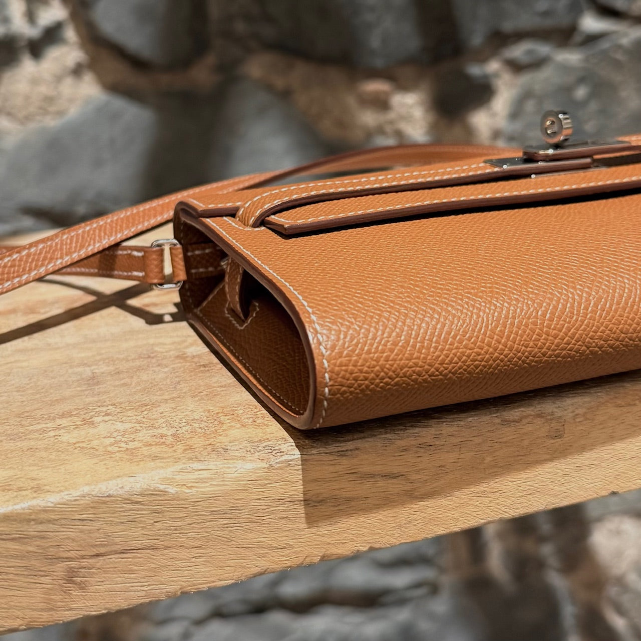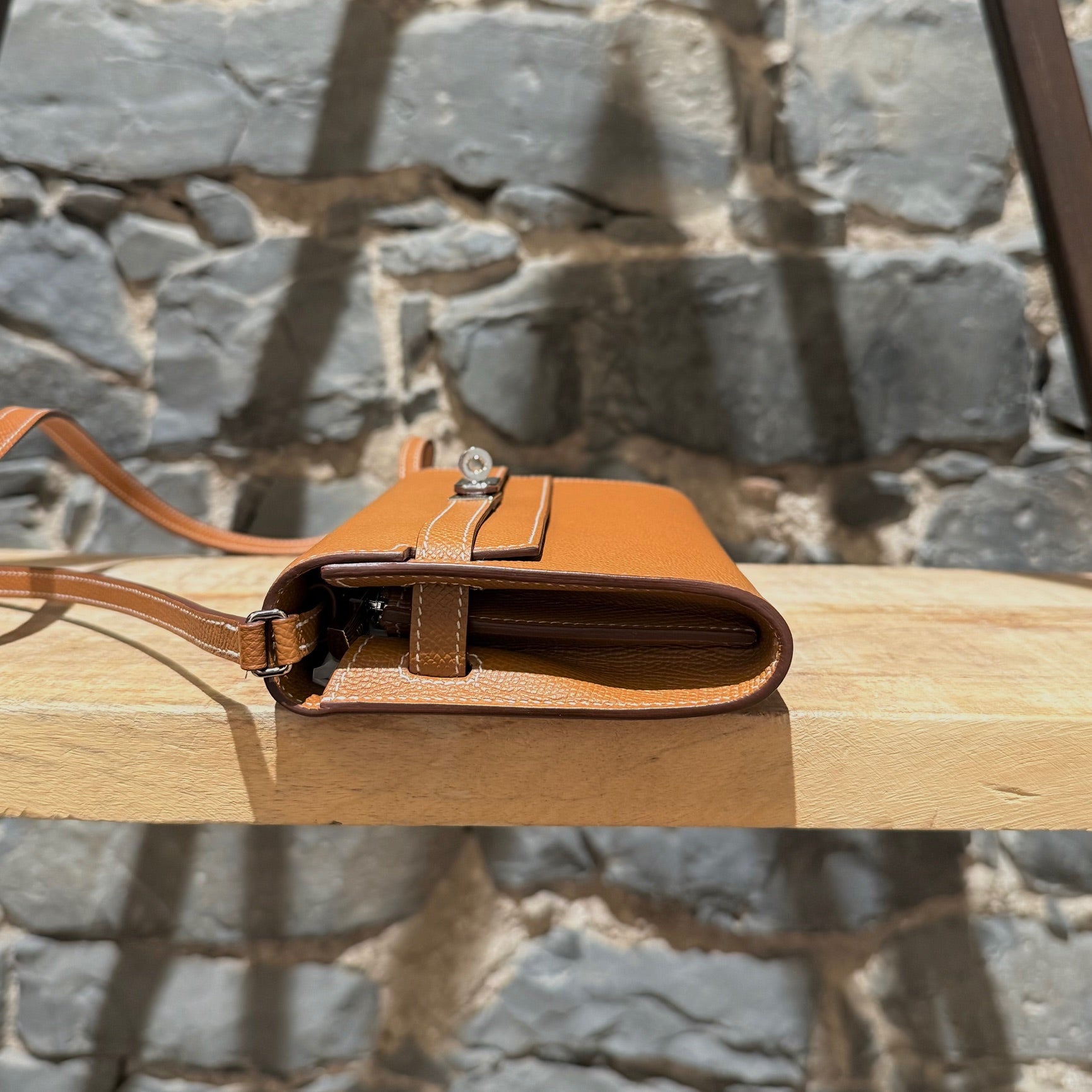 Portefeuille Kelly compact avec bandoulière. Silhouette rectangulaire structurée en cuir Epsom couleur or. Quincaillerie en métal finition palladium gravée Hermès Paris. Rabat avant avec fermeture Kelly à sangles et tourniquet. Bandoulière fine amovible en cuir permettant un porté à l’épaule ou en bandoulière. Marquage de la marque à l’avant. Intérieur accordéon doublé de cuir avec 2 (deux) compartiments, 4 (quatre) fentes pour cartes et un compartiment central zippé avec breloque cadenas. Estampille Y – 2020. Fait en France. Livré avec boîte Hermès et sac poussière.