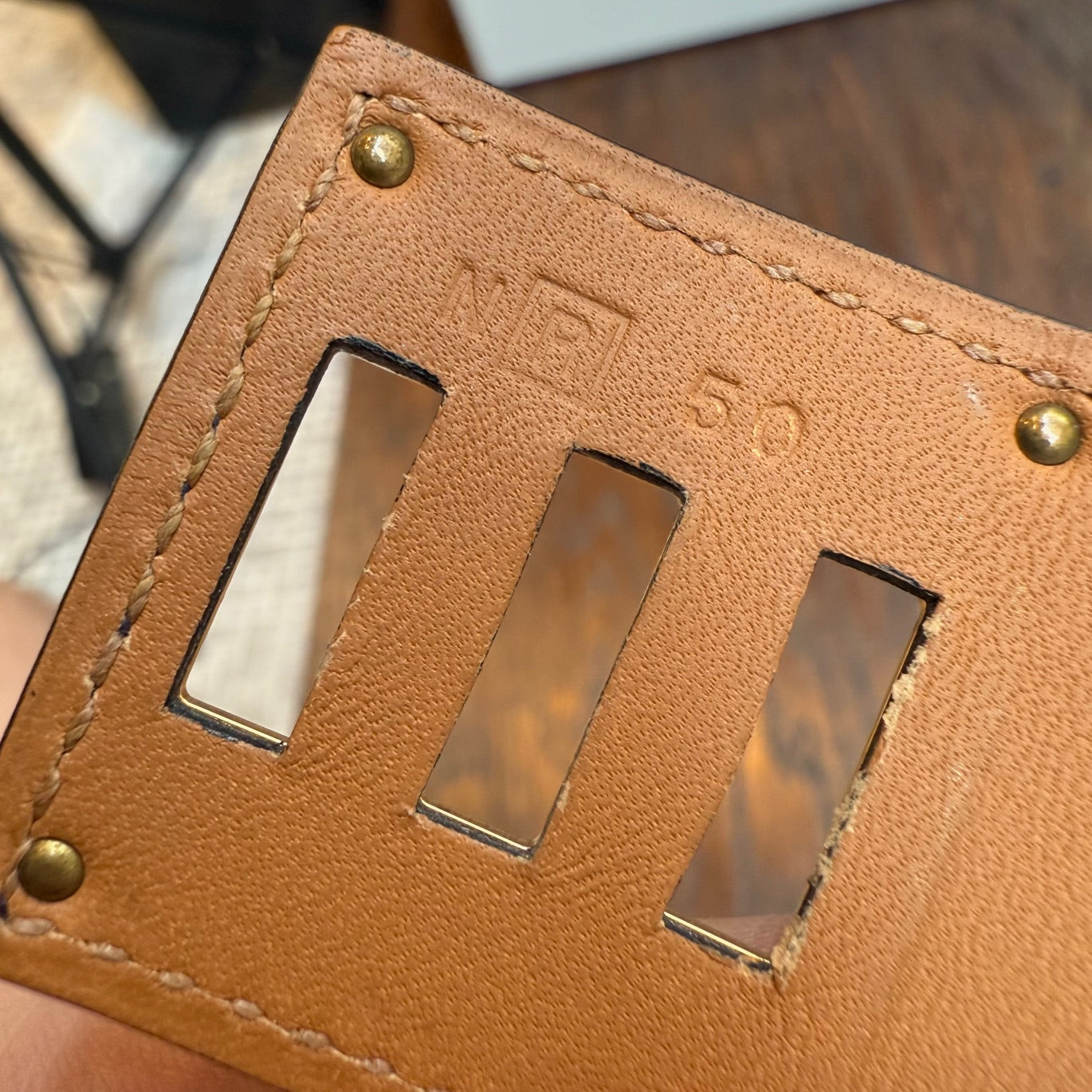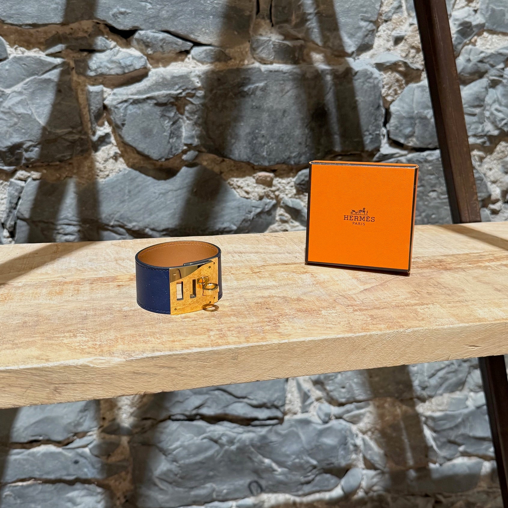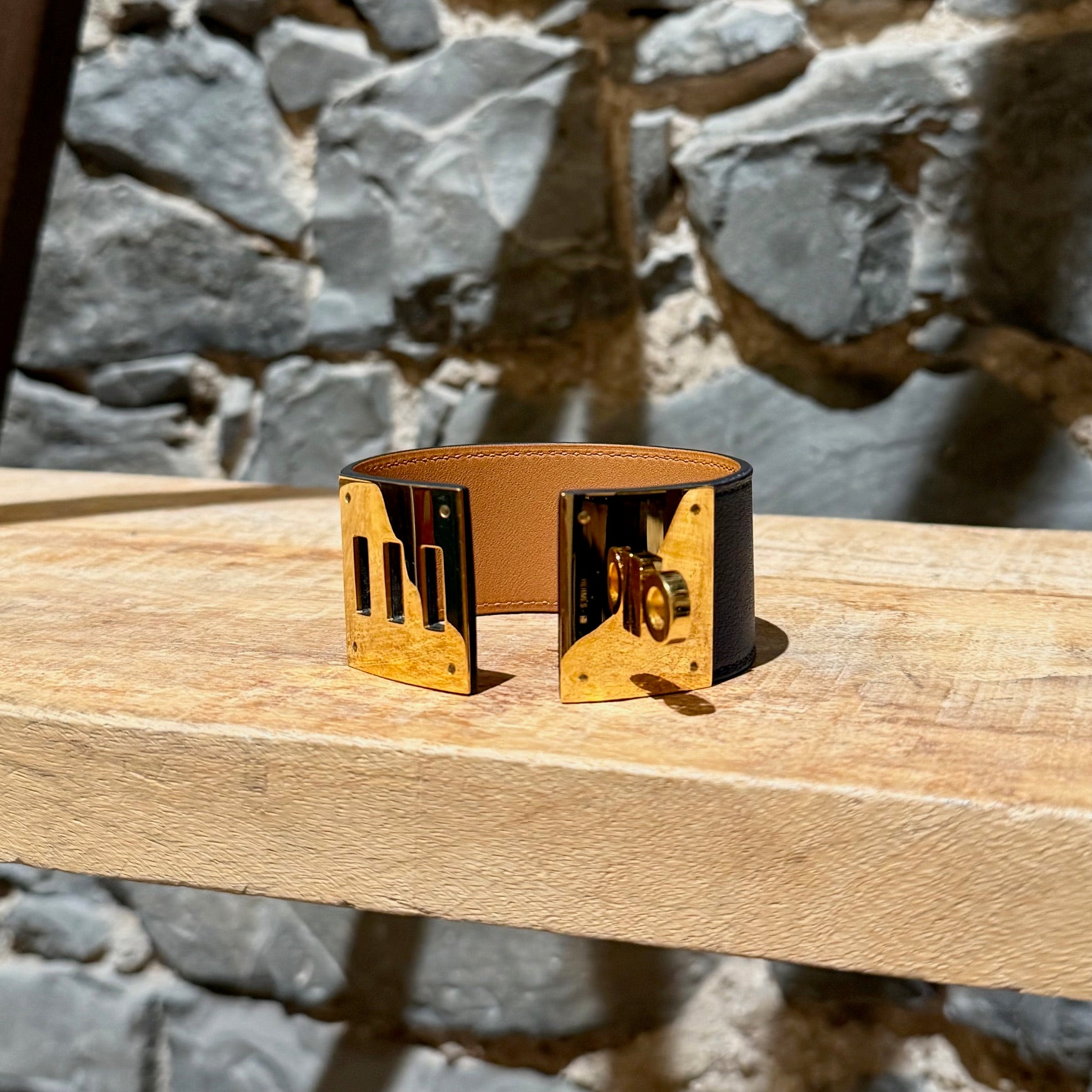 Cuir Swift lisse avec la fermeture iconique Kelly à tourniquet en métal plaqué or. Large manchette ajustable. Estampille Hermès Paris et poinçon R carré (2014). Fait en France. Livré avec boîte Hermès et pochette de protection.