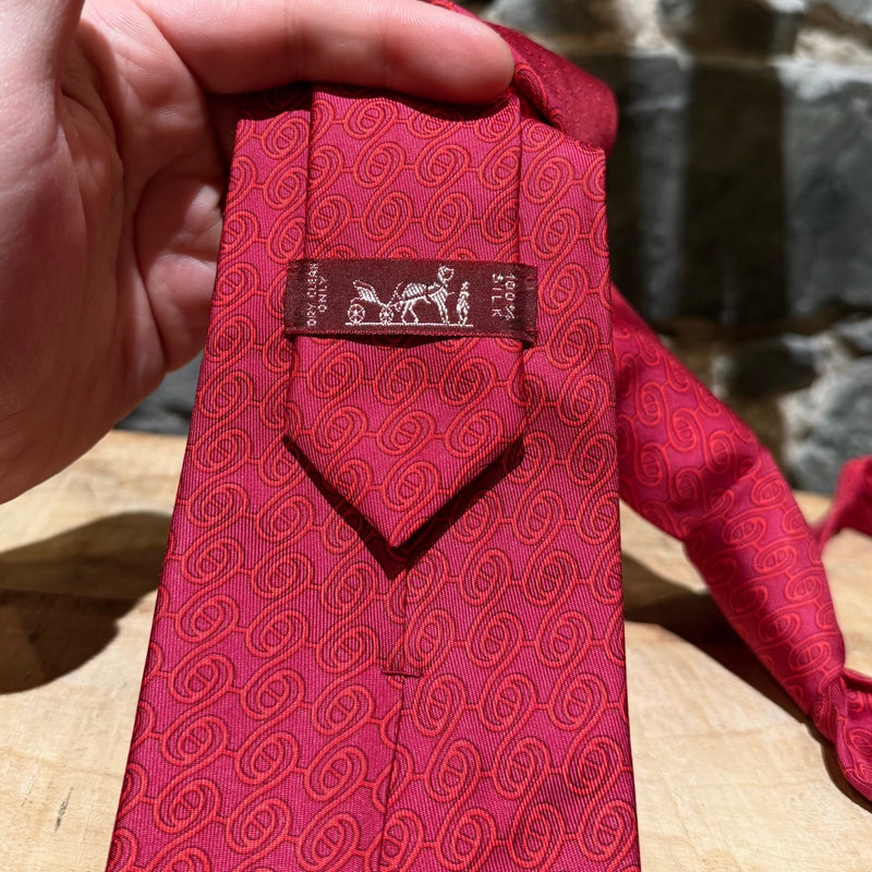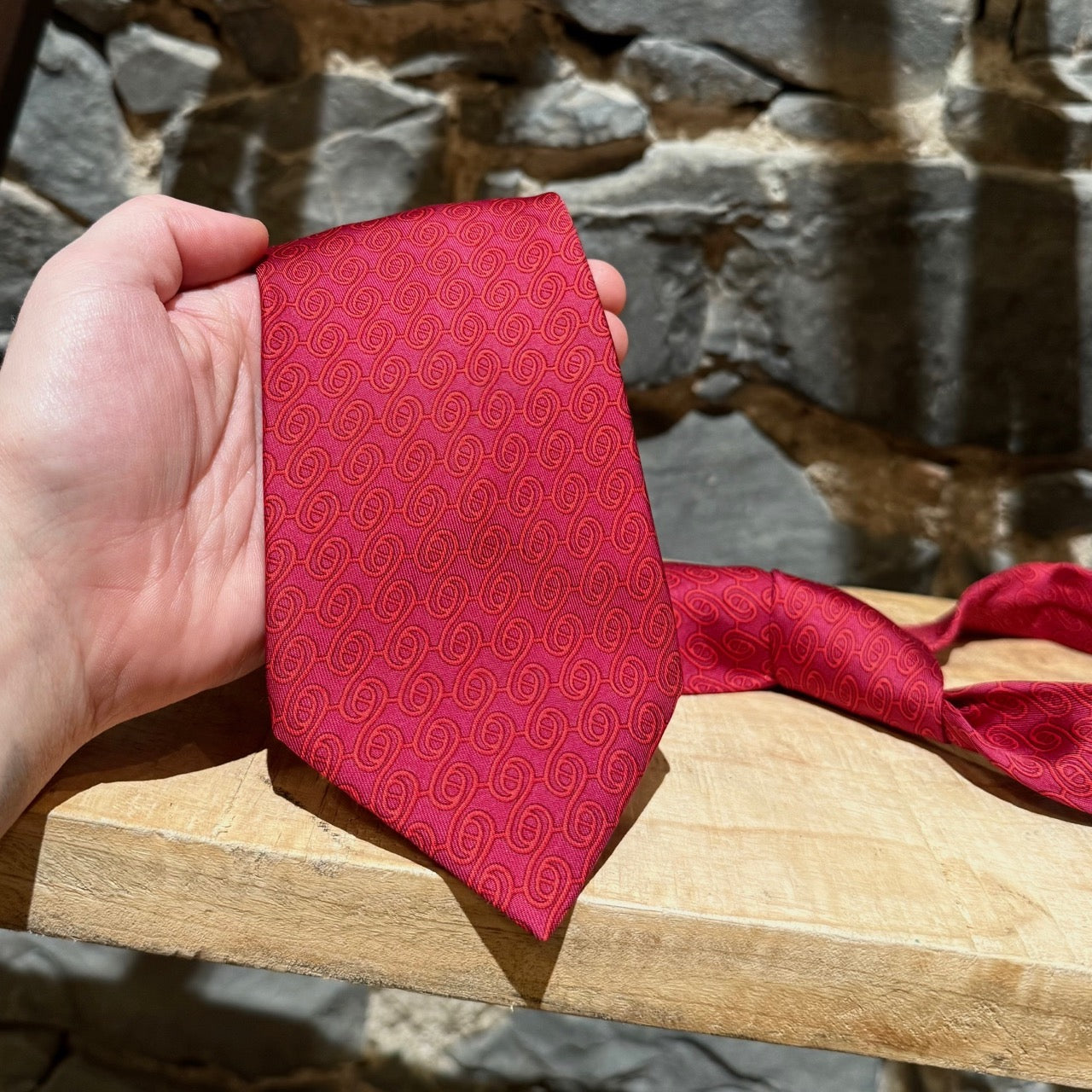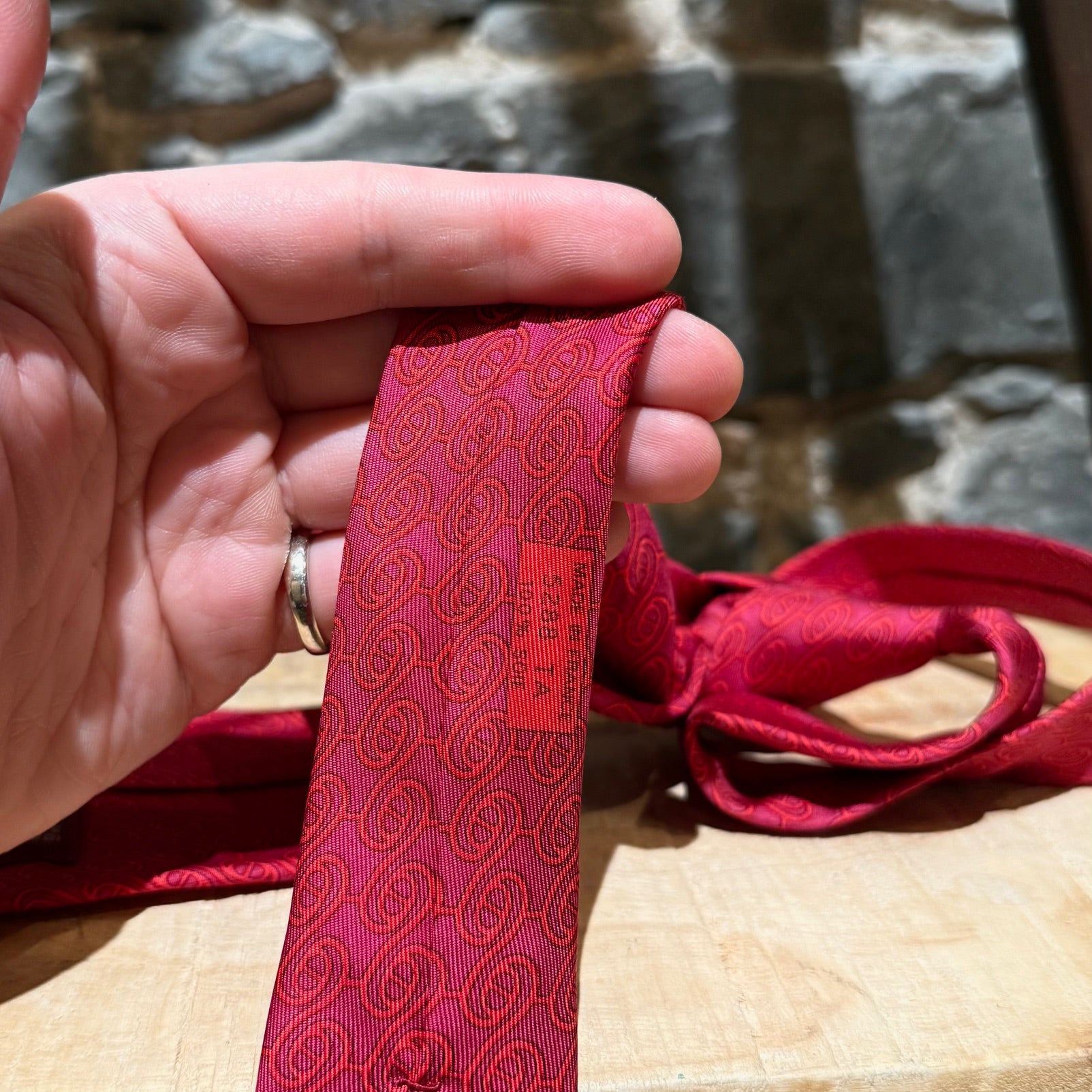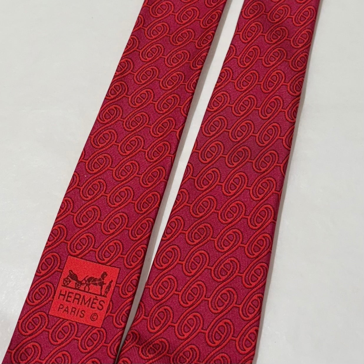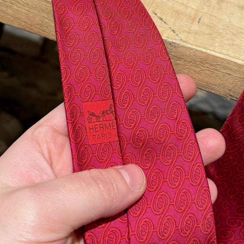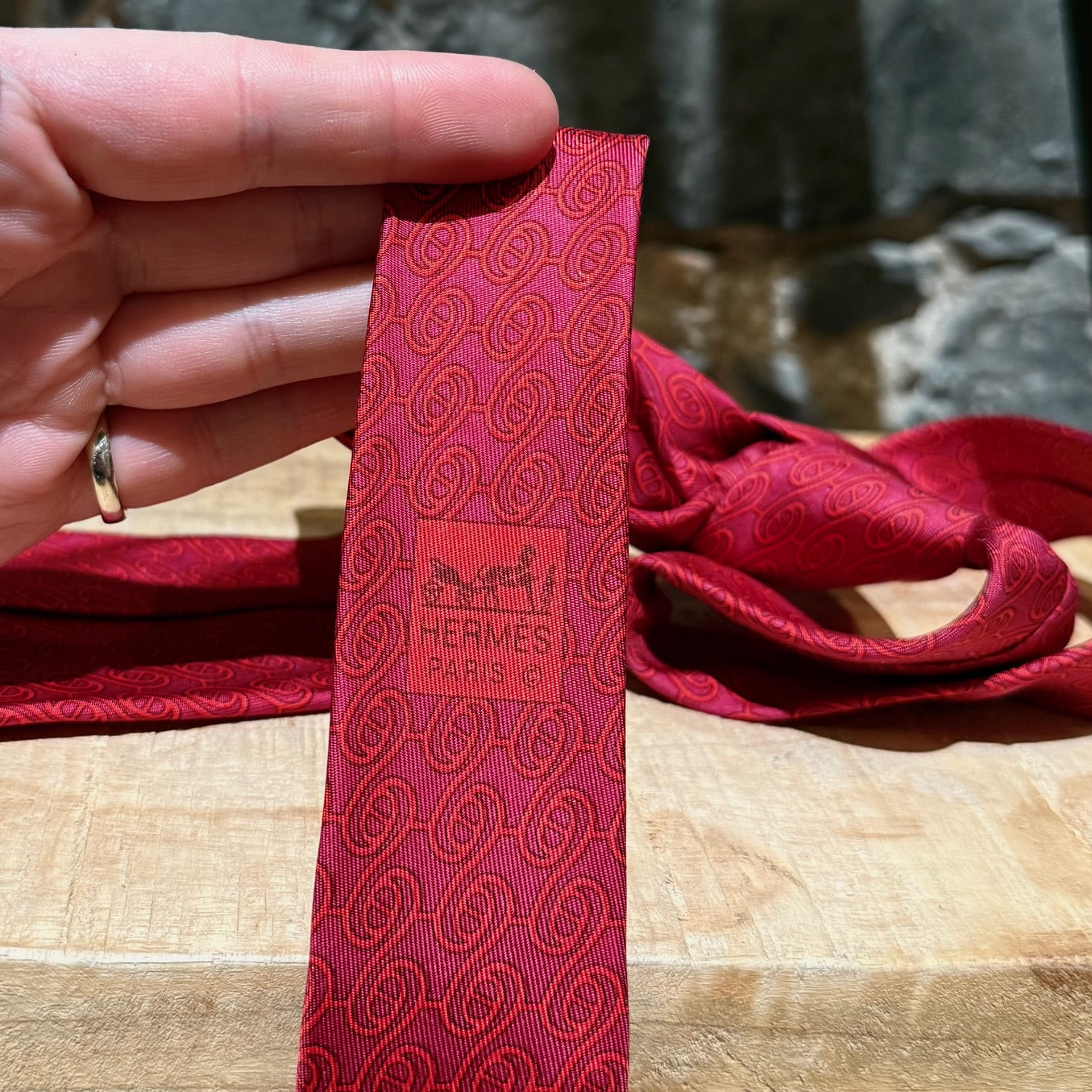 Cravate Hermès en soie rouge Swirl Chaine D'Ancre. Tissu en satin de soie. Motifs imprimés Chaine D'Ancre tourbillonnants rouges ton sur ton. Fabriquée en France. Livrée telle quelle.
