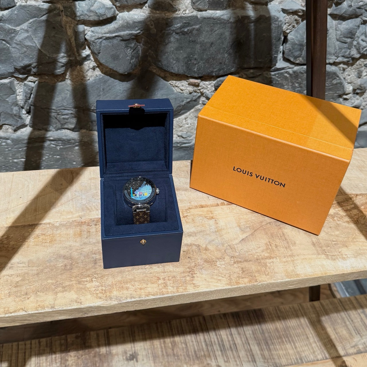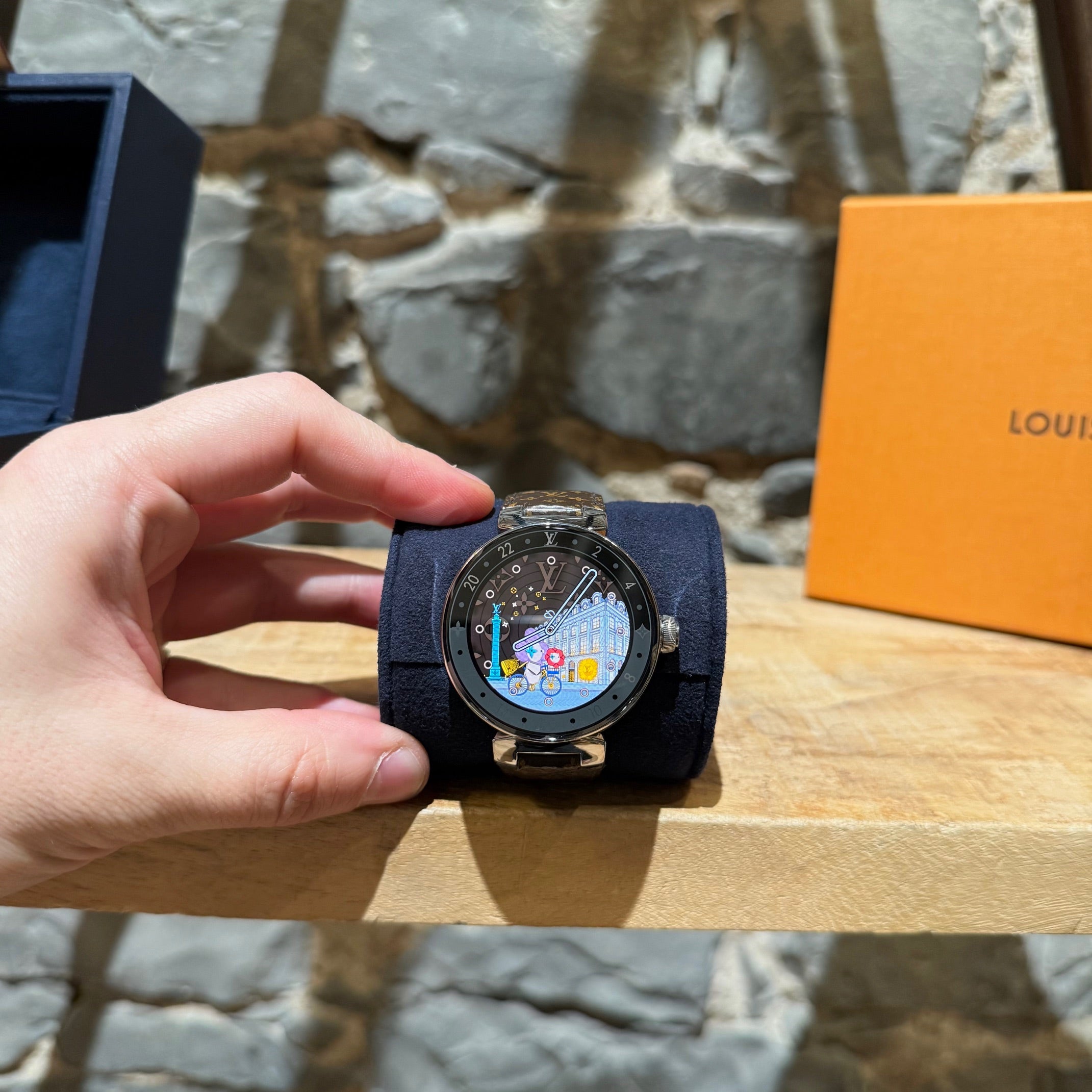 Boîtier rond en acier inoxydable argenté. Cadran tactile en cristal de saphir noir affichant une animation Vivienne Paris, avec écrans interchangeables. Lunette gravée Monogram noir et gris. Couronne gravée du logo LV. Téléchargez et ouvrez l’application Louis Vuitton pour accéder aux fonctionnalités. Application disponible sur App Store, Google Play Store et Tencent App Gem pour la majorité des utilisateurs. Livrée avec son emballage d’origine et accessoires : bracelet interchangeable en toile Monogram brun avec boucle ardillon gravée argentée Louis Vuitton, boîte bleue, livrets (dont le manuel d’instructions et la garantie), station de recharge avec câble USB, adaptateur secteur, pochette de protection en cuir pour la base de chargement, et sac poussière Louis Vuitton.
