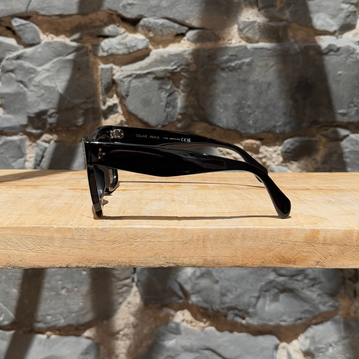 Square cat-eye silhouette in glossy black acetate. Celine’s signature triple-dot rivets at front corners and branches. Gradient grey polarized lenses offer UV protection and reduce glare. Made in Italy. Come with original box, case, documentation, and cleaning cloth.