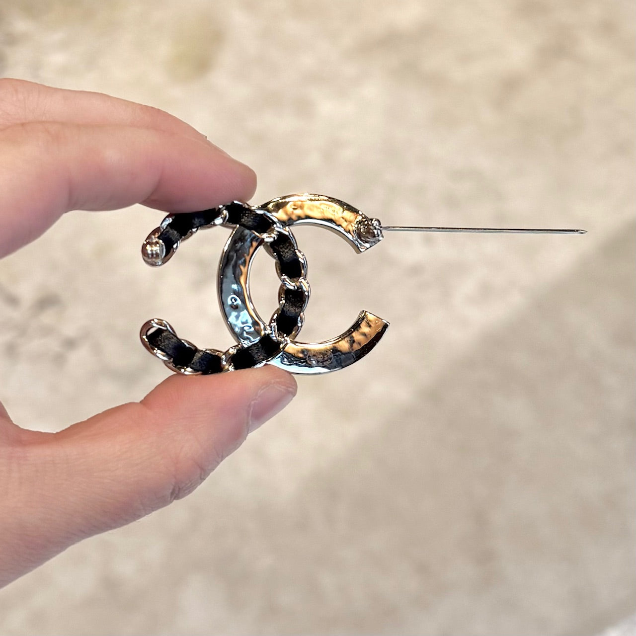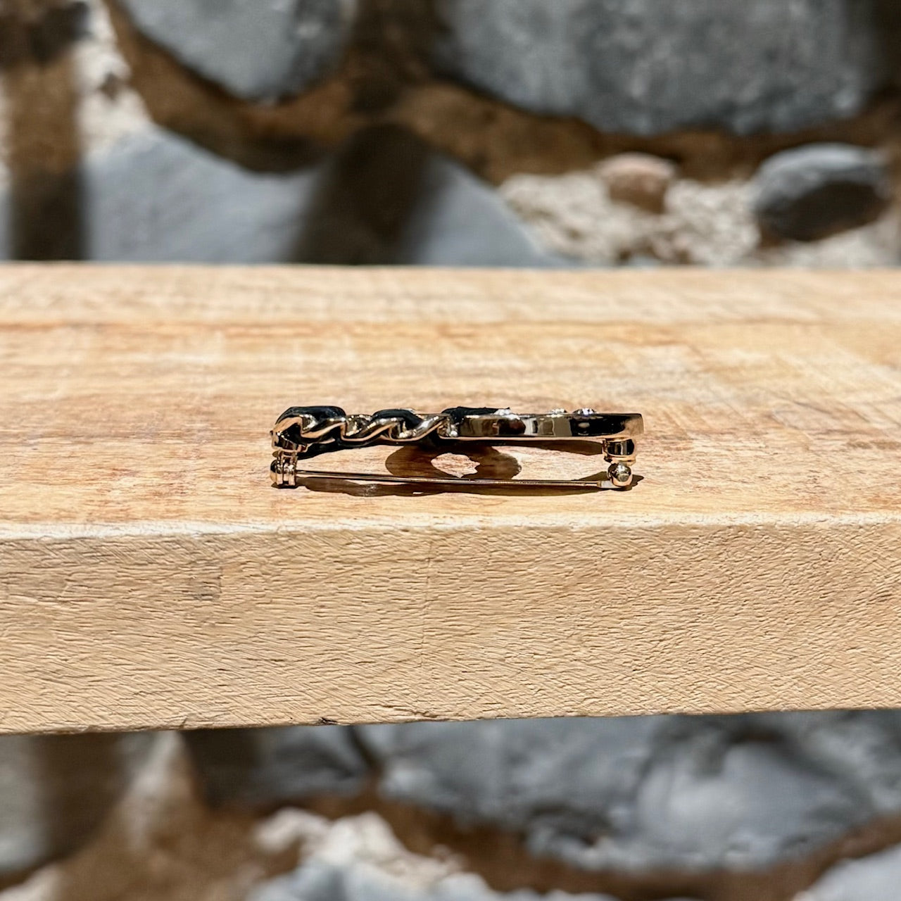 From the 2019 collection. Light gold-tone metal with black leather-woven chain detail. Brand lettering with crystals set between each letter. Signature interlocking CC logo. Bar pin at back with hinged clasp. Date stamp at back. Made in Italy. Comes with Chanel box and pouch.