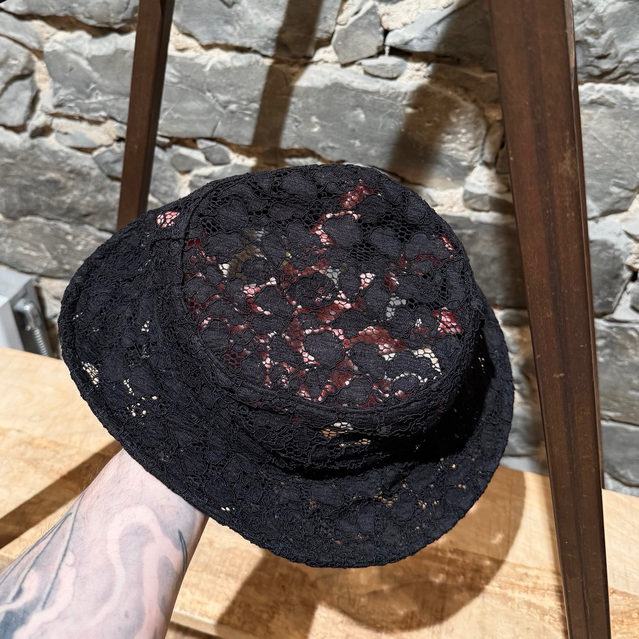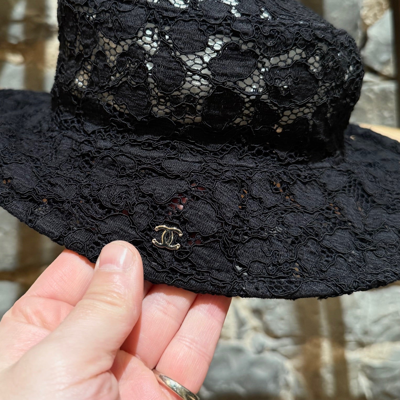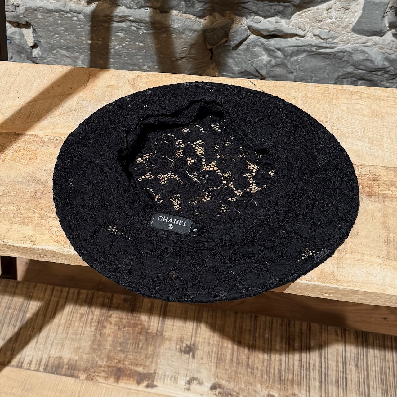 Chanel 2021 Coco Beach Black Lace Hat. Black floral lace. Rounded crown and short, structured brim. Small silver-tone CC logo at the front. Made in France. Comes as is.