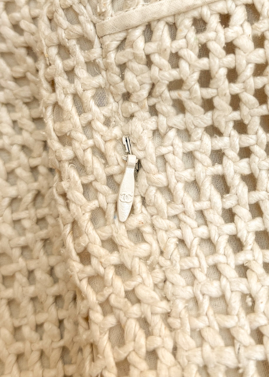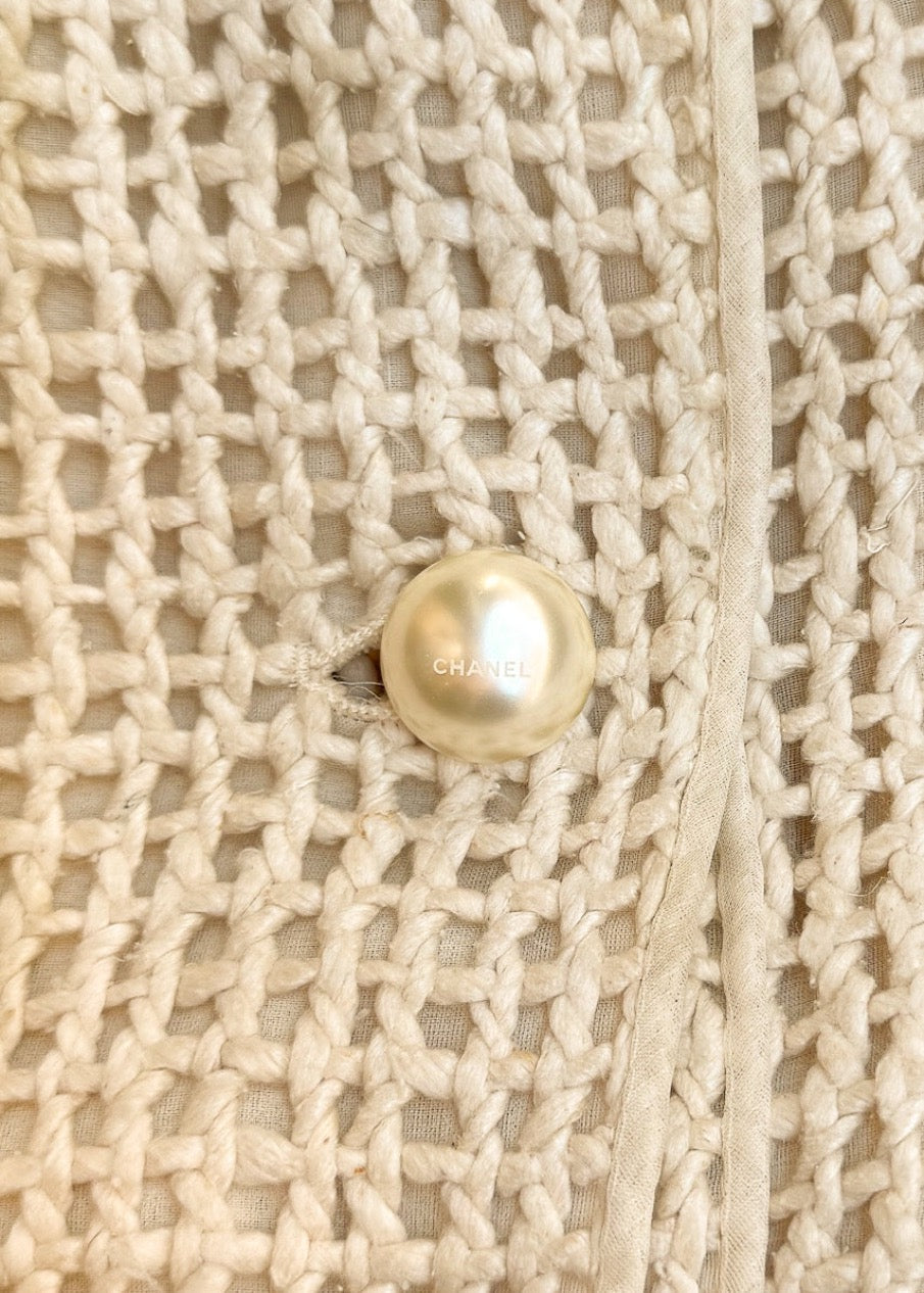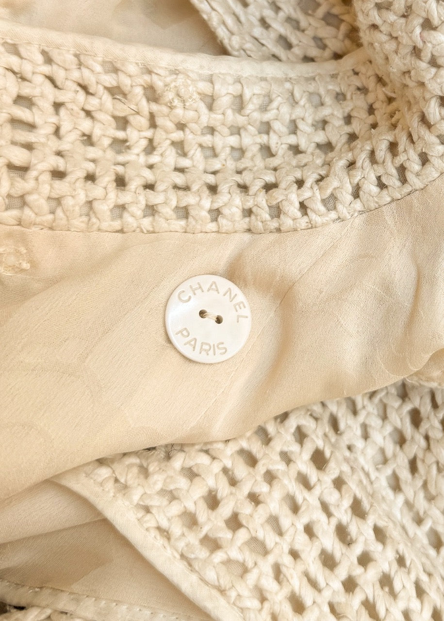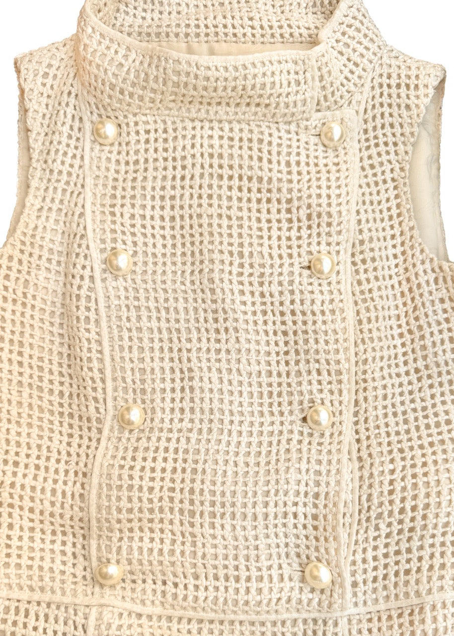 Runway look 23 from the 2013 Spring Summer collection. Mini dress. Ivory open knit construction with a structured sleeveless silhouette and A-line shape. Double-breasted design with signature Chanel engraved pearl buttons. Fold-over stand neckline. Fully lined in tonal silk with camellia jacquard motifs. Side zipper closure. Made in France.