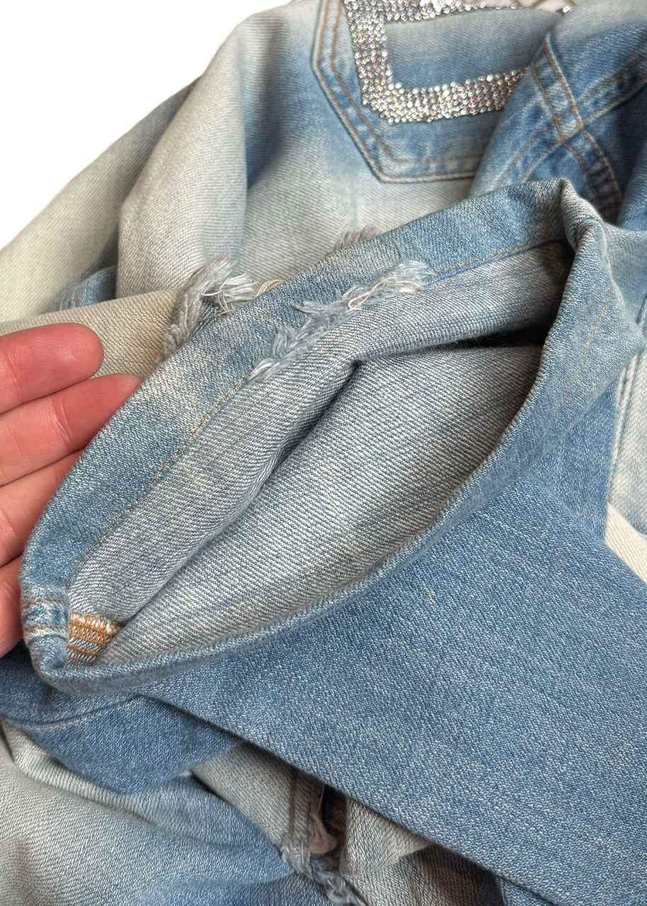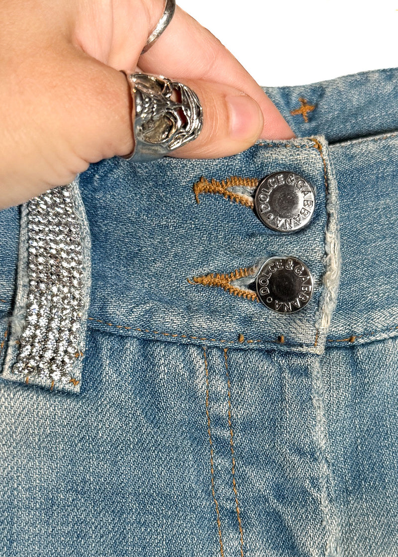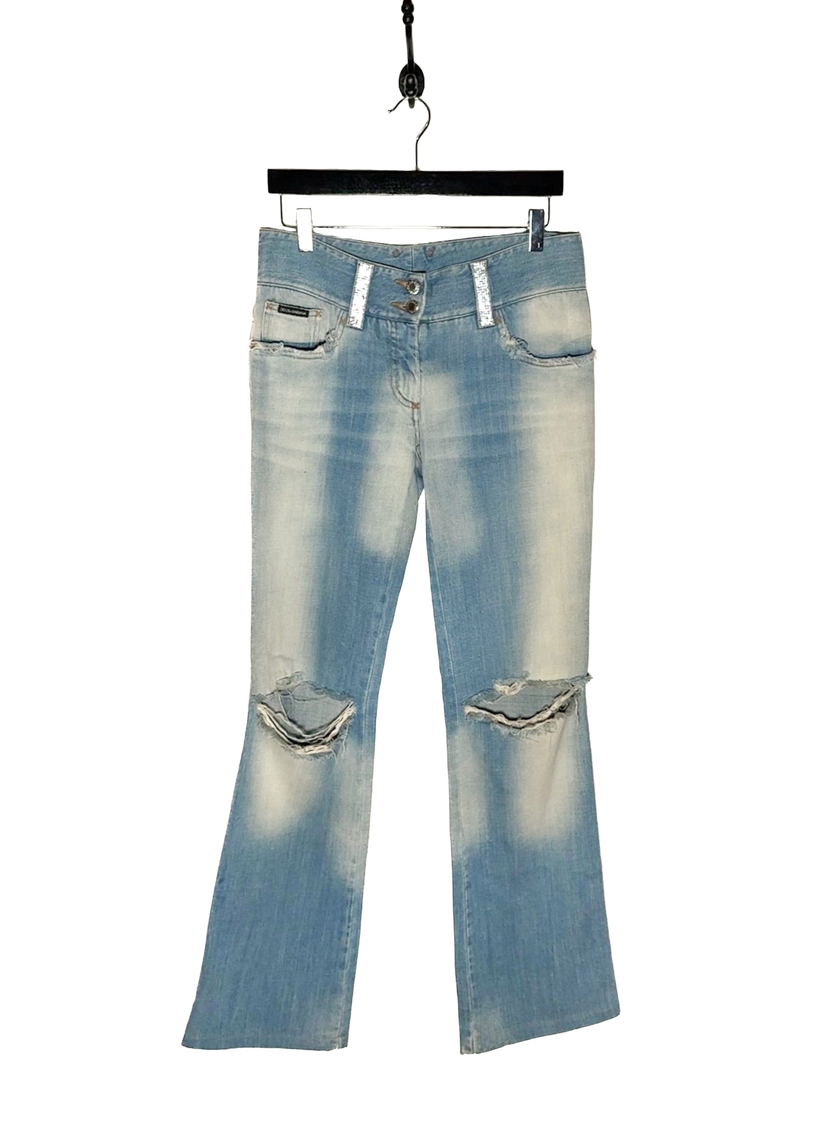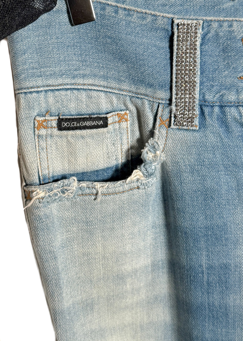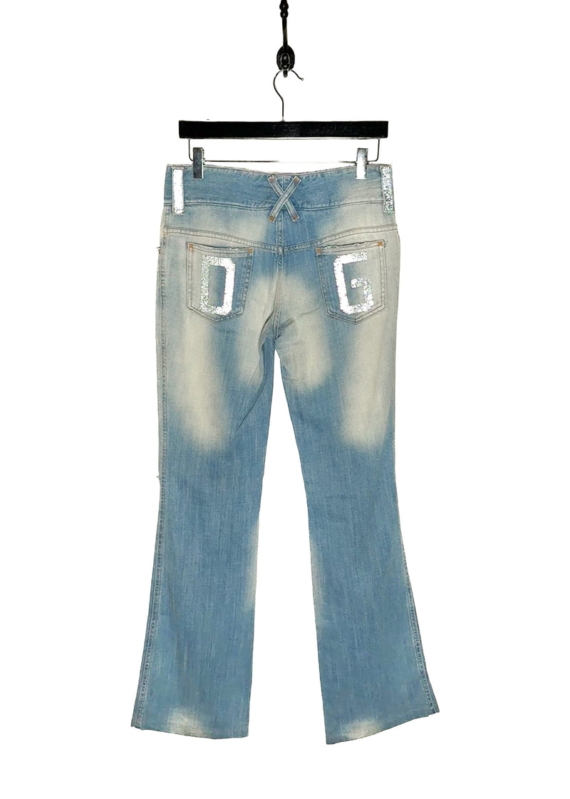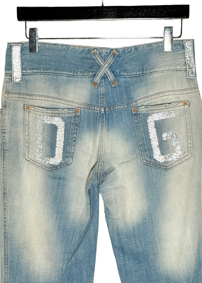Dolce & Gabbana Vintage SS03 Rhinestone DG Pockets Blue Jeans. From the Spring Summer 2003 collection. Vintage piece. Distressed light blue denim with flared leg. Holes at knee level. Signature rhinestone-embellished DG letters on back pockets. Crystal-studded belt loops. Low waisted. Double-button and zip fly closure engraved with logo. Classic five-pocket design. Faint whiskering and faded thigh detailing. Made in Italy.