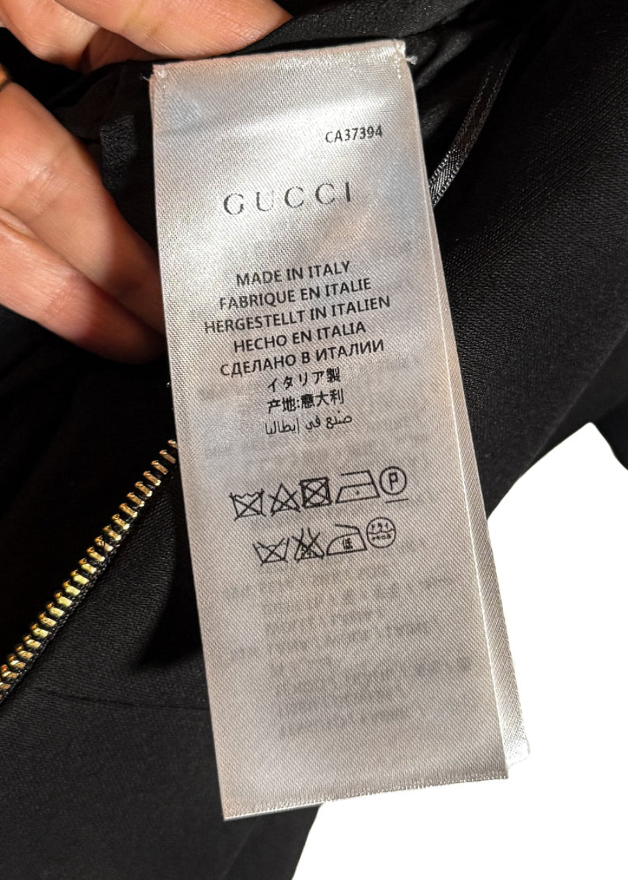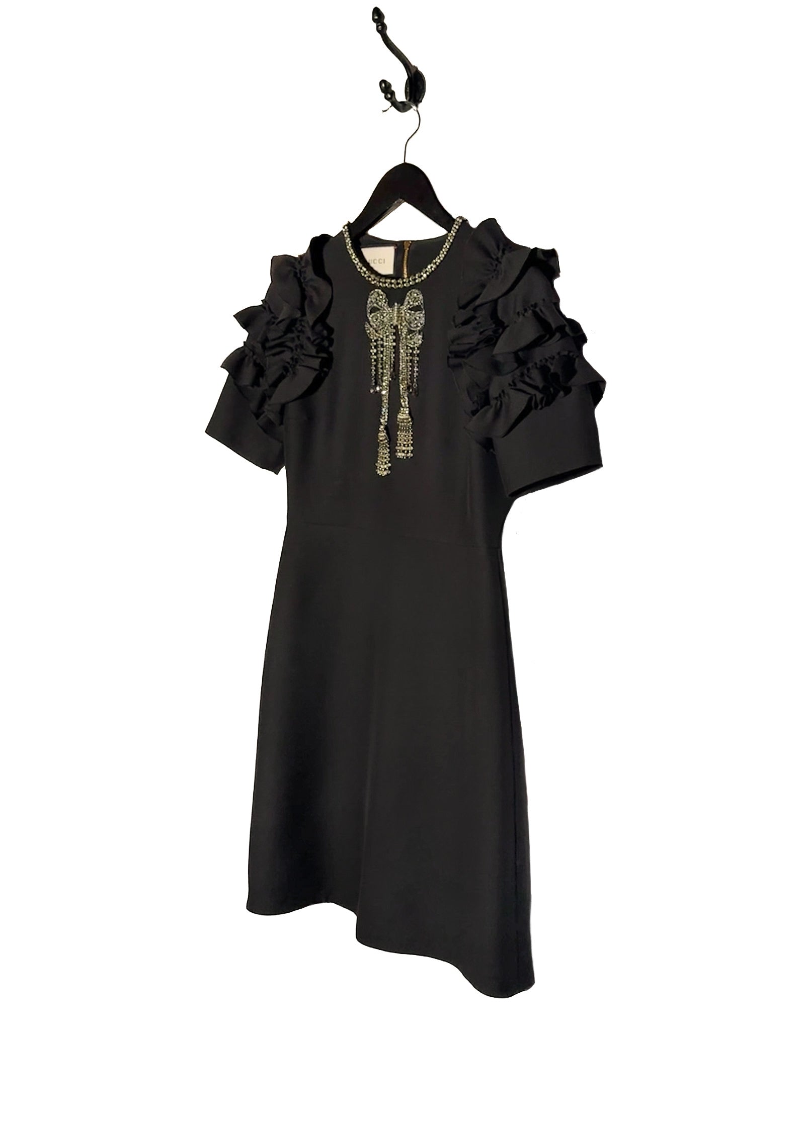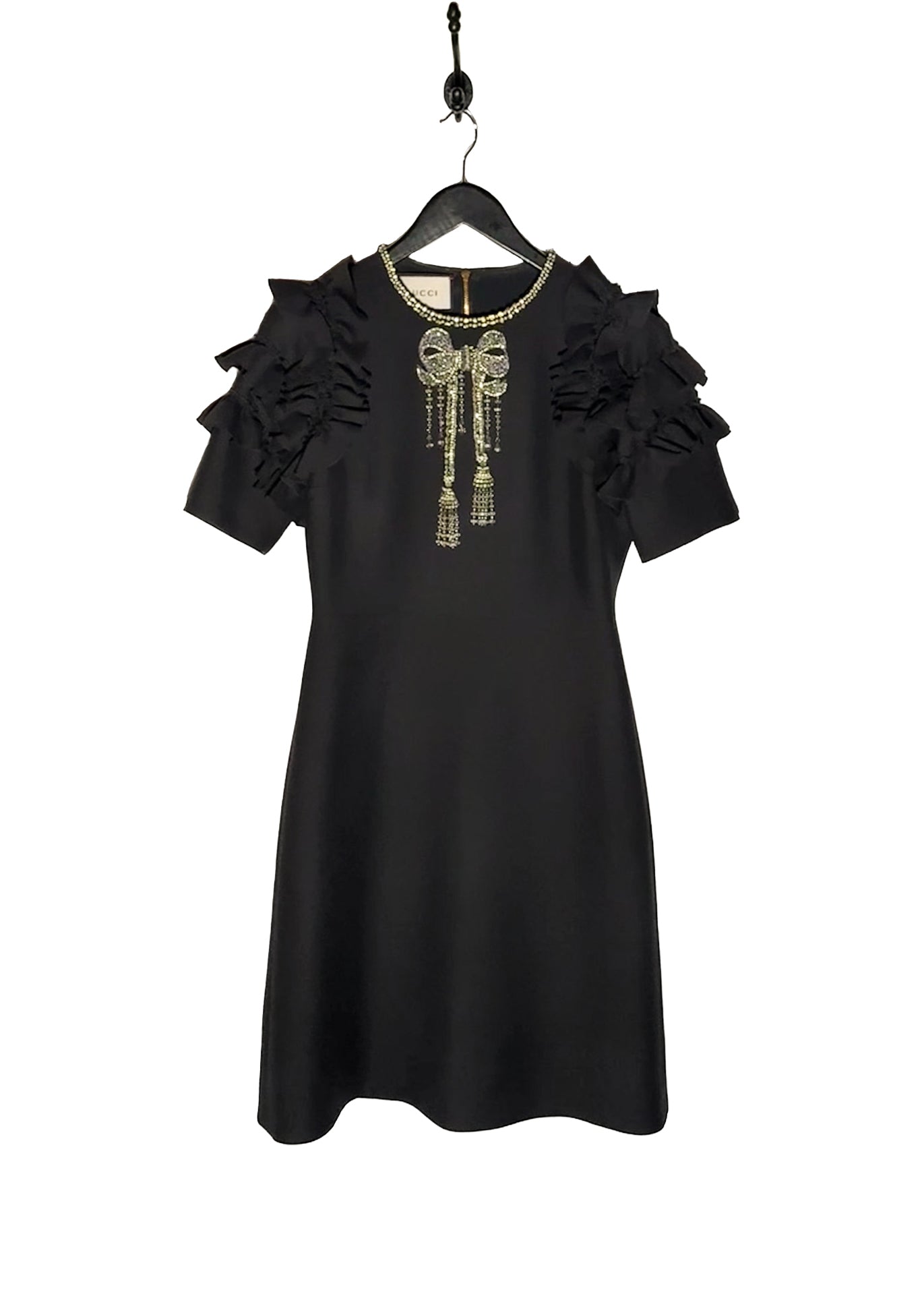 Gucci 2016 Embellished Bow Ruffled Sleeves Black Mini Dress. Fitted silhouette with flare bottom. Multi layered ruffle sleeves. Crew neckline embellished with a row of clear crystals and white pearls. Large crystal bow applique embroidered with faux pearls and beading. Hanging strands at front. Exposed gold-tone back zipper with signature Gucci ring pull. Lined. Made in Italy.