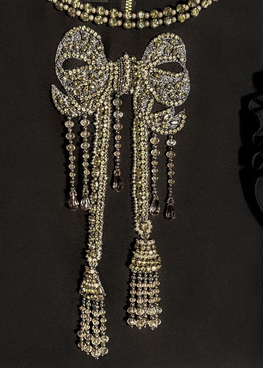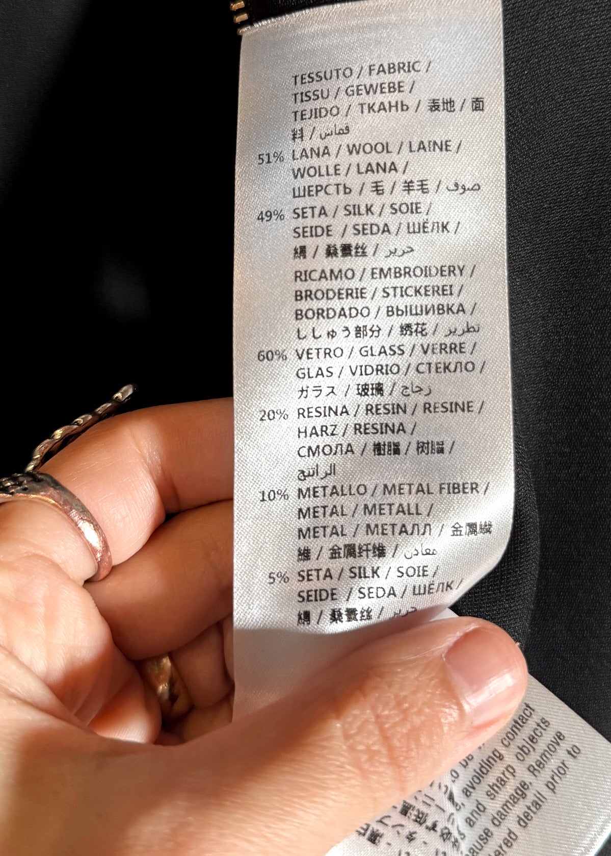 Embroidery: 60% glass, 20% resin, 10% metallic fiber, 5% silk, 3% cotton, 2% polyester.CARE: Dry clean only.