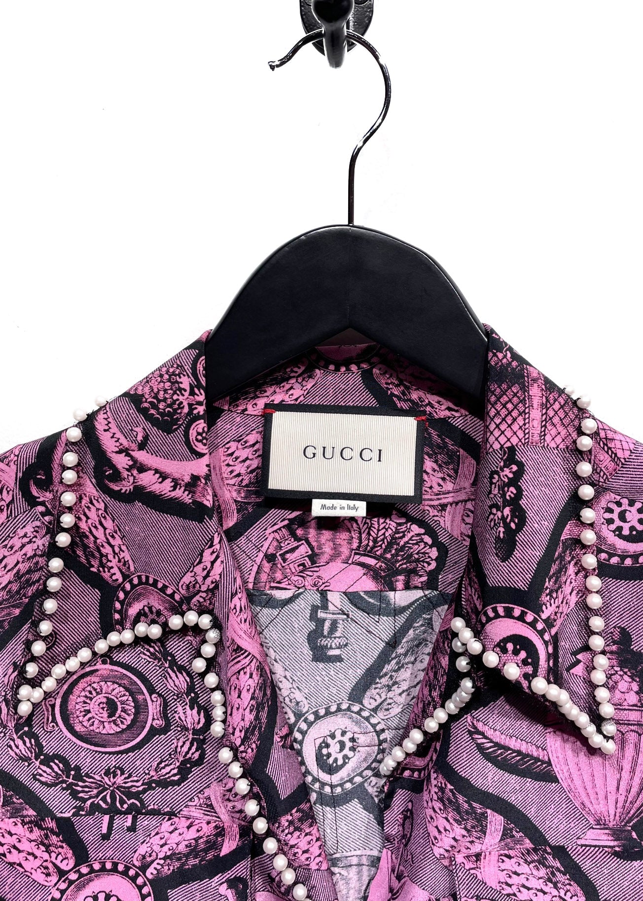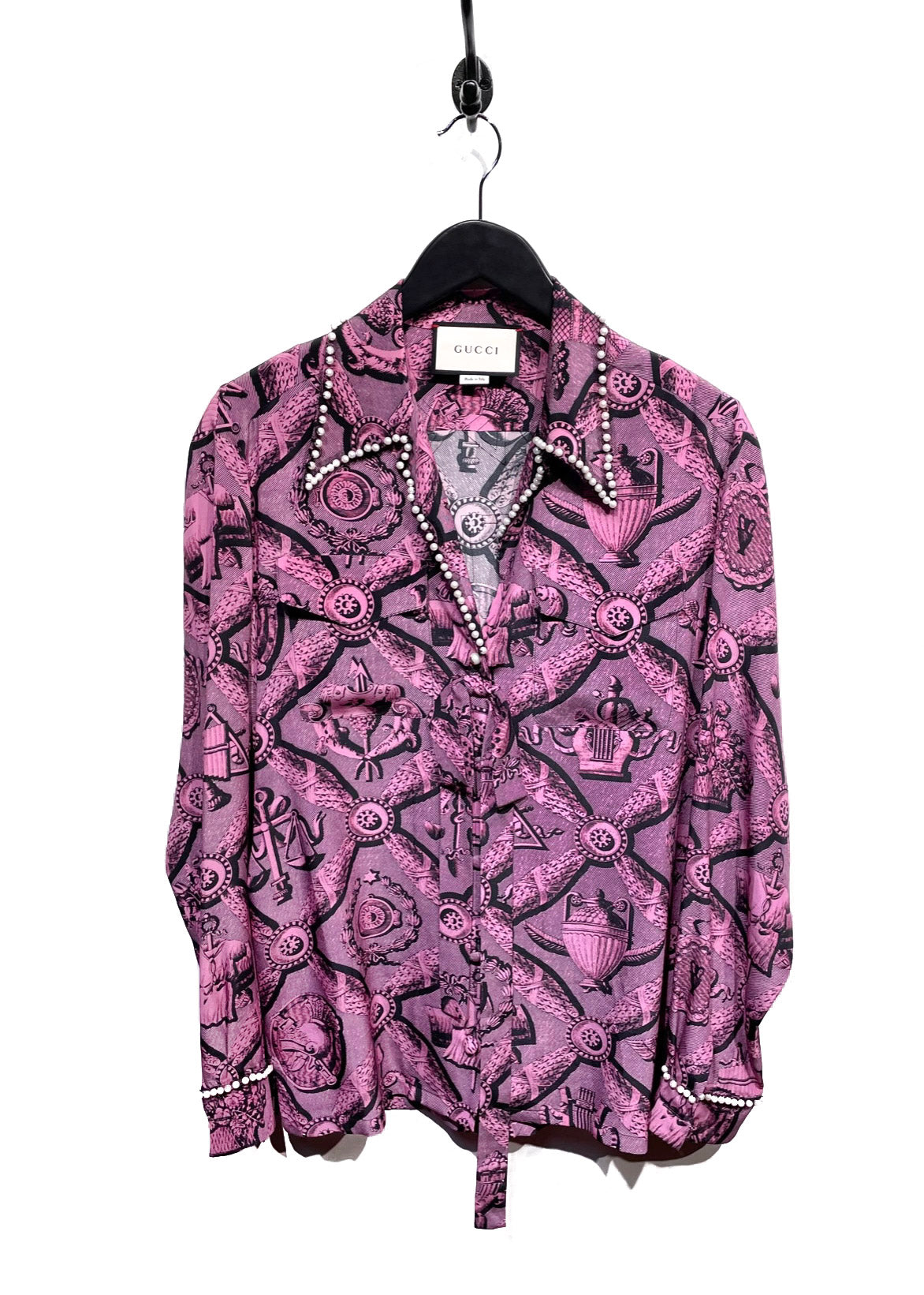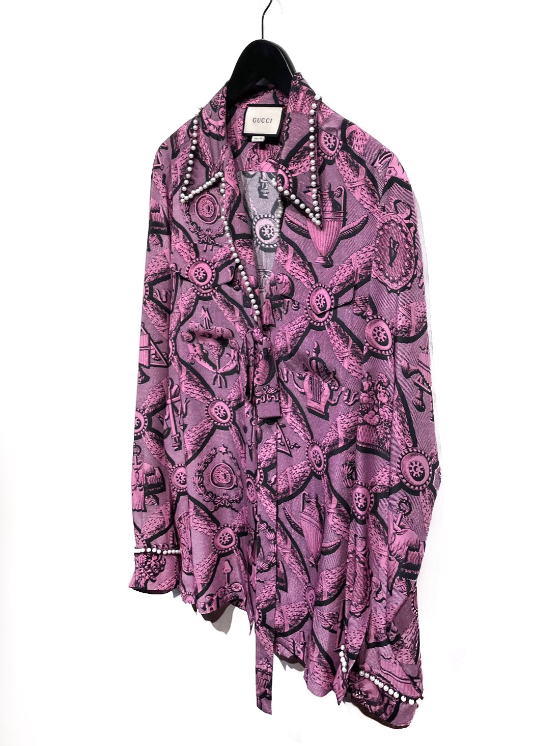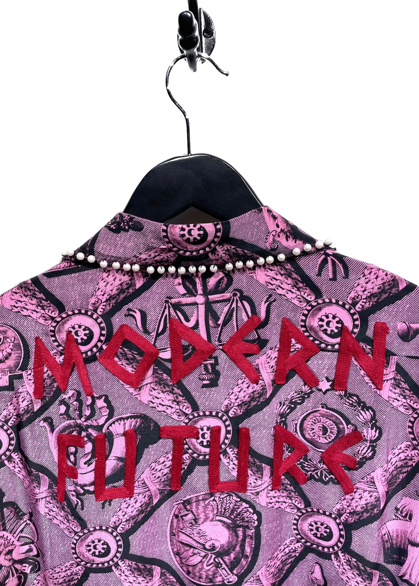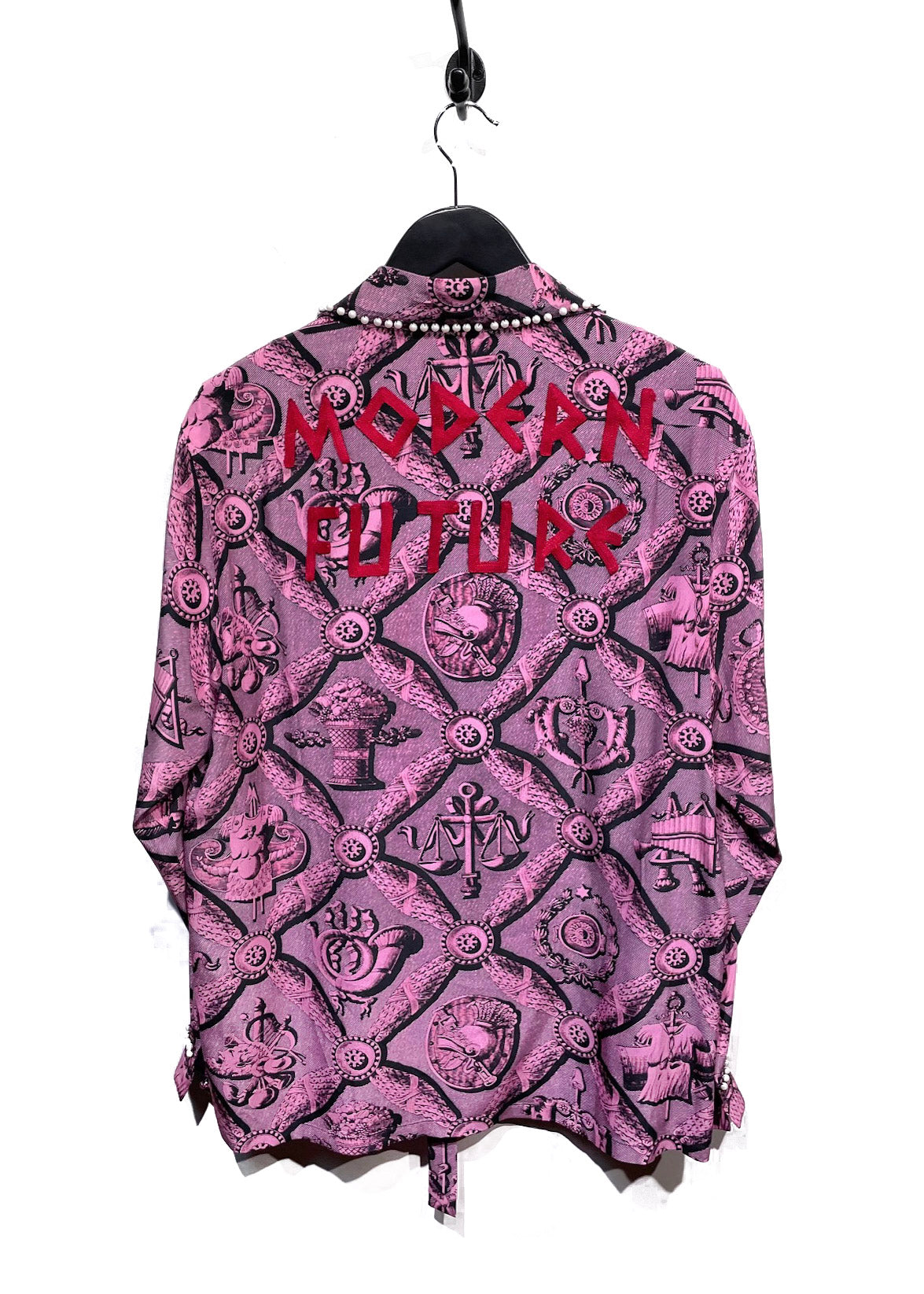 Silk satin. White faux pearl accents at collar and cuffs. V-neckline. Long sleeves. Button front closure. "Modern Future" appliqué in red at back. Made in Italy.