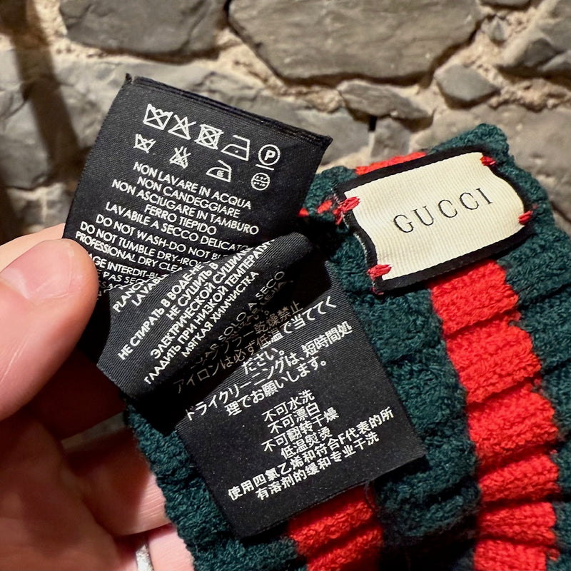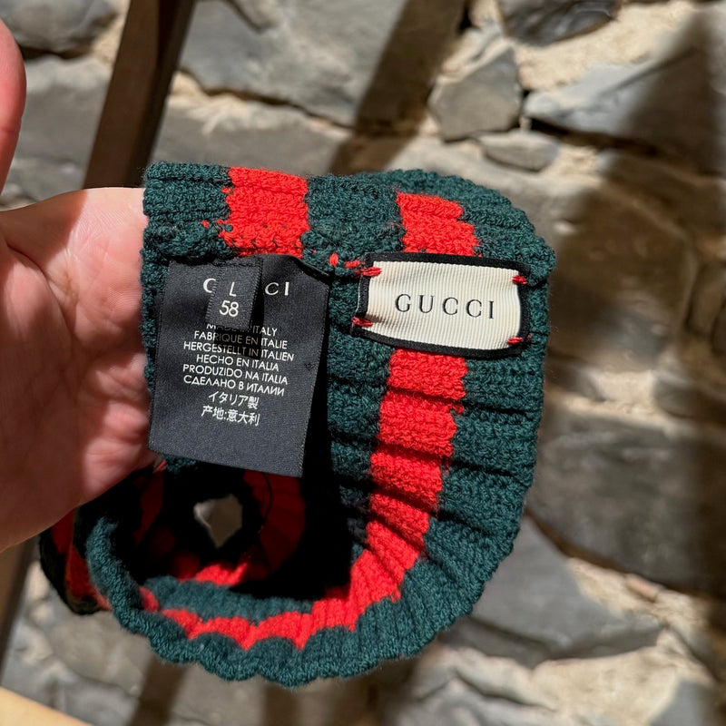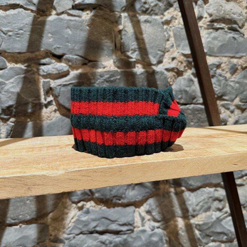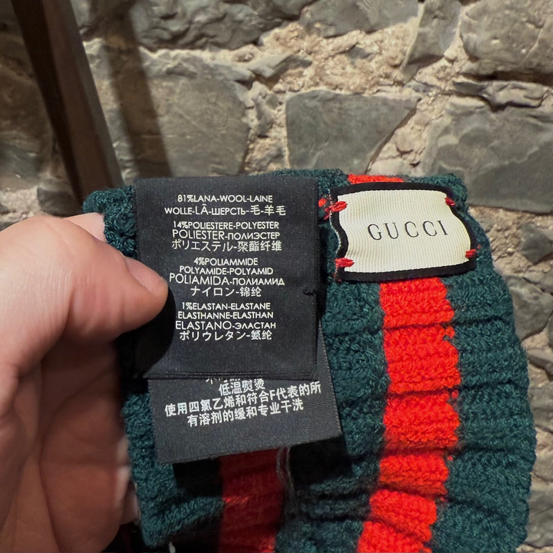 Gucci Green Red Web Knit Headband. Made from ribbed stretch knit wool. Features green and red Web stripes. Center twist detail at the front. Made in Italy. Comes as is.