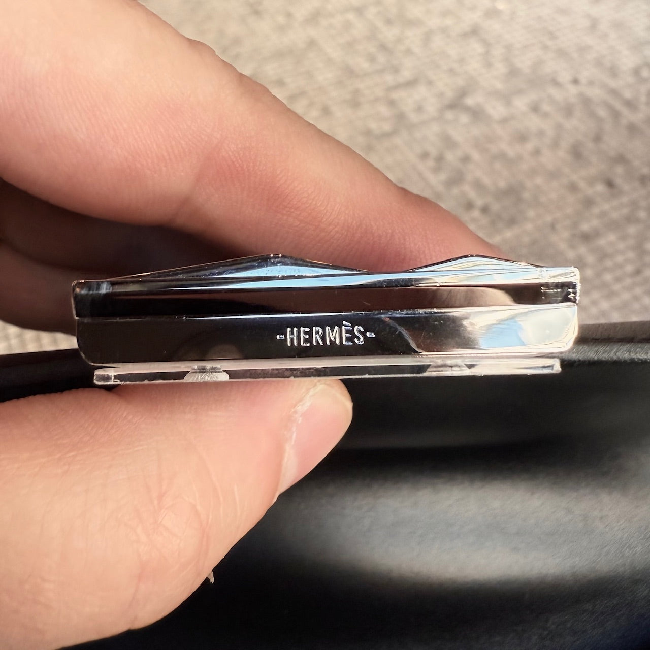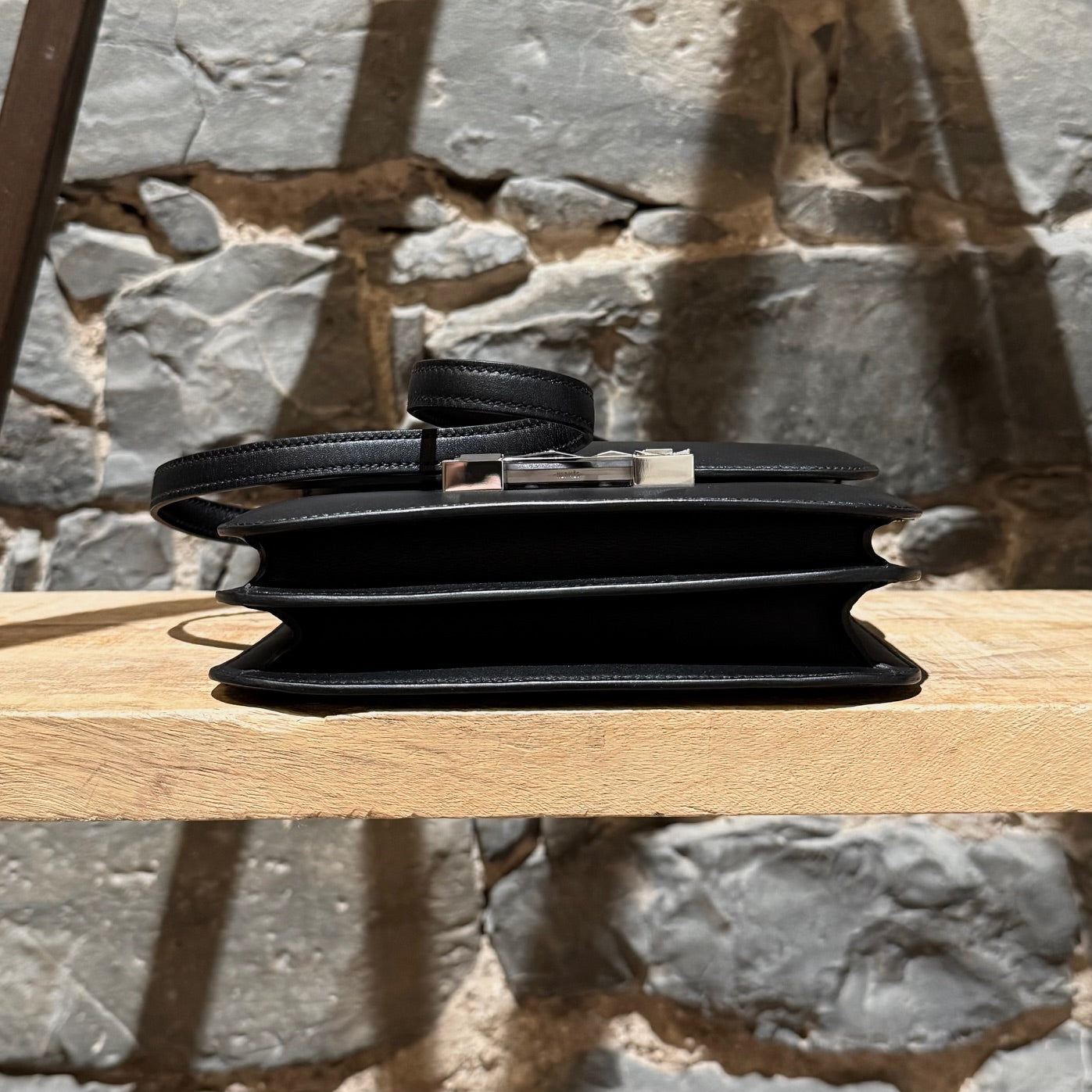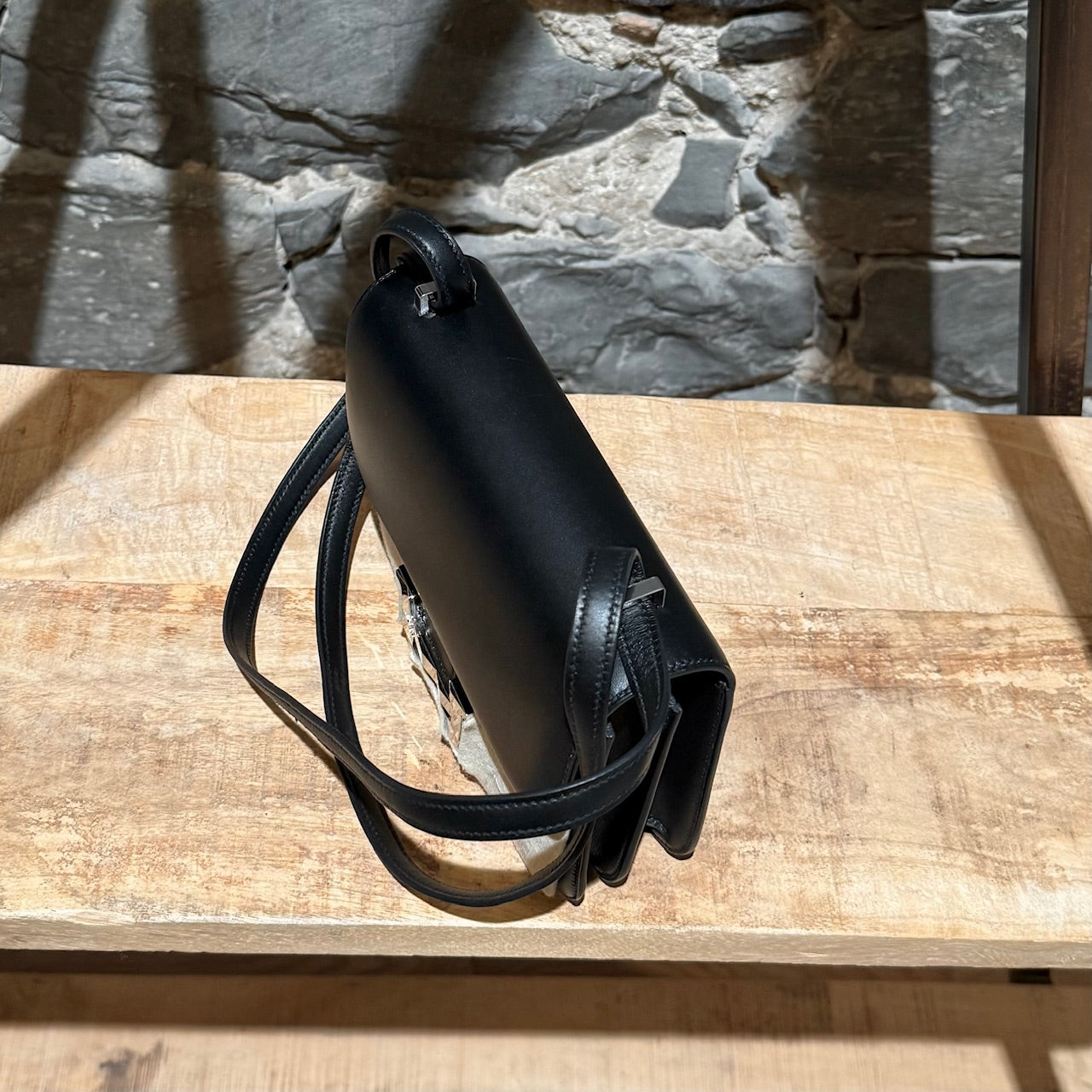Limited edition from 2021 - Z stamp. Crafted in black Veau Monsieur leather with a structured silhouette. Palladium-plated Studio Disco H clasp featuring mirrored 3D geometric inlays. Long leather sliding strap for shoulder or crossbody wear. Two (2) interior compartments with central divider and slip pockets. Back panel and side gussets finished in smooth leather with reinforced edges. Made in France. Comes with original Hermès blue interior box, dustbag, felt protector, and purchase receipt.