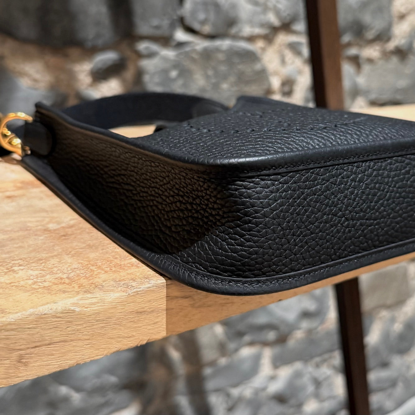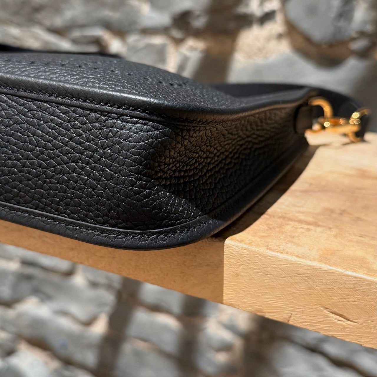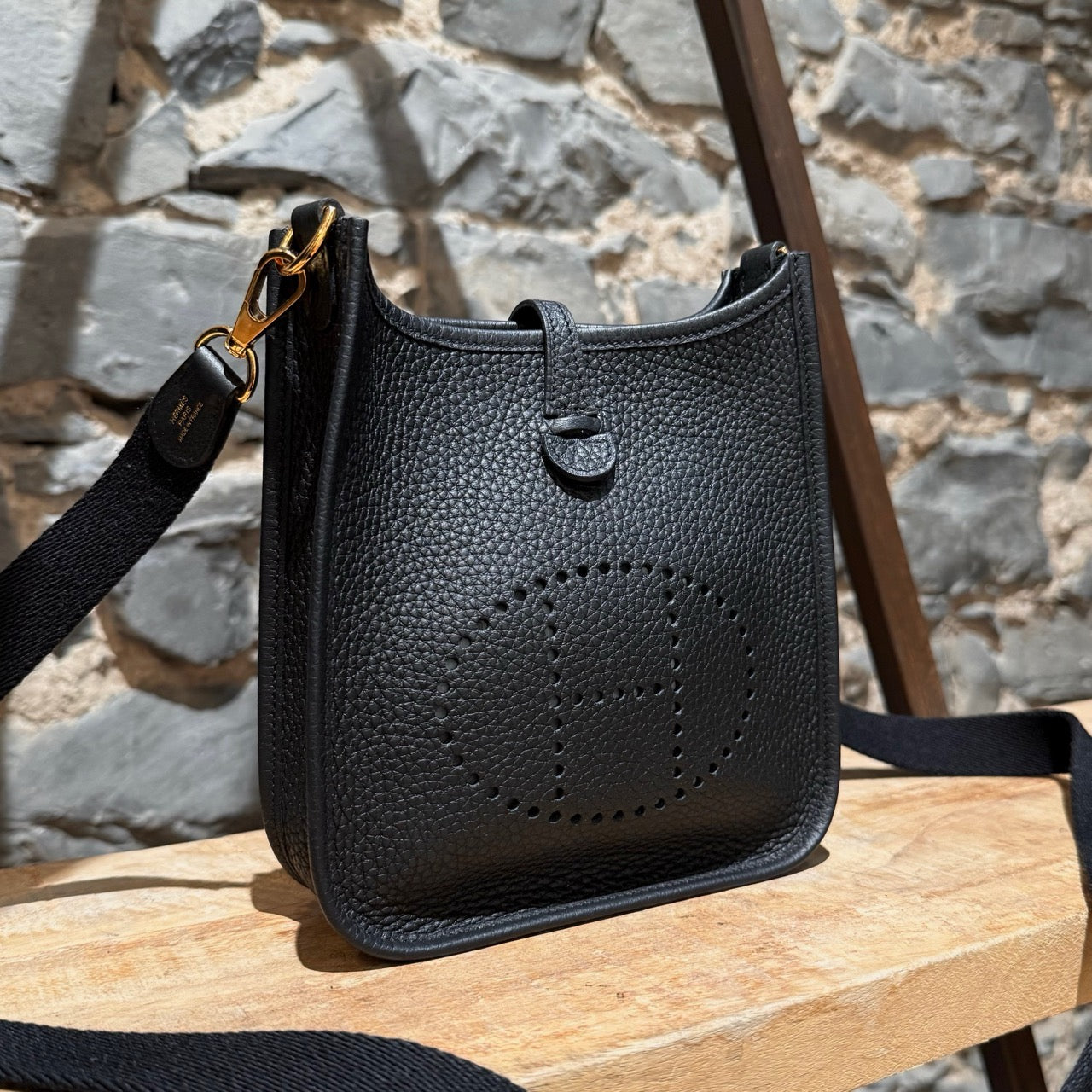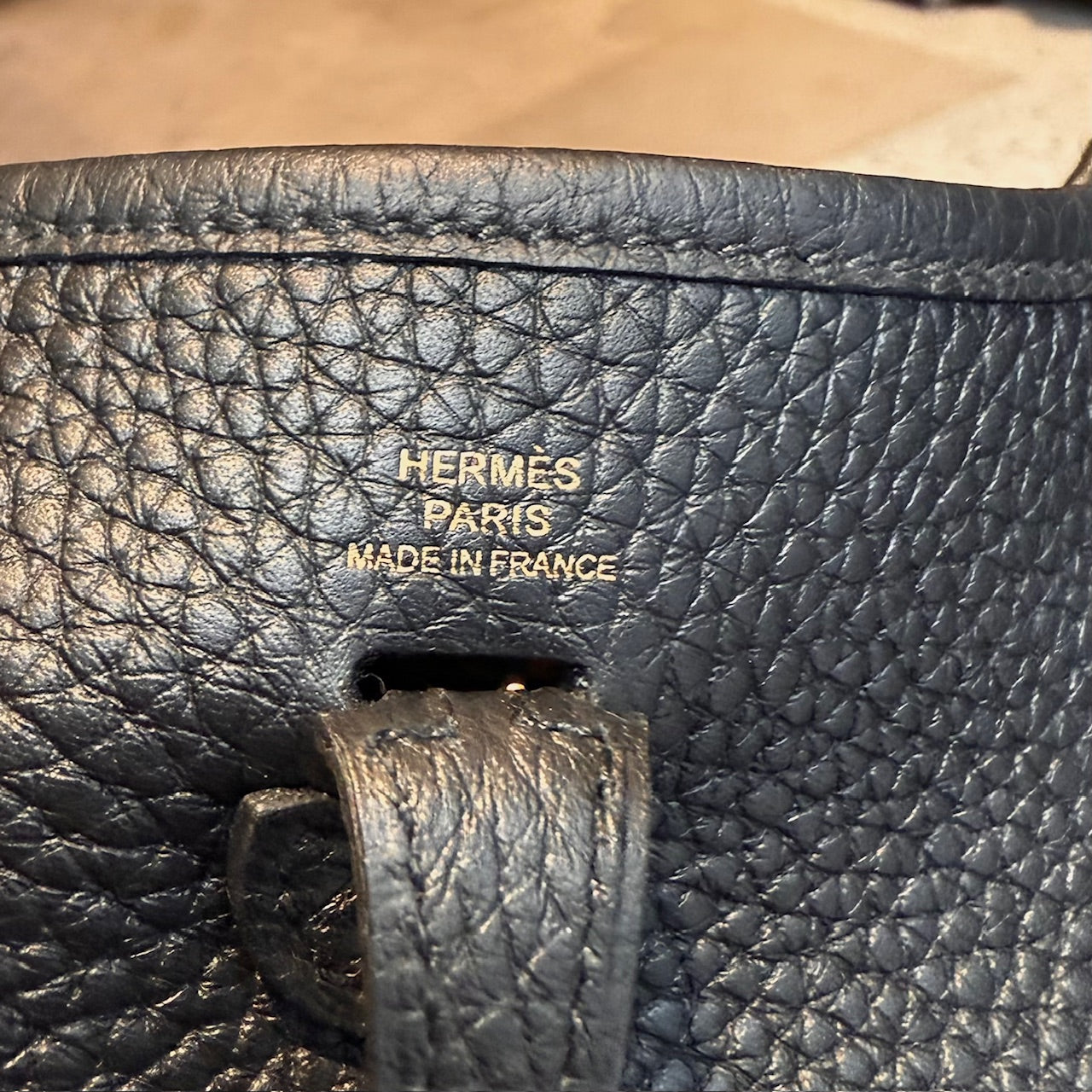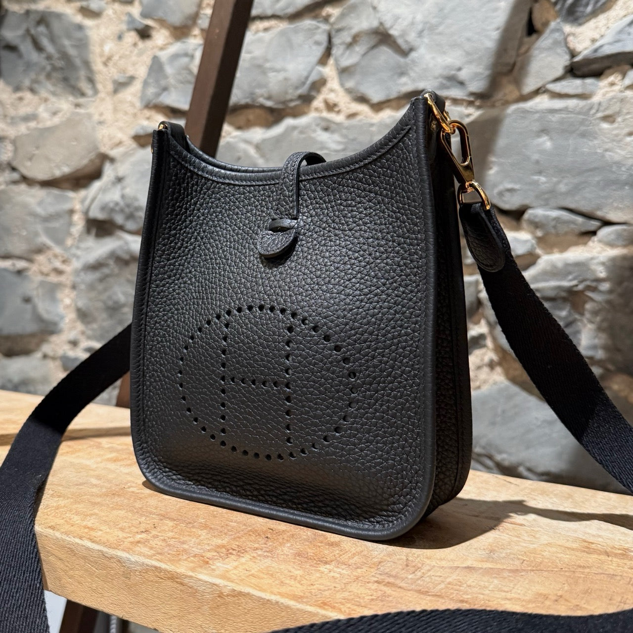 Grained taurillon leather with a structured yet supple finish. Compact design. Perforated “H” motif at front. Leather tab with snap button closure. Removable black canvas shoulder strap with leather trims. Branded gold plated hardware. Single main compartment. Tonal suede interior. Made in France. Date stamp U - 2022. Comes with Hermès box, dustbag, care booklet, and purchase receipt.
