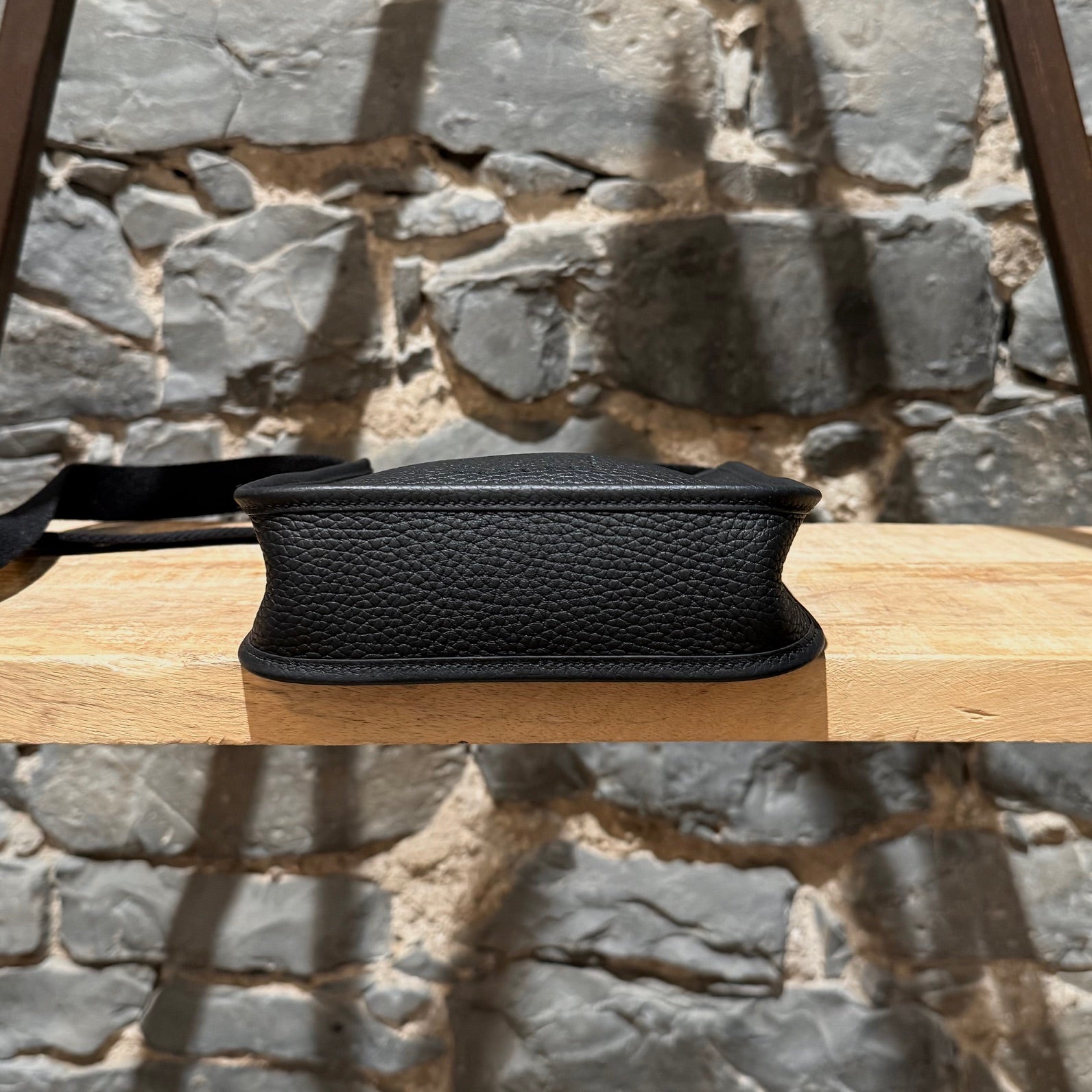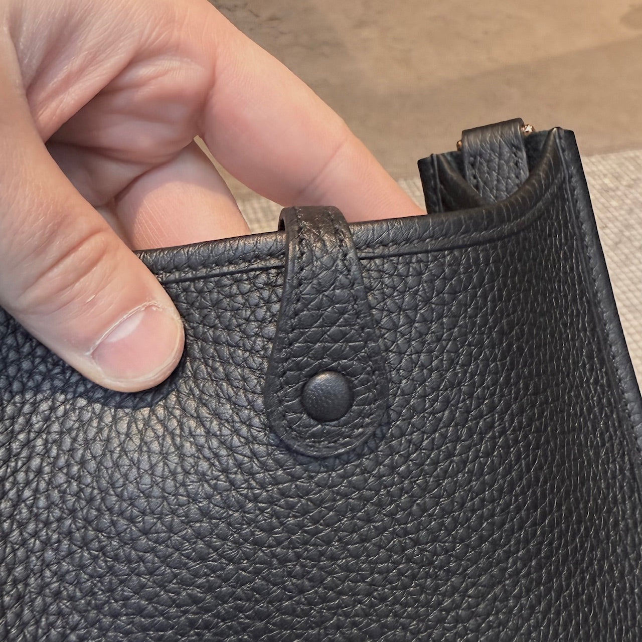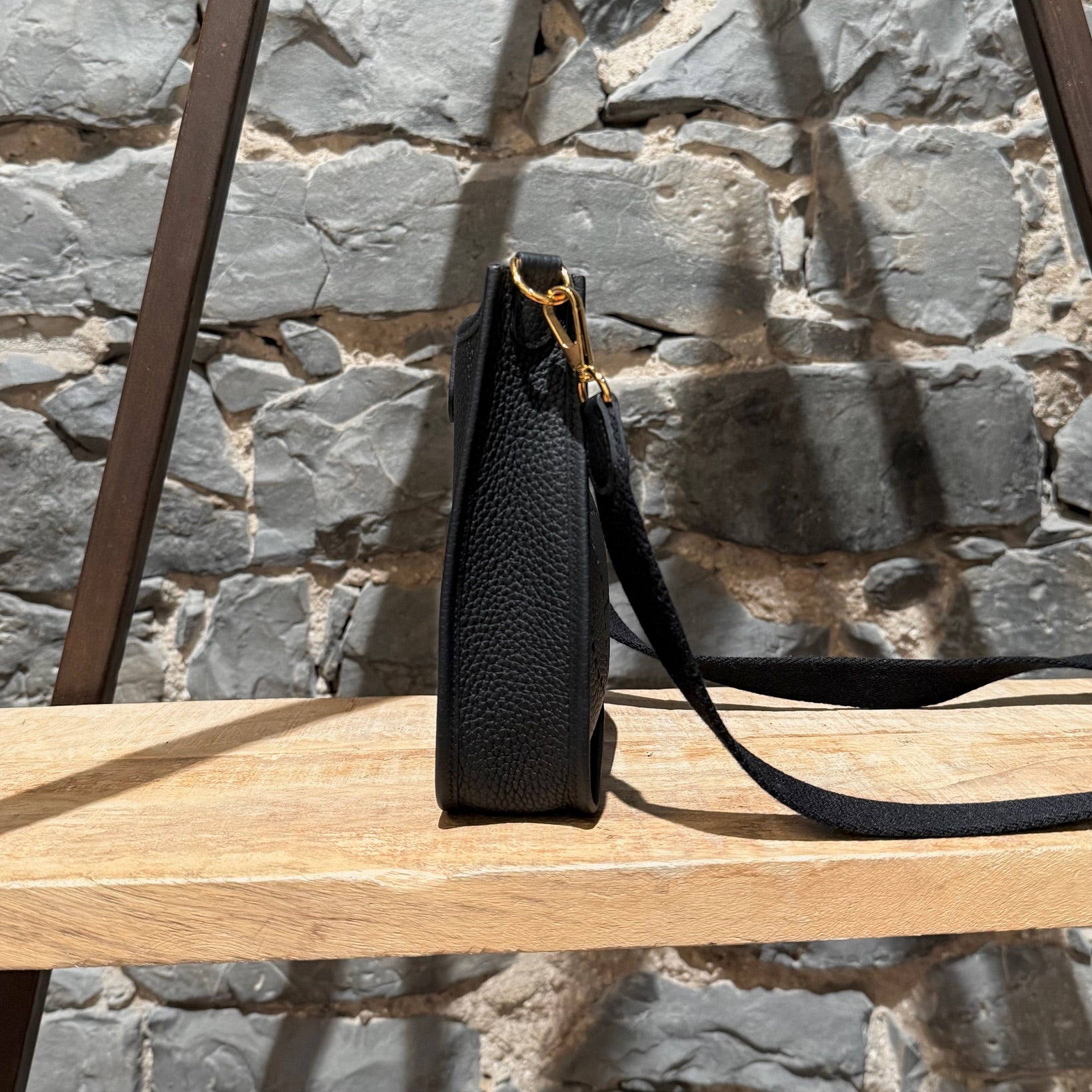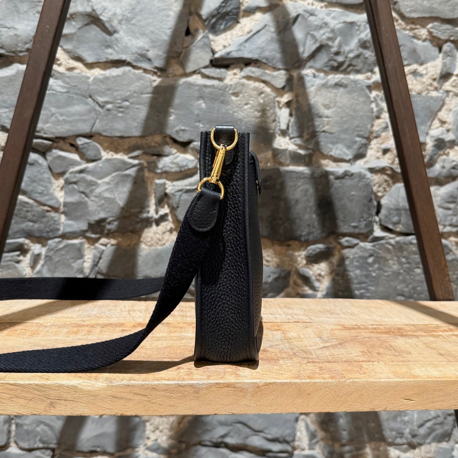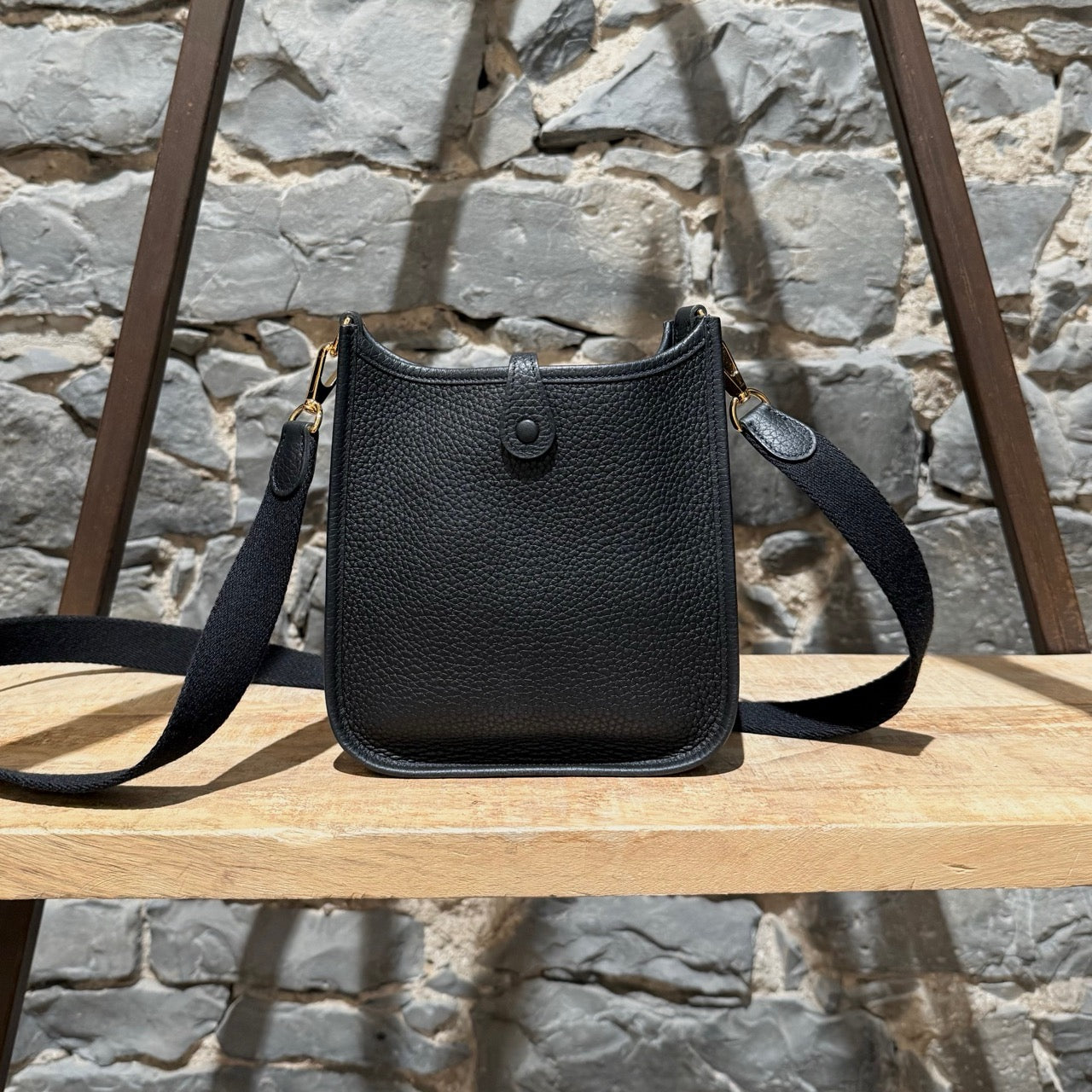 Grained taurillon leather with a structured yet supple finish. Compact design. Perforated “H” motif at front. Leather tab with snap button closure. Removable black canvas shoulder strap with leather trims. Branded gold plated hardware. Single main compartment. Tonal suede interior. Made in France. Date stamp U - 2022. Comes with Hermès box, dustbag, care booklet, and purchase receipt.