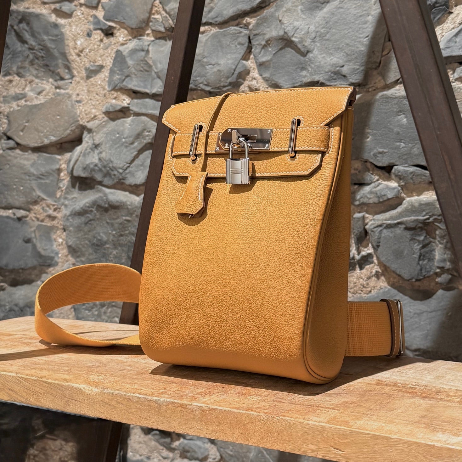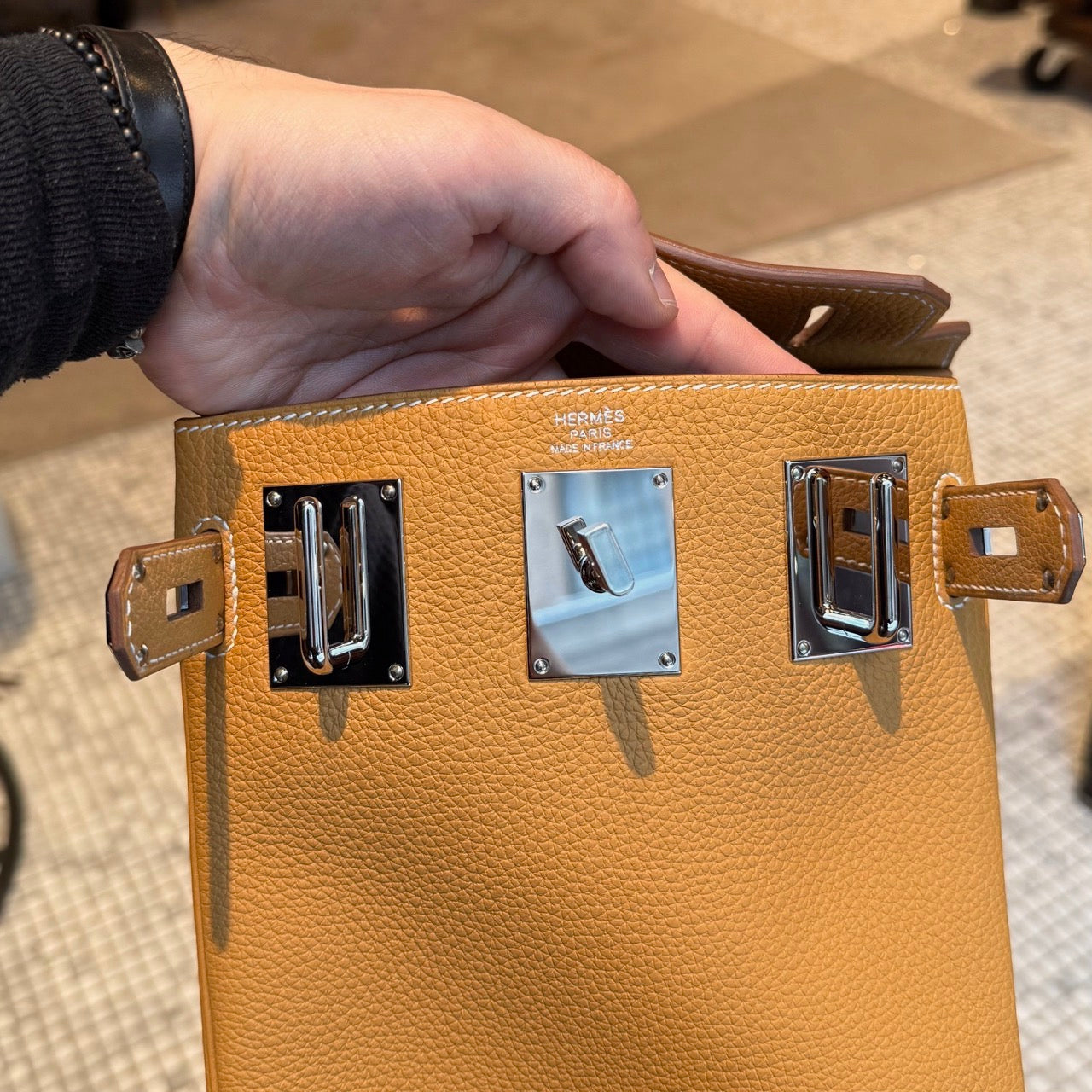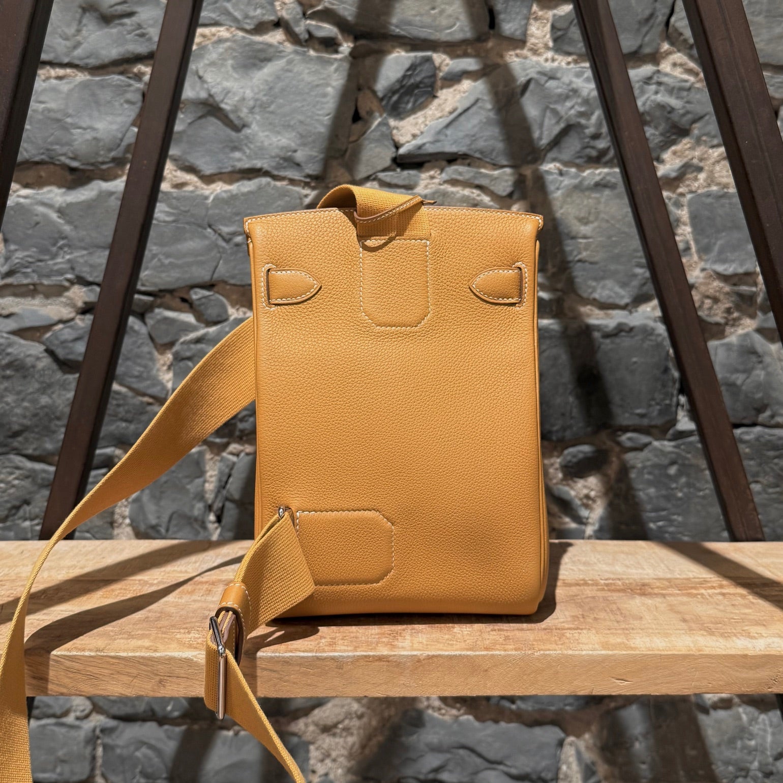Compact Haut à Courroies (HAC)-inspired backpack silhouette. Grained Togo leather in Natural Sable. Front flap with Hermès turn-lock closure. Palladium-plated branded hardware. Adjustable wide canvas shoulder strap with metal adjuster. Reinforced leather base and structured sides. Leather interior with one (1) main compartment and a flat slip pocket. B stamp - 2023. Made in France. Comes with Hermès dustbag, padlock, key and clochette.