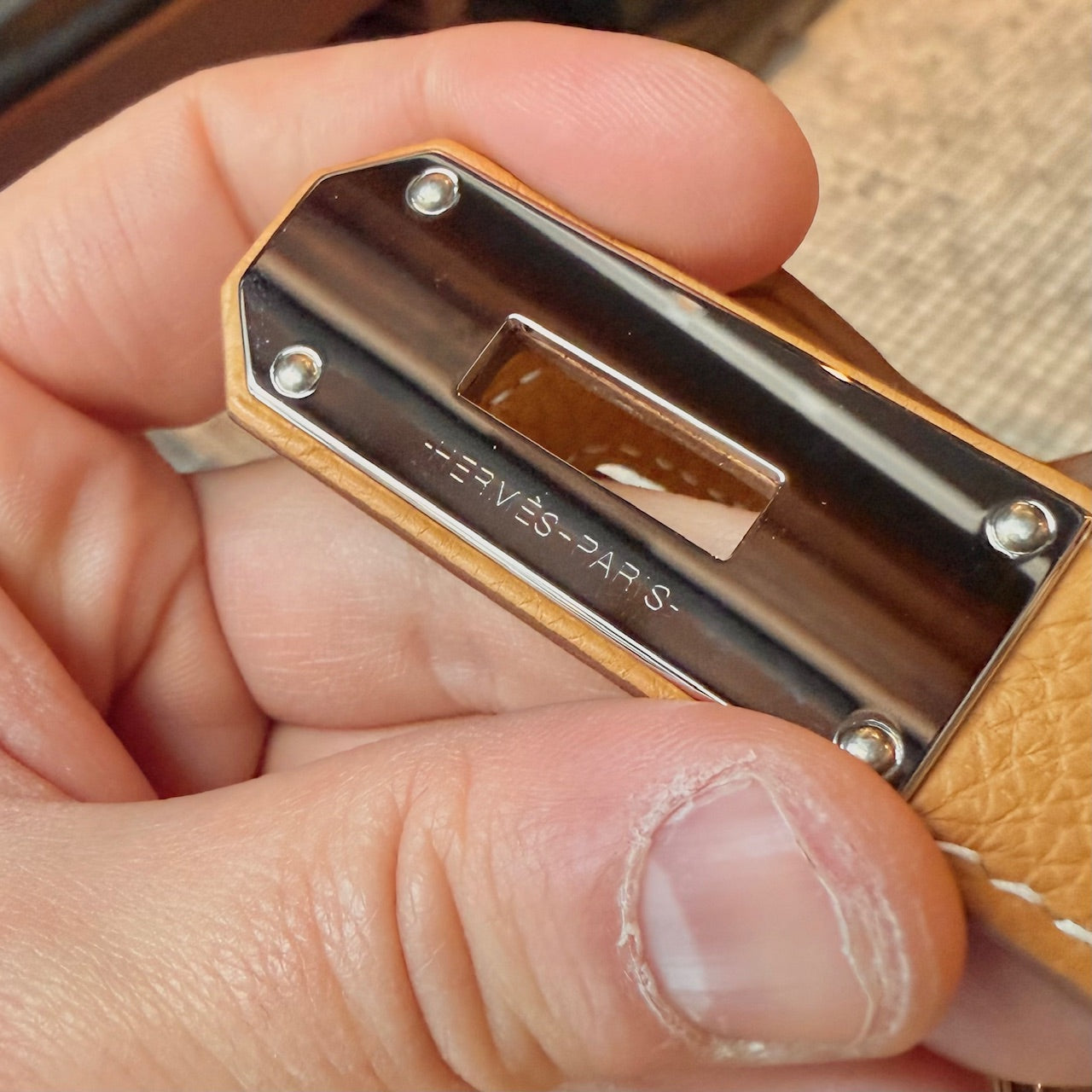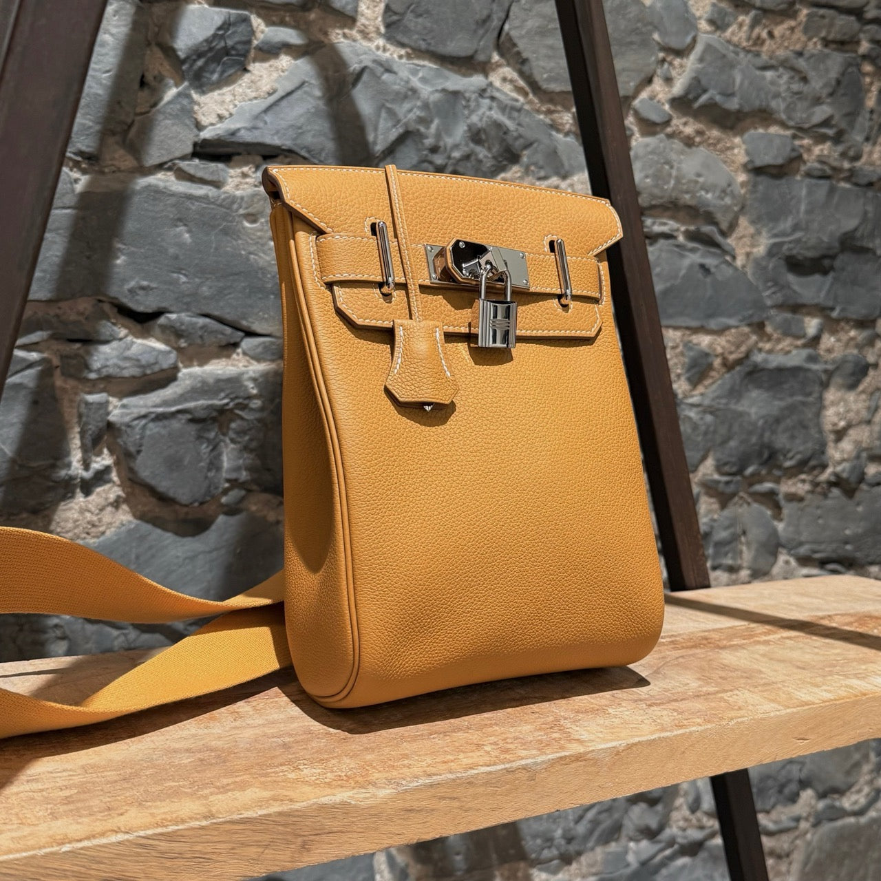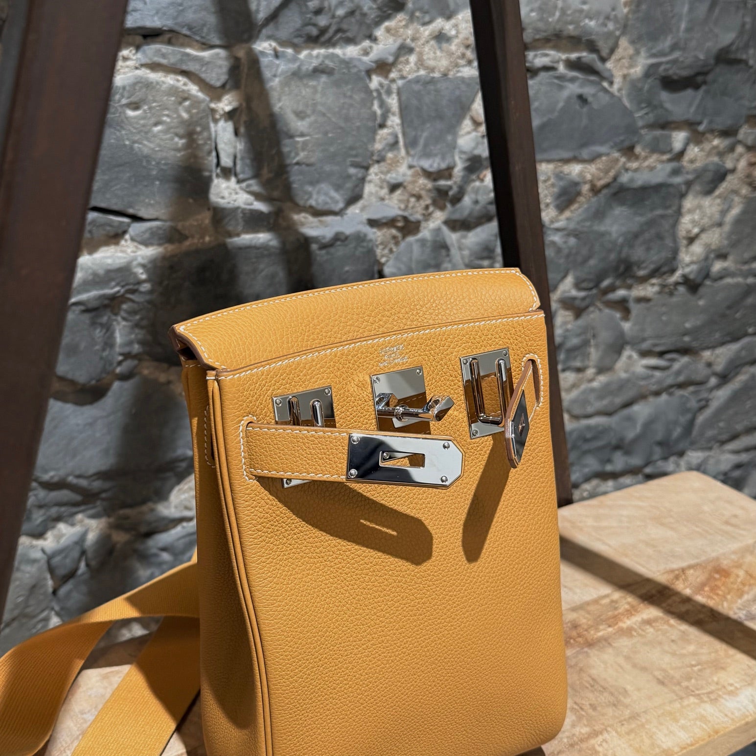 Compact Haut à Courroies (HAC)-inspired backpack silhouette. Grained Togo leather in Natural Sable. Front flap with Hermès turn-lock closure. Palladium-plated branded hardware. Adjustable wide canvas shoulder strap with metal adjuster. Reinforced leather base and structured sides. Leather interior with one (1) main compartment and a flat slip pocket. B stamp - 2023. Made in France. Comes with Hermès dustbag, padlock, key and clochette.