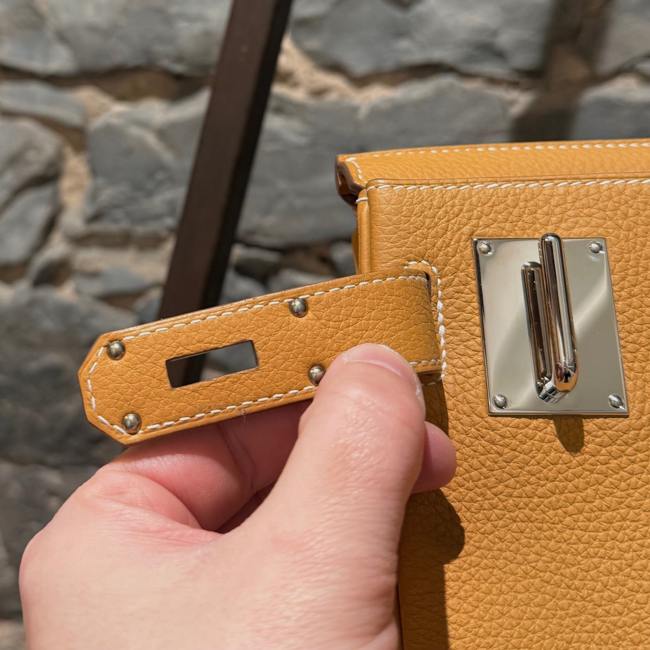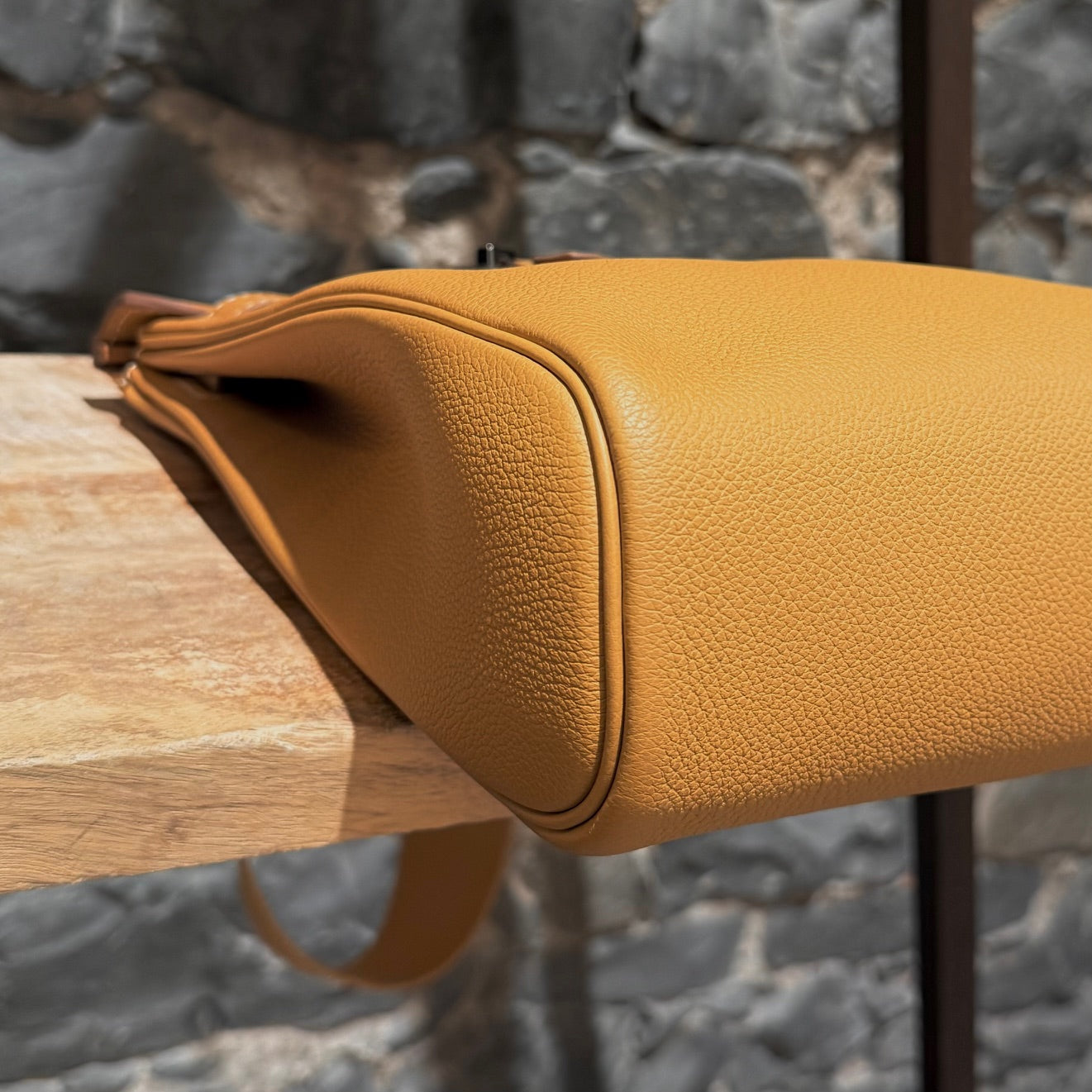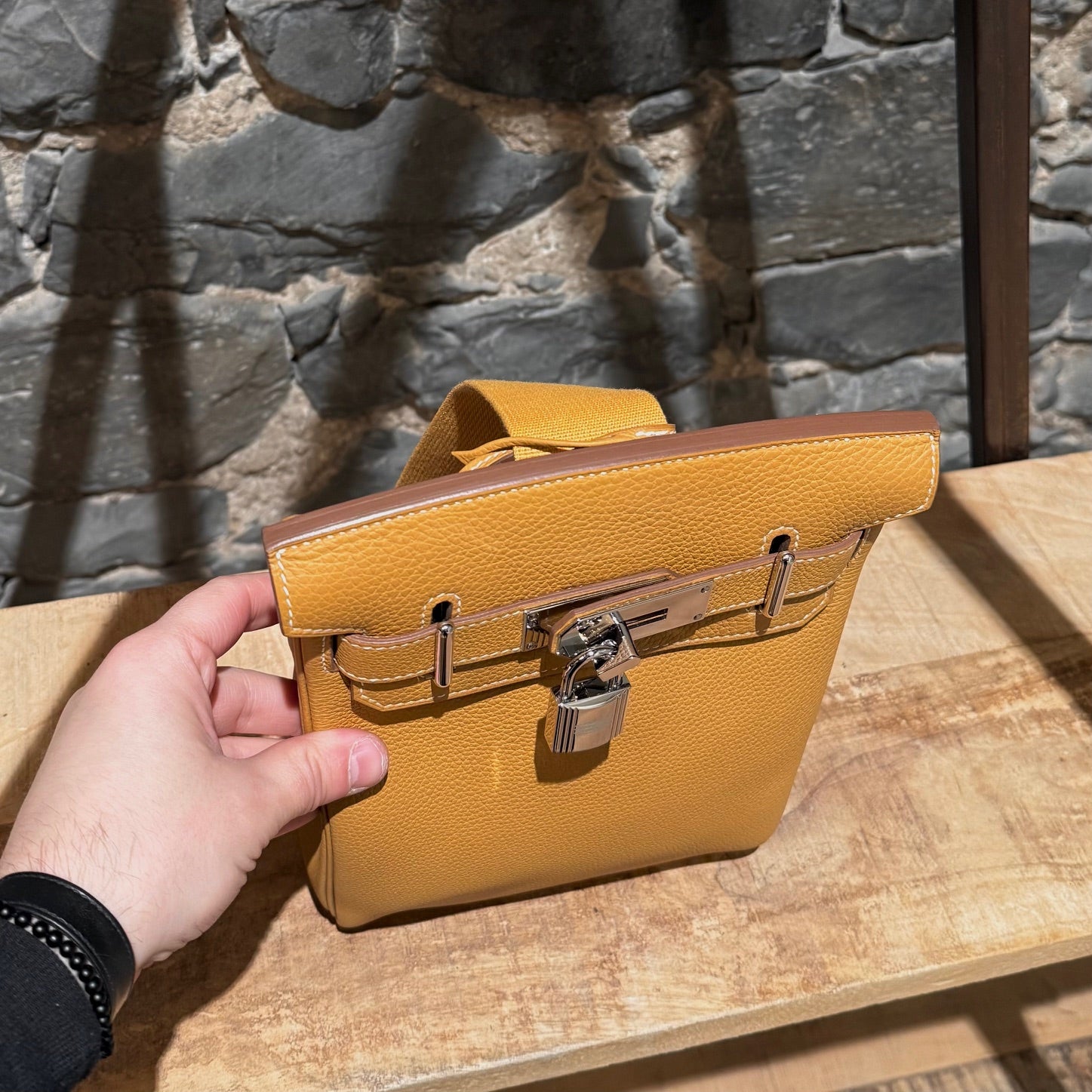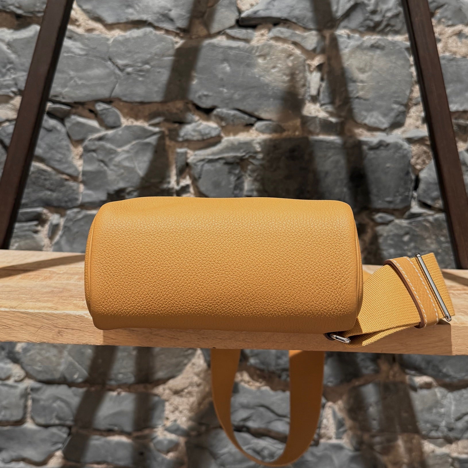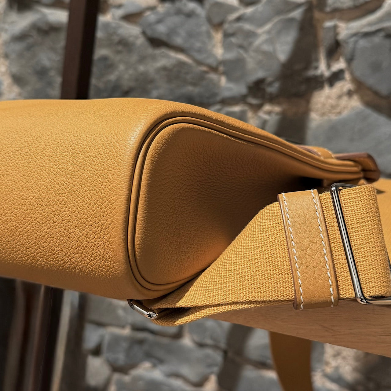 Strap drop: 20" (adjustable)MATERIAL(S): Togo leather, canvas, leather, metal.
