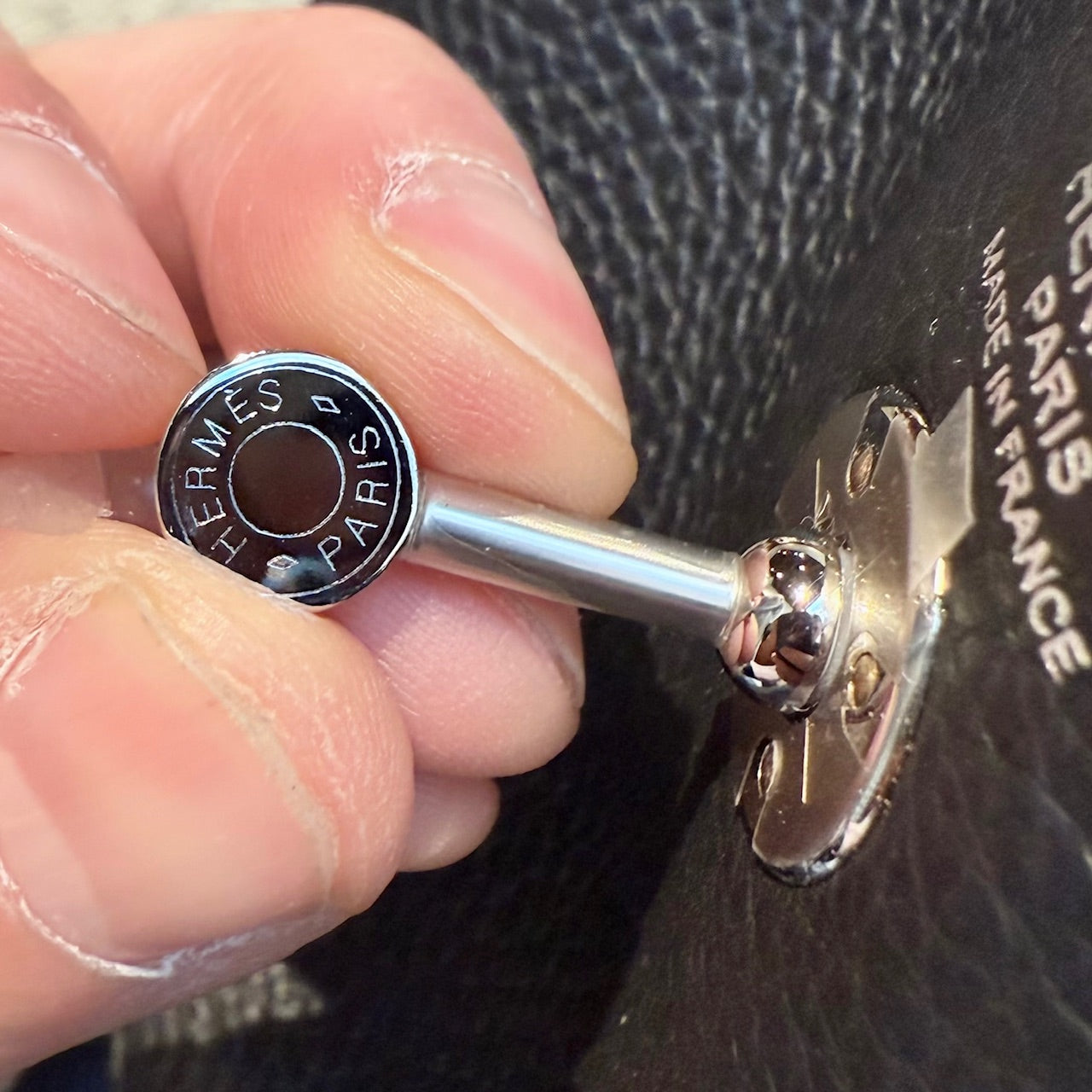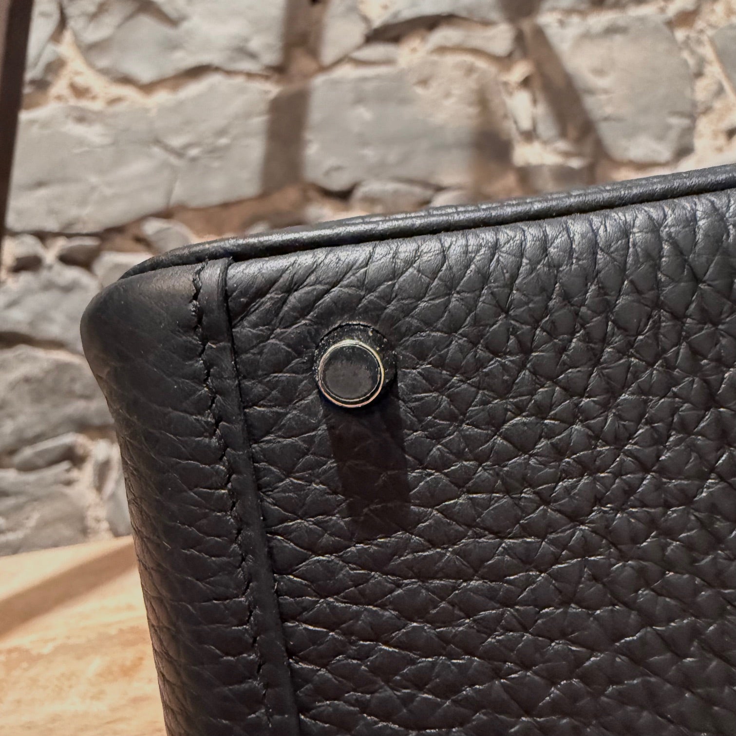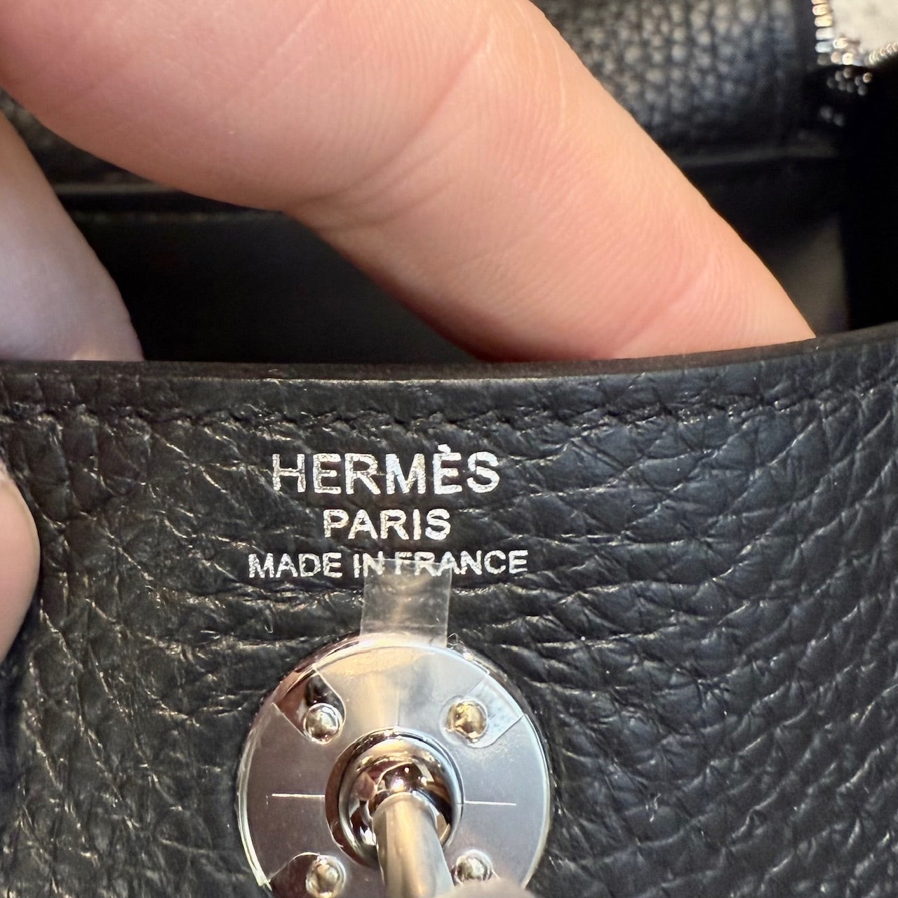 Mini top handle bag with shoulder and crossbody carry options. Black soft taurillon leather with fine pebbled grain. Soft yet structured silhouette. Two (2) rolled leather top handles. Flat leather shoulder strap. Double zip closure with leather tab and metal H stoppers. Two (2) side pockets. Signature Hermès Clou de Selle twist-lock front closure. Branded palladium-plated hardware. Single main compartment with two (2) inner side pockets. Smooth black leather lining.  Four (4) metal base feet. W stamp - 2024. Made in France. Comes with Hermès box, dustbag, purchase receipt, ribbon, care booklet, and felt protector.