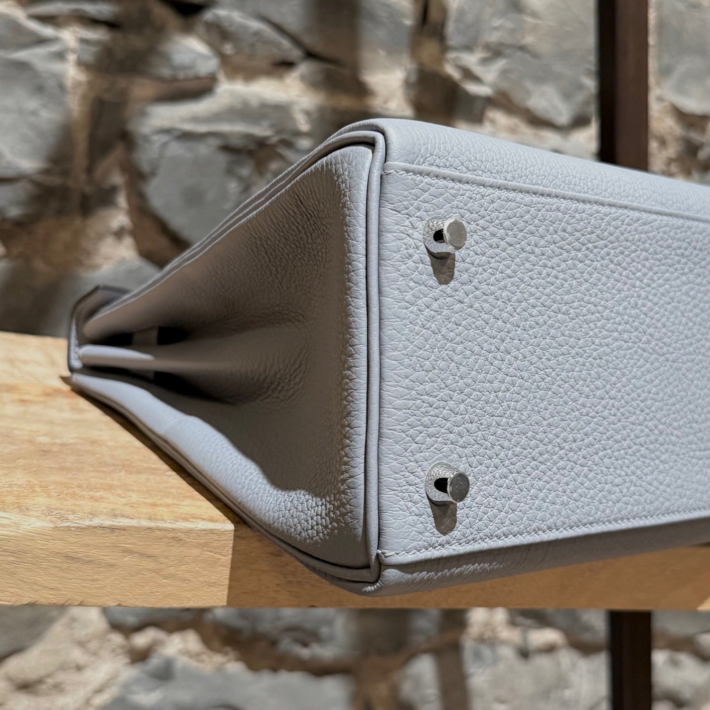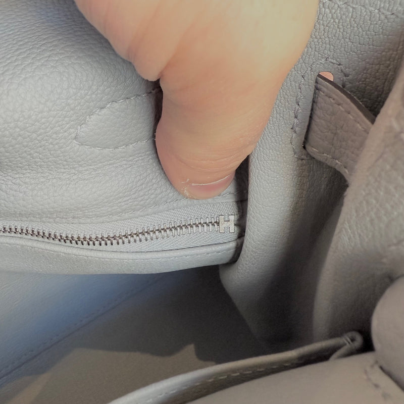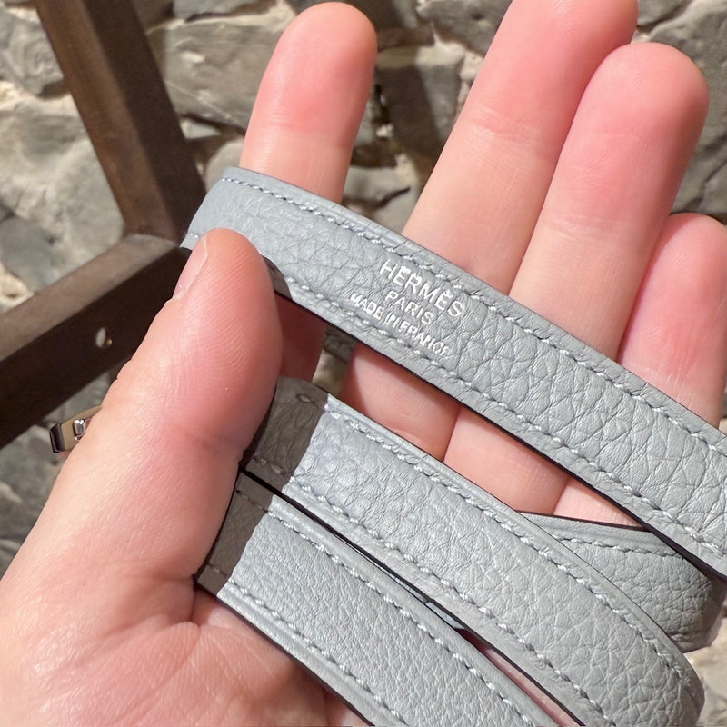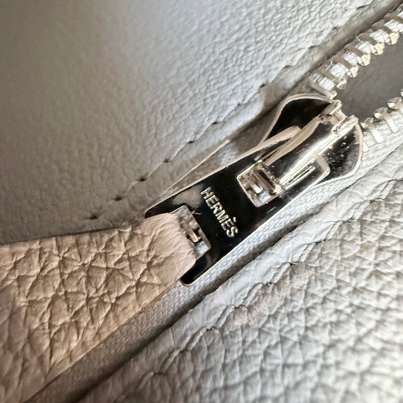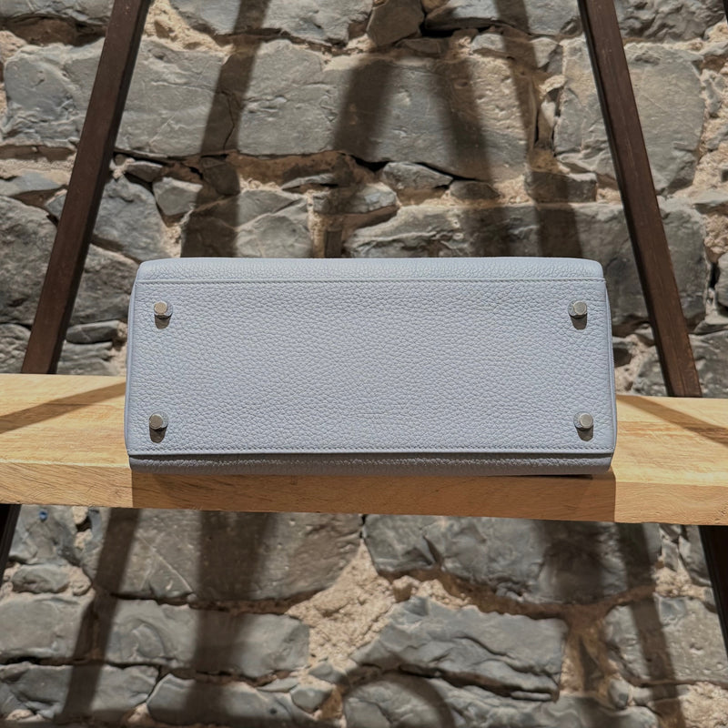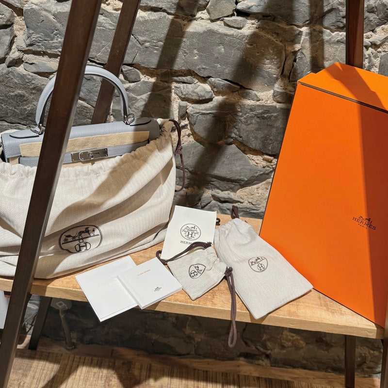 Hermès 2025 Gris Pantin Togo Kelly Retourne 28 PHW Bag. Retourne trapezoid-shaped silhouette. Gris Pantin (cold grey) Togo leather with fine grain texture. Features palladium-plated hardware, clochette with lock and keys, protective feet, and matching detachable shoulder strap. Hermès engraving on all hardware elements. Top handle. Hermès’ signature turn-lock closure. Lined in chèvre leather with a zip pocket and a slip pocket. K stamp - 2025. Comes complete with original Hermès orange box, felt protector, dustbags, ribbon, brand cards, and purchase receipt. Made in France.