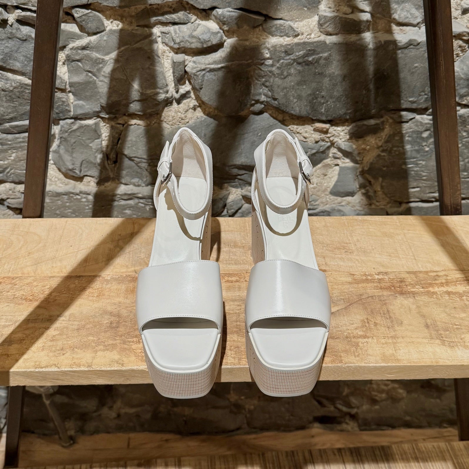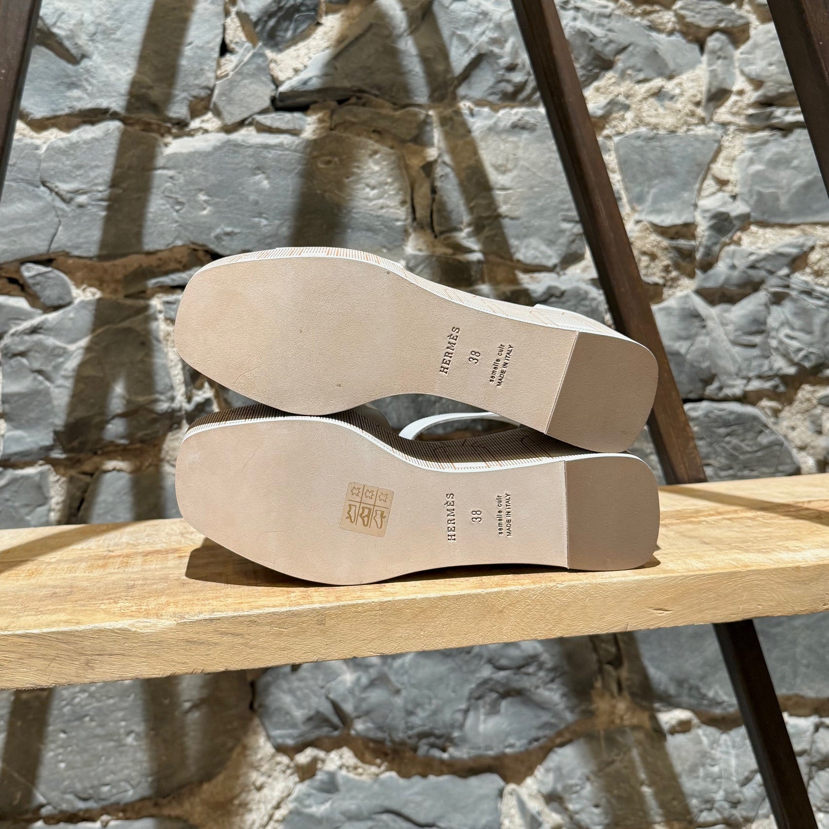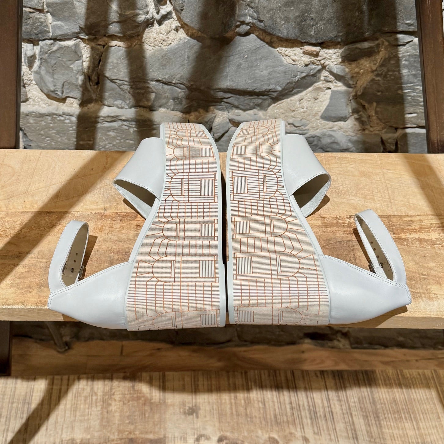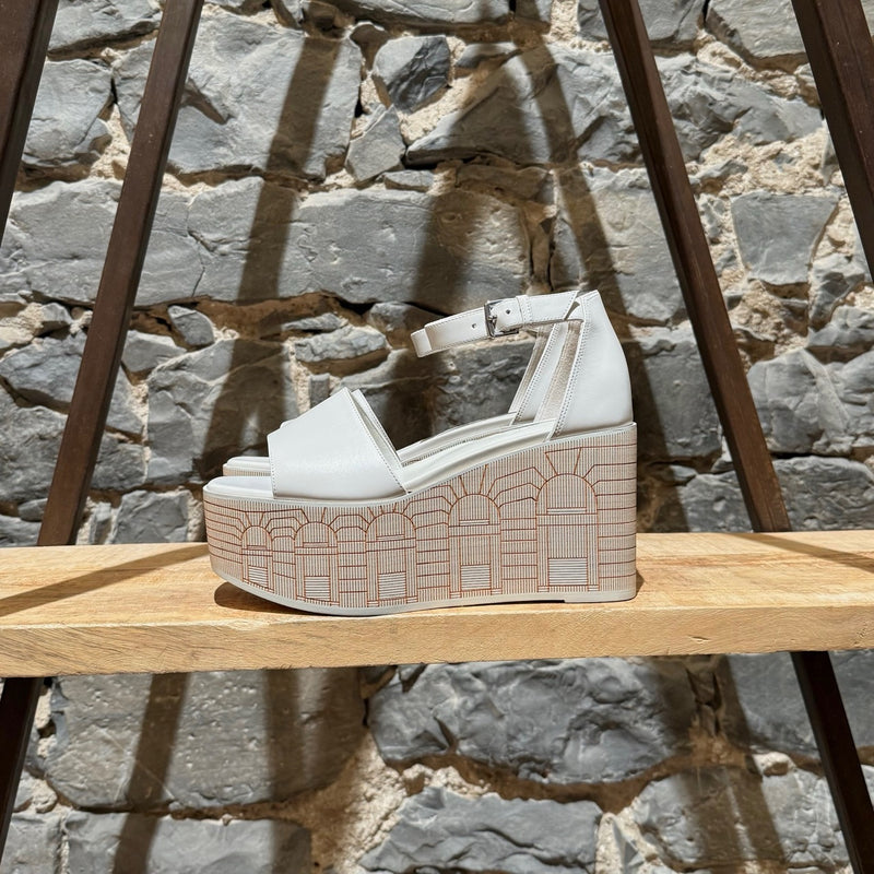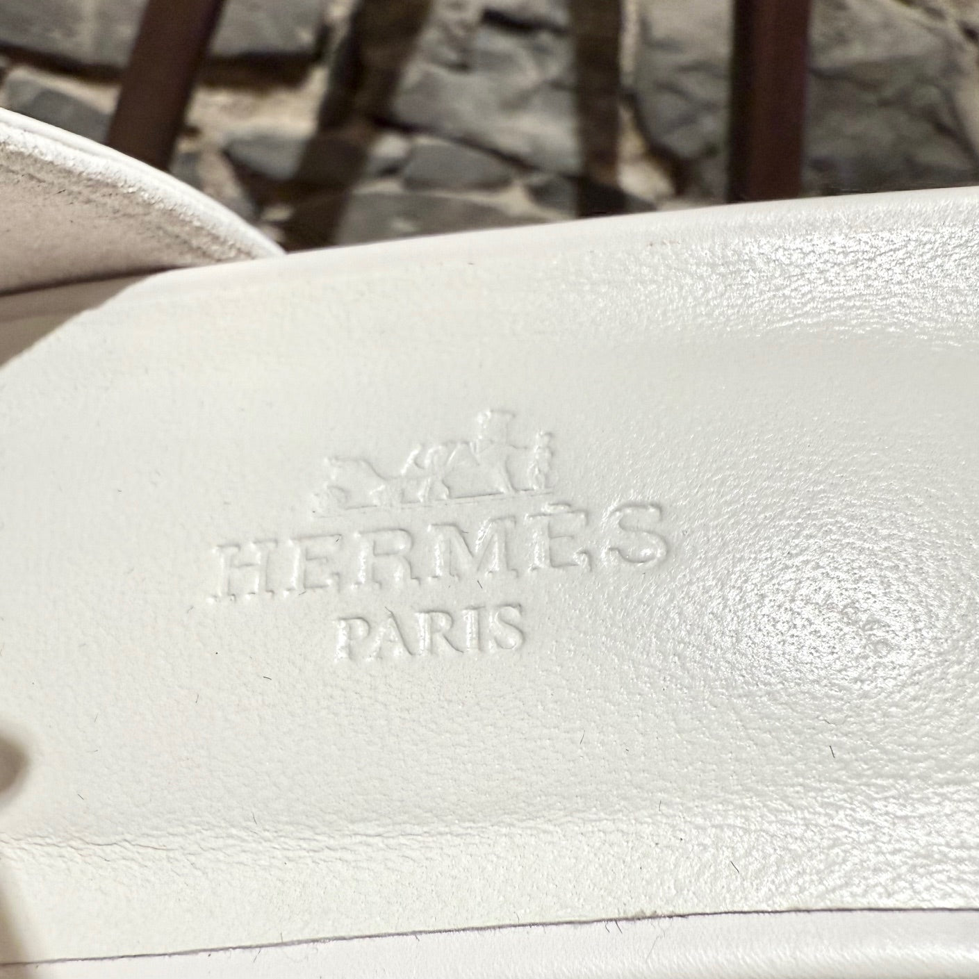 Hermès Illusion 35 Blanc de Paris Wedge Leather Sandals. Wedge silhouette. Wide toe strap and a secure ankle strap with adjustable buckle closure. The platform and wedge heel are adorned with architectural graphic carved motifs, echoing classical Parisian windows. Debossed Hermès Paris logo on the insole. Made in Italy. They come with Hermès dustbags.