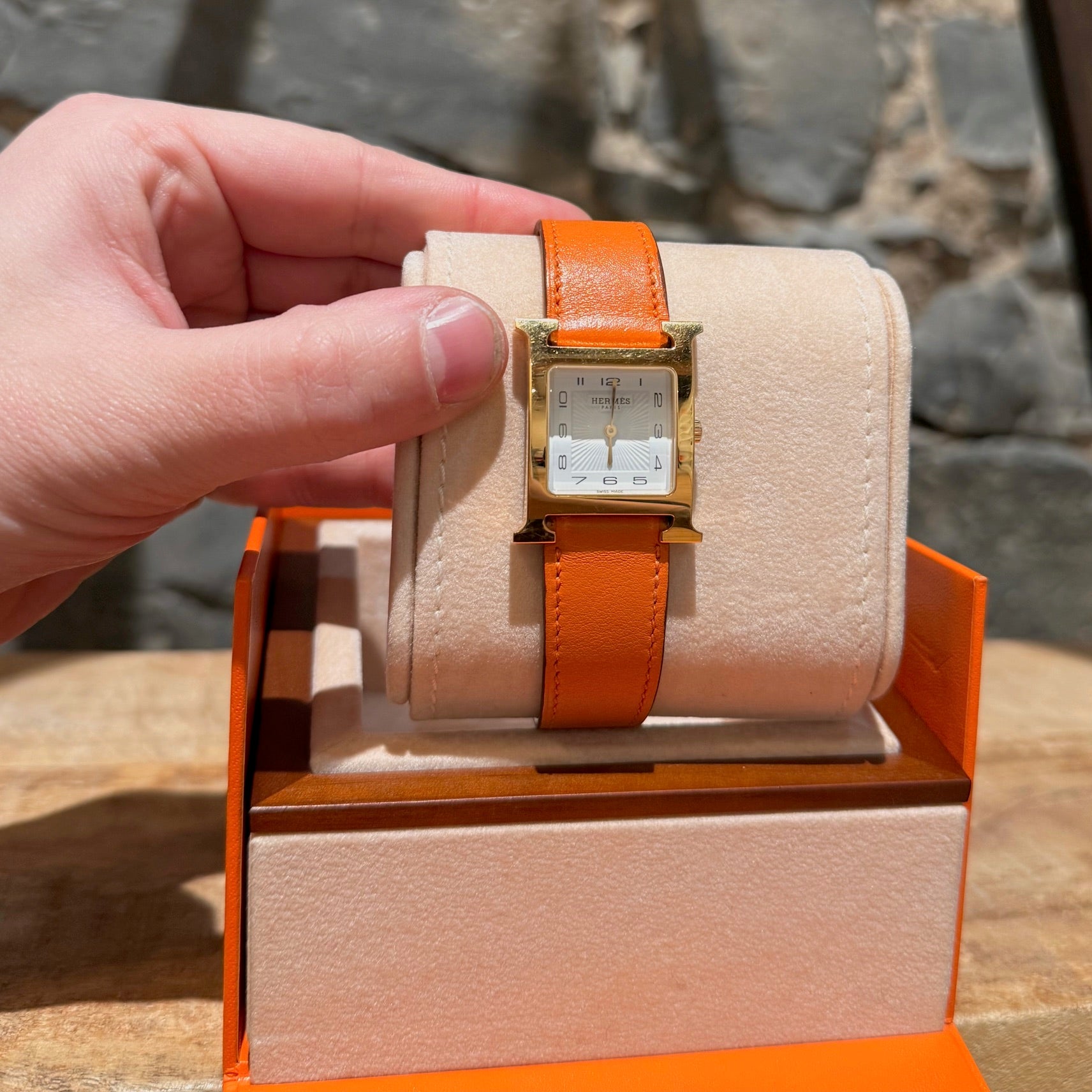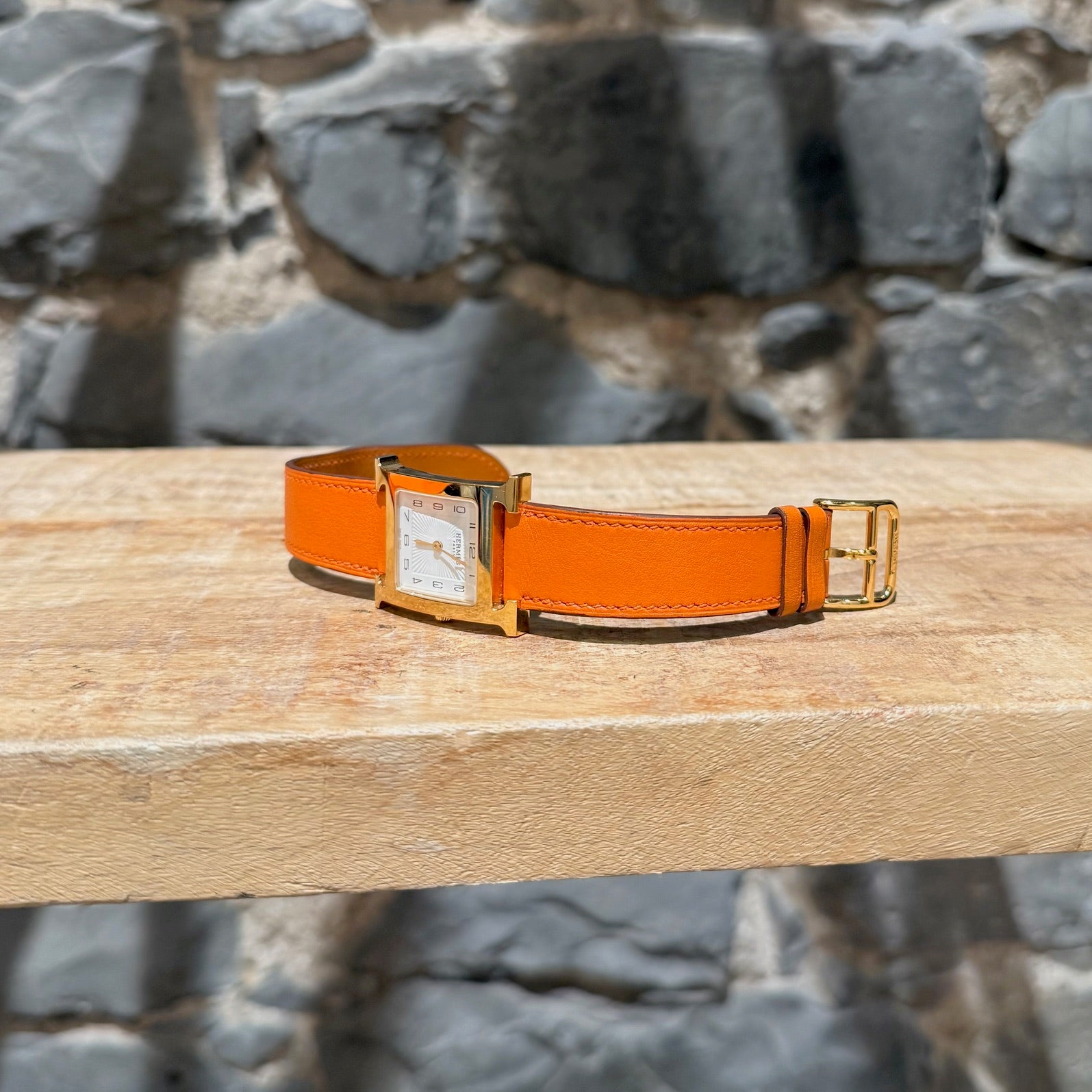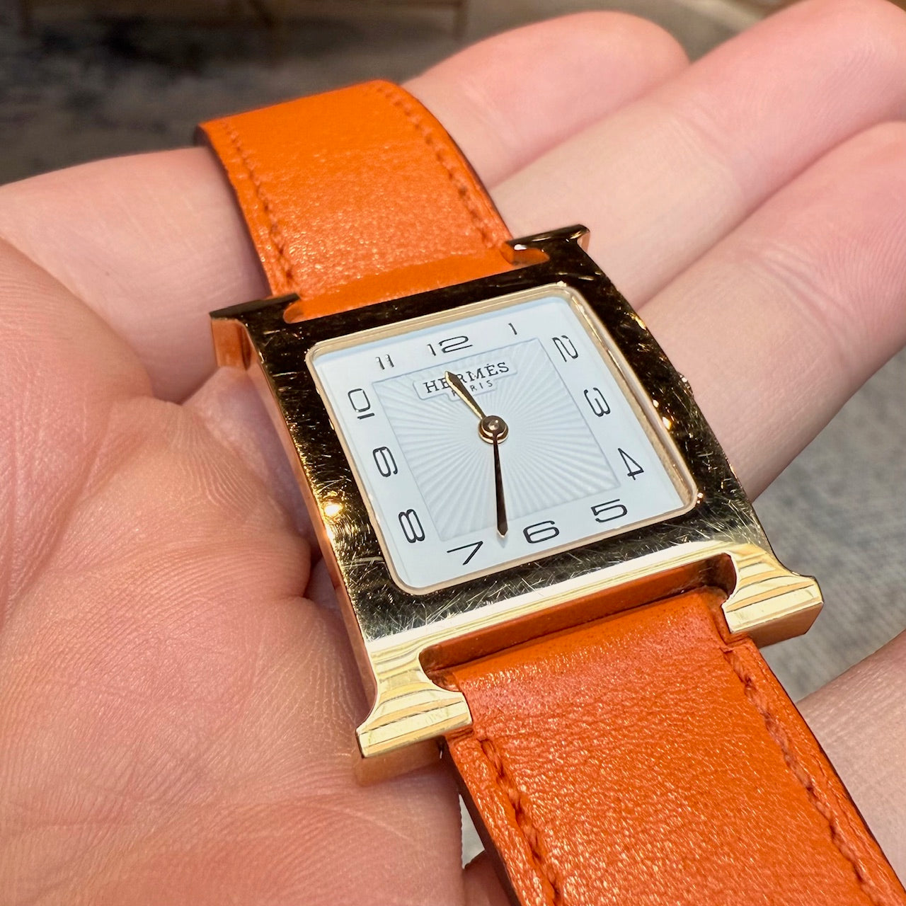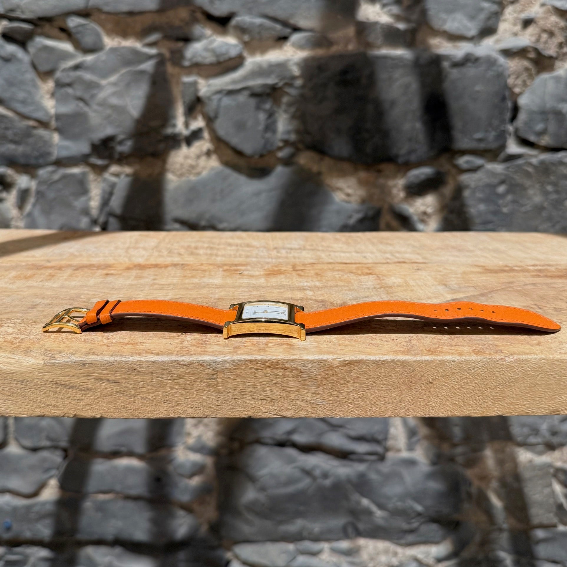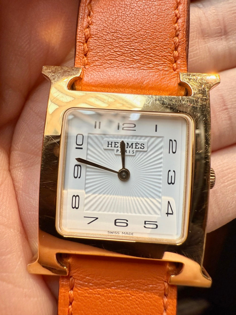 30 mm height-size case. Medium model. Yellow gold-plated steel case with an anti-glare sapphire crystal. White dial with Hermès branding, a stamped sunburst motif and printed Arabic numerals. Swiss-made quartz movement displaying hours and minutes. Interchangeable orange Swift leather strap. Engraved gold-plated steel pin buckle. Stainless steel case back engraved with Hermès branding and reference markings. Water resistance rated to 3 bar. Made in Switzerland. Comes with Hermès presentation box with cushion, bracelet box, dustbags, ribbon, warranty booklet, instruction booklet, and information card. Purchased in 2018. The battery was replaced in 2025.