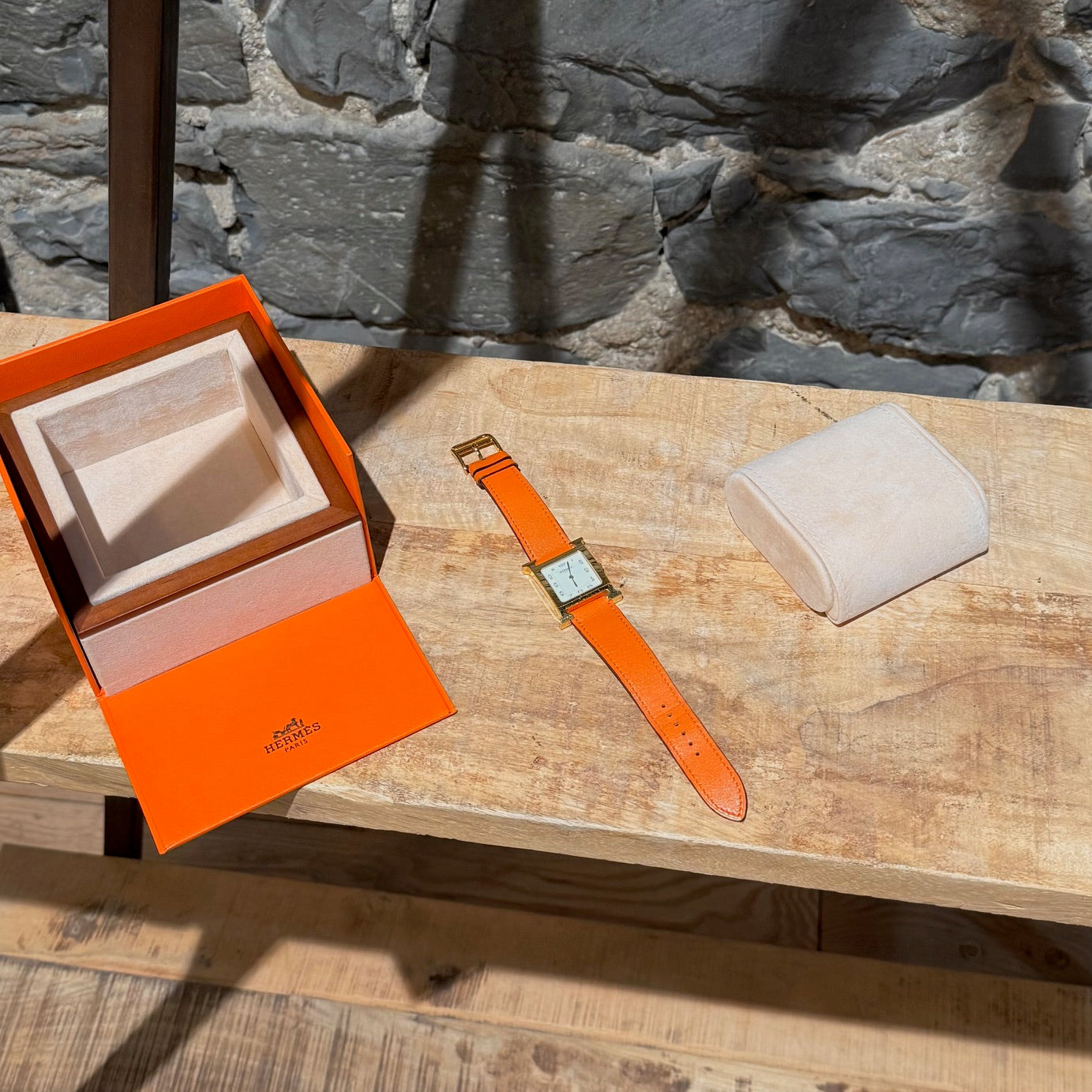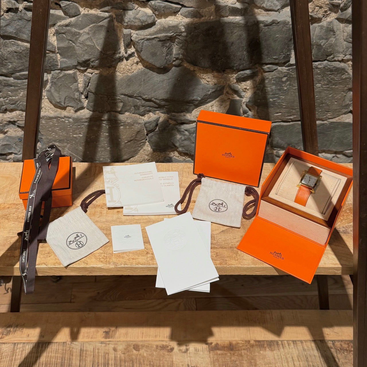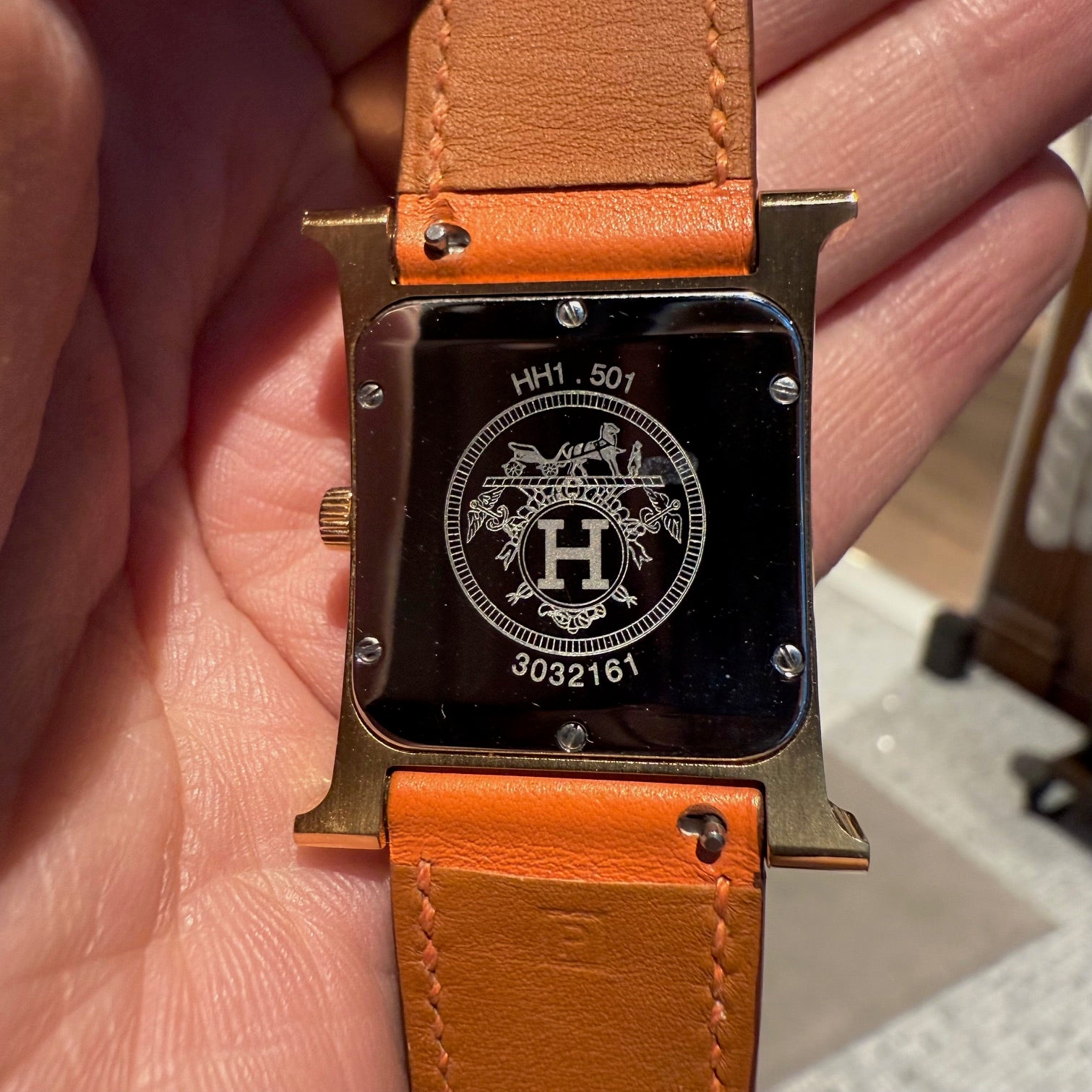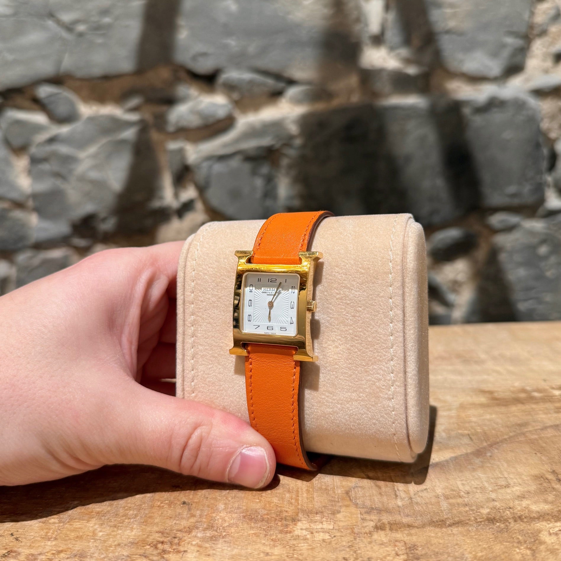 30 mm height-size case. Medium model. Yellow gold-plated steel case with an anti-glare sapphire crystal. White dial with Hermès branding, a stamped sunburst motif and printed Arabic numerals. Swiss-made quartz movement displaying hours and minutes. Interchangeable orange Swift leather strap. Engraved gold-plated steel pin buckle. Stainless steel case back engraved with Hermès branding and reference markings. Water resistance rated to 3 bar. Made in Switzerland. Comes with Hermès presentation box with cushion, bracelet box, dustbags, ribbon, warranty booklet, instruction booklet, and information card. Purchased in 2018. The battery was replaced in 2025.