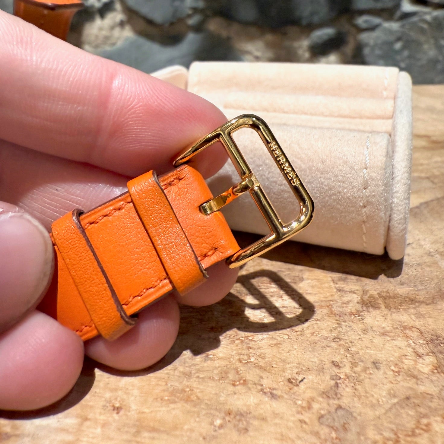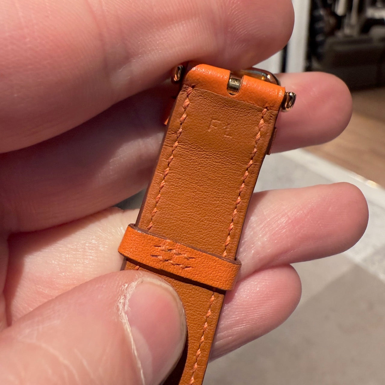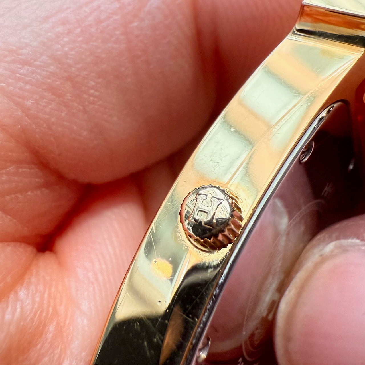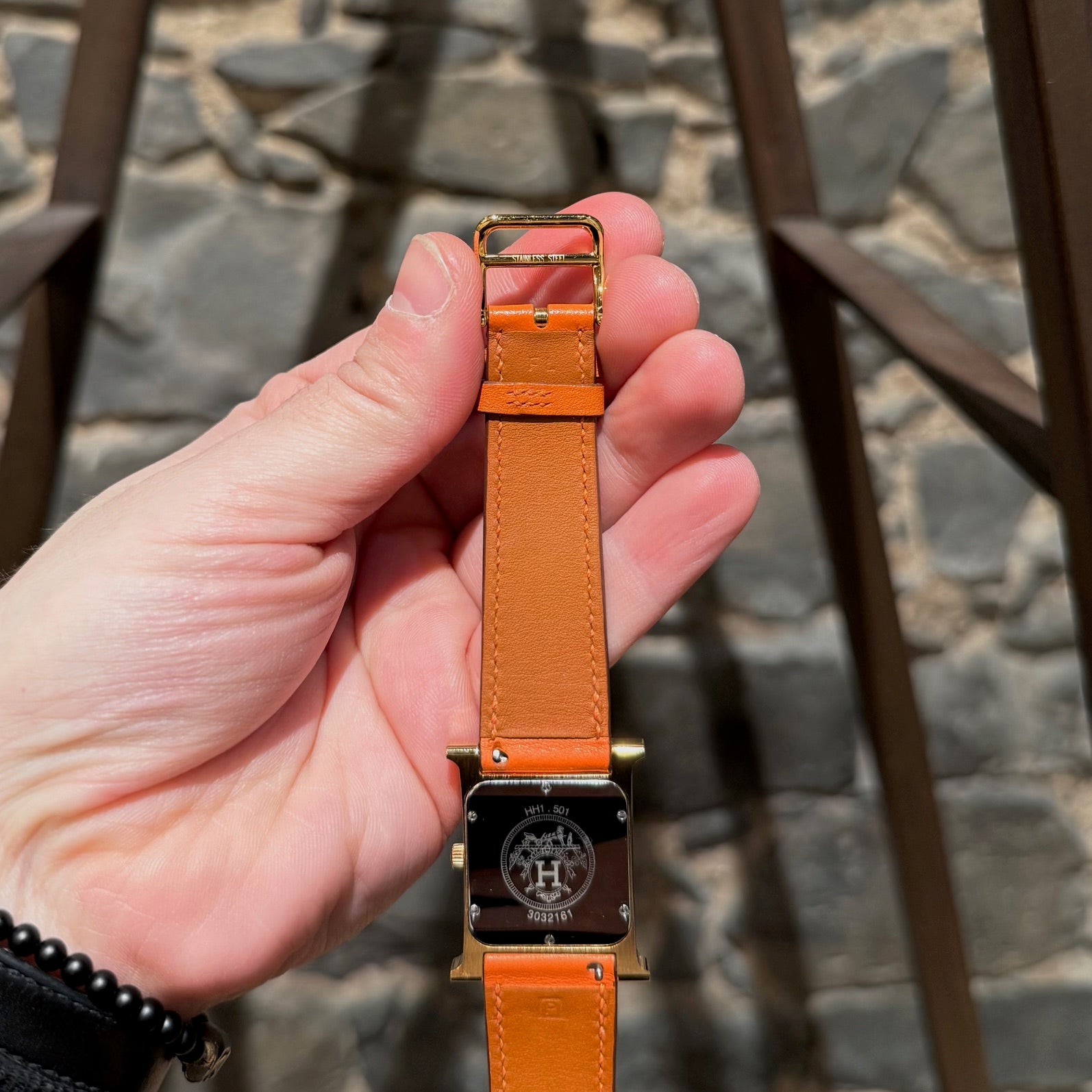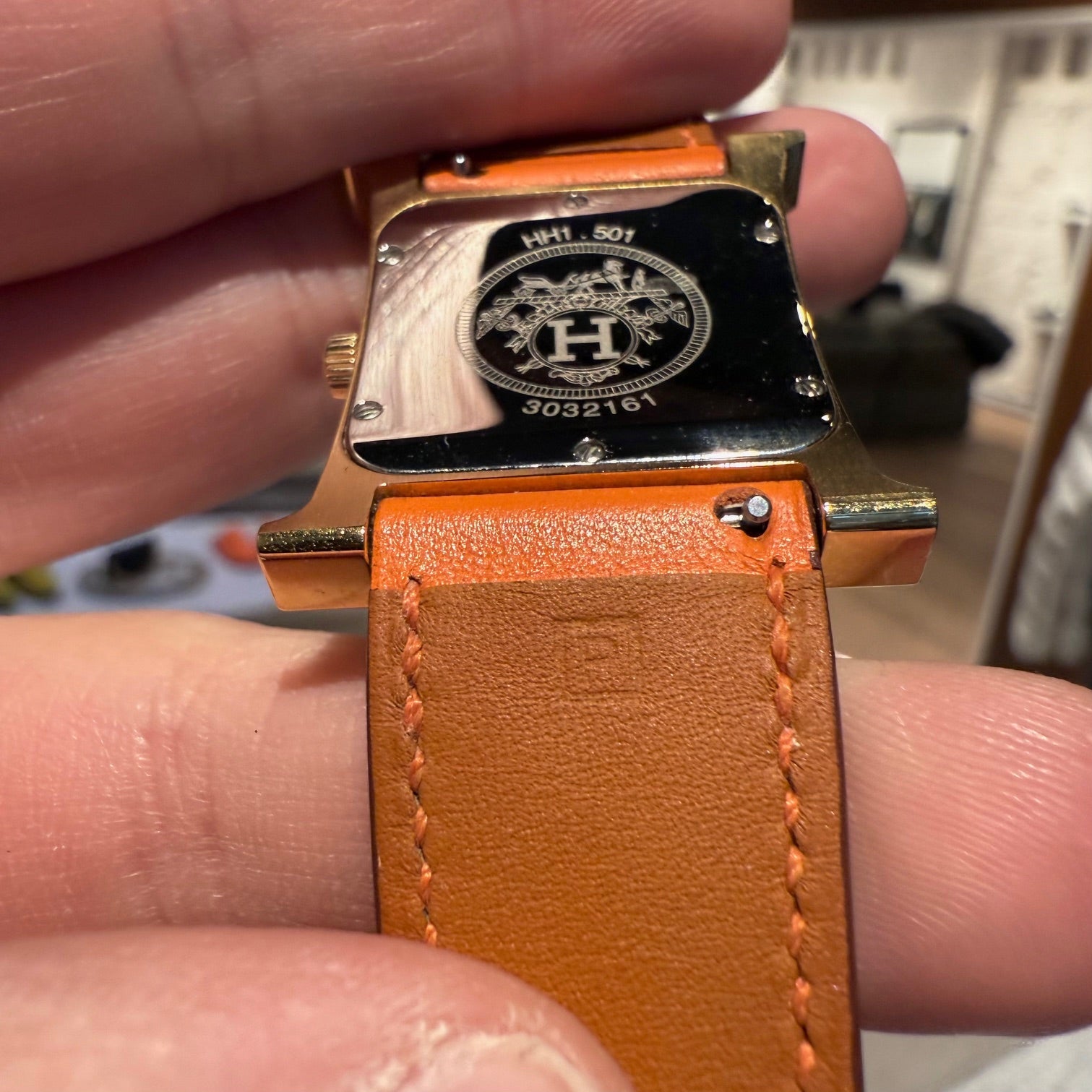 30 mm height-size case. Medium model. Yellow gold-plated steel case with an anti-glare sapphire crystal. White dial with Hermès branding, a stamped sunburst motif and printed Arabic numerals. Swiss-made quartz movement displaying hours and minutes. Interchangeable orange Swift leather strap. Engraved gold-plated steel pin buckle. Stainless steel case back engraved with Hermès branding and reference markings. Water resistance rated to 3 bar. Made in Switzerland. Comes with Hermès presentation box with cushion, bracelet box, dustbags, ribbon, warranty booklet, instruction booklet, and information card. Purchased in 2018. The battery was replaced in 2025.