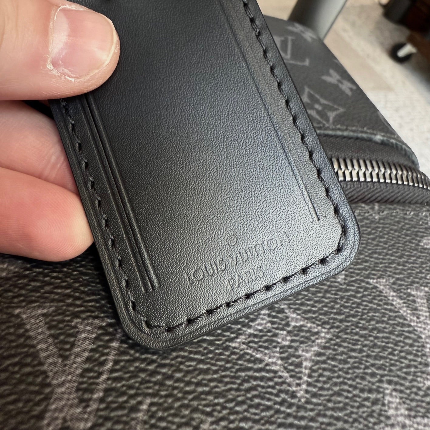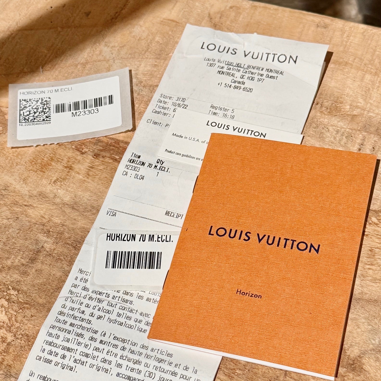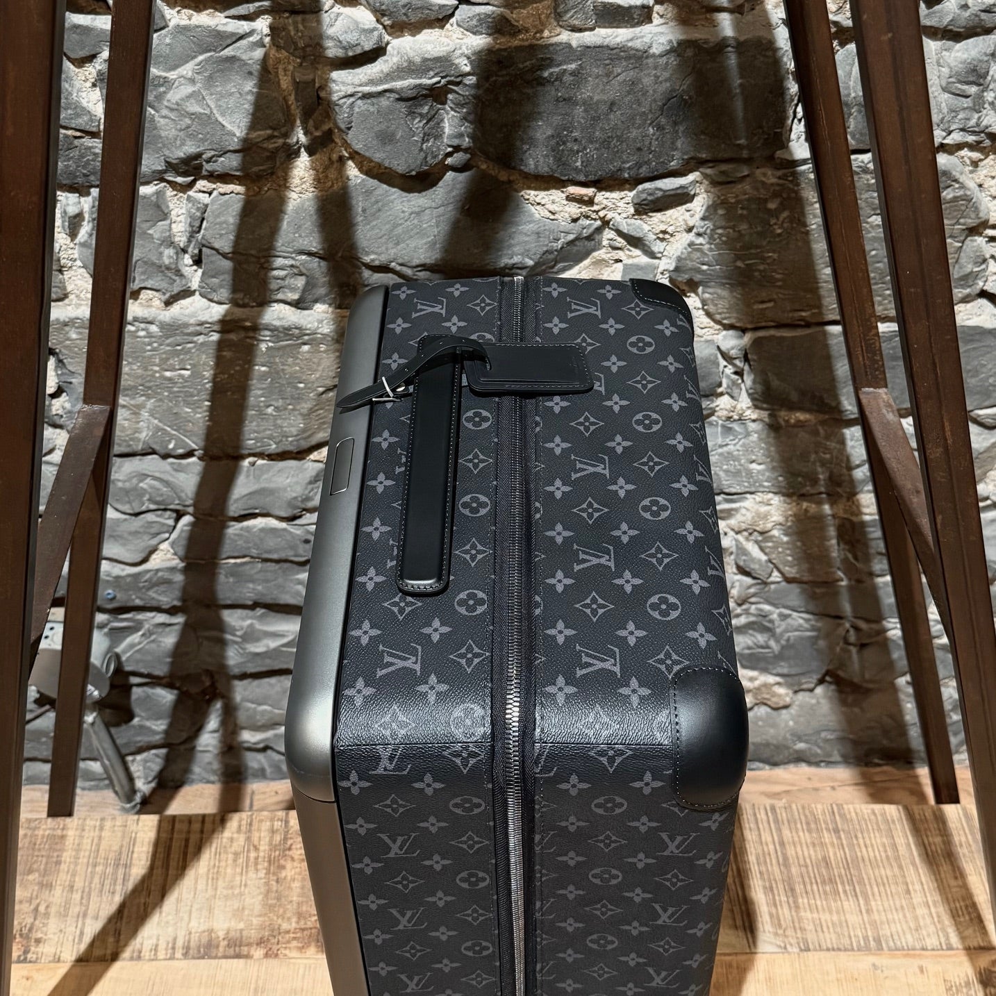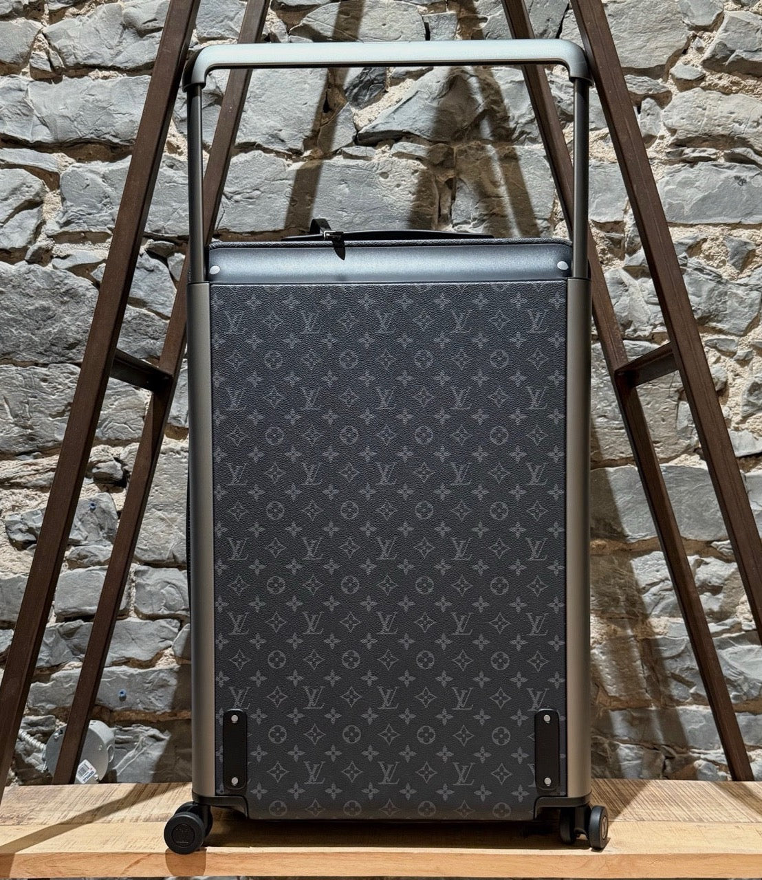Louis Vuitton Horizon 70 Monogram Eclipse Luggage. Lightweight hard-sided rolling luggage featuring Louis Vuitton's signature Monogram Eclipse coated canvas. Four-wheel system with Louis Vuitton logo wheels. Zip-around closure with branded stopper and an integrated TSA-approved combination lock. Adjustable telescopic handle and top leather handle. Protective leather corners. Fully lined interior with two (2) zippered compartments and removable garment luggage cover. Leather name tag included. NFC tag embedded for authenticity. Made in U.S.A. Comes with original box, dustbag, receipt, tags, and booklets.