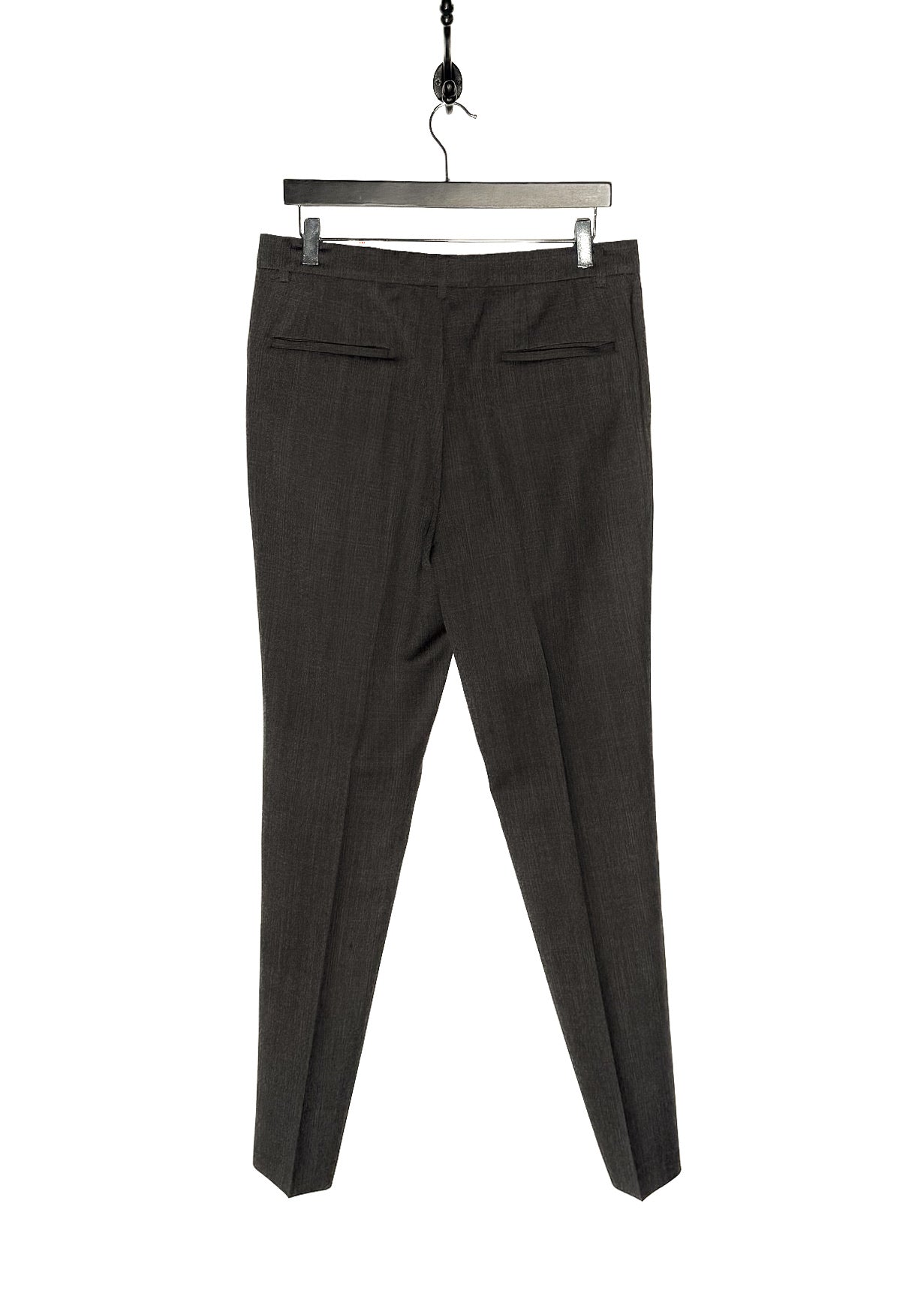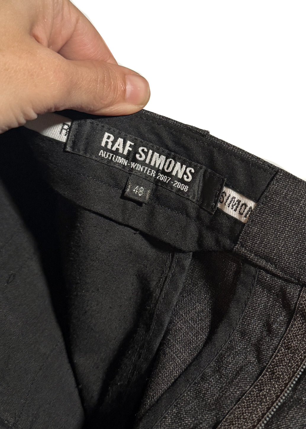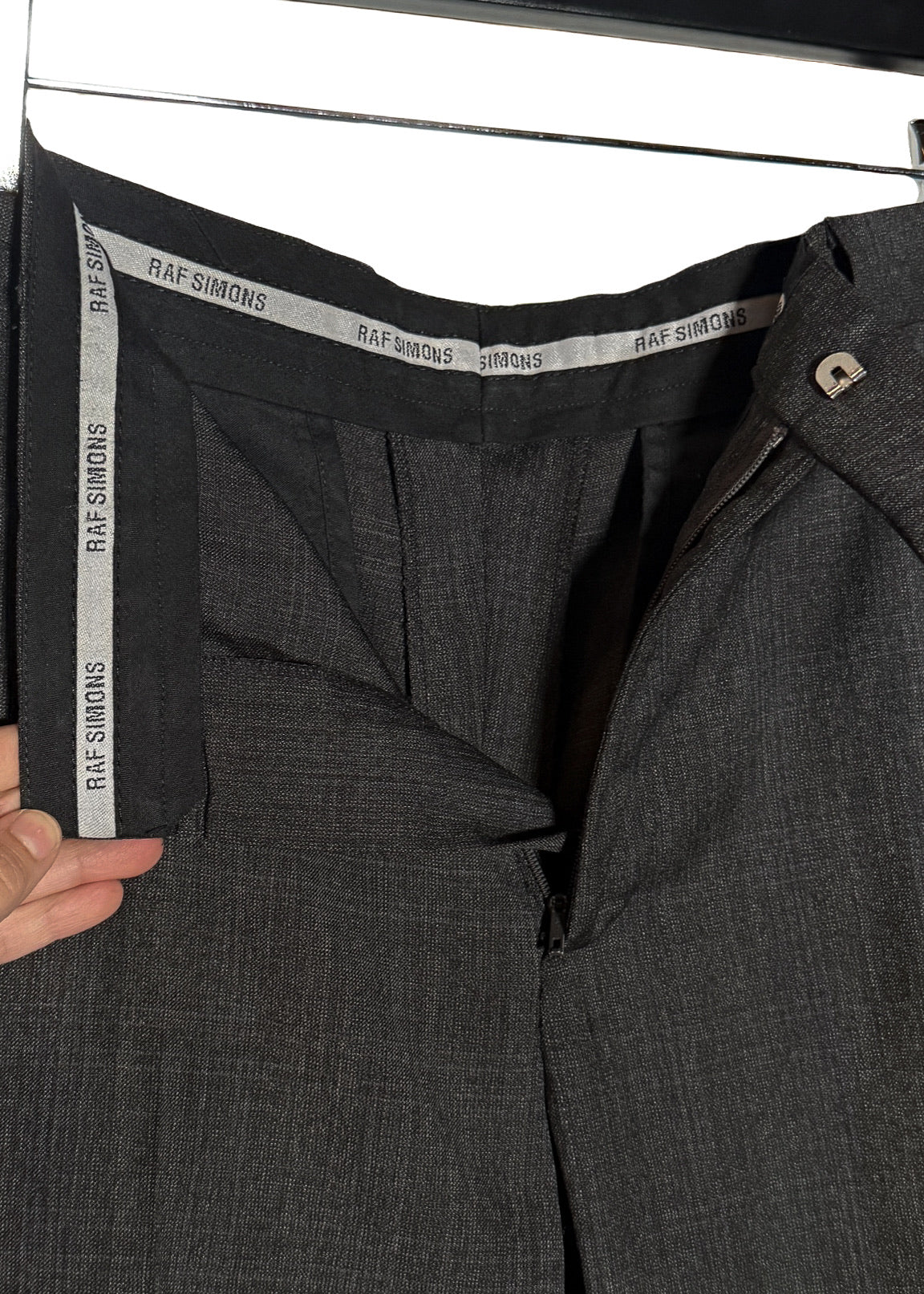 Straight slim fit. Mid-rise. Tapered leg. Charcoal subtly checkered wool. Clean front with single pleat. Concealed zip and hook closure. Side slash pockets. Single back welt pocket. Fully lined with Raf Simons waistband tape. Autumn Winter 2007–2008 collection. Made in Romania.
