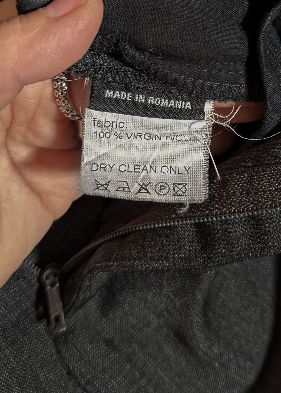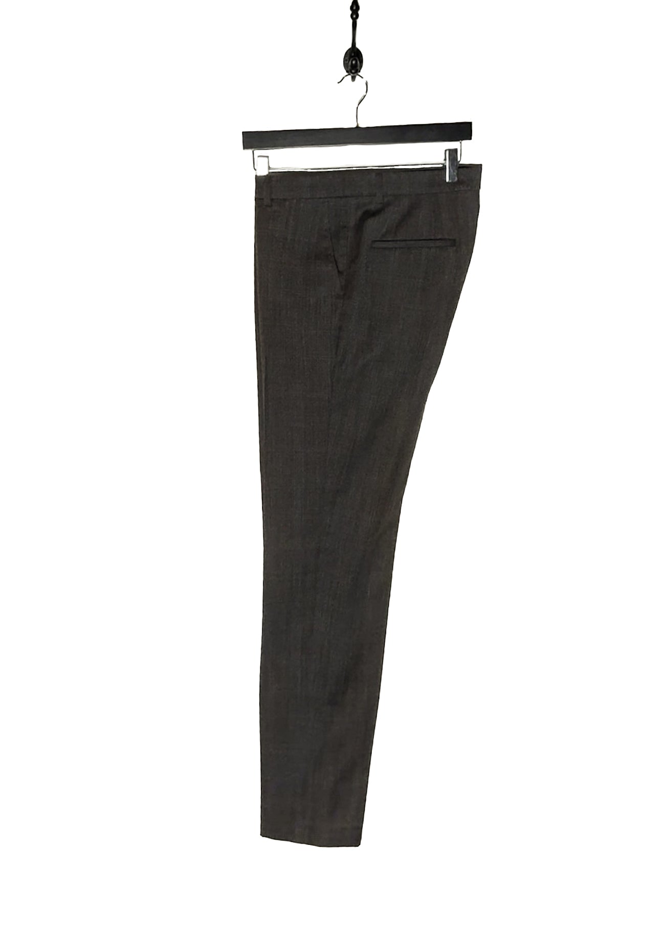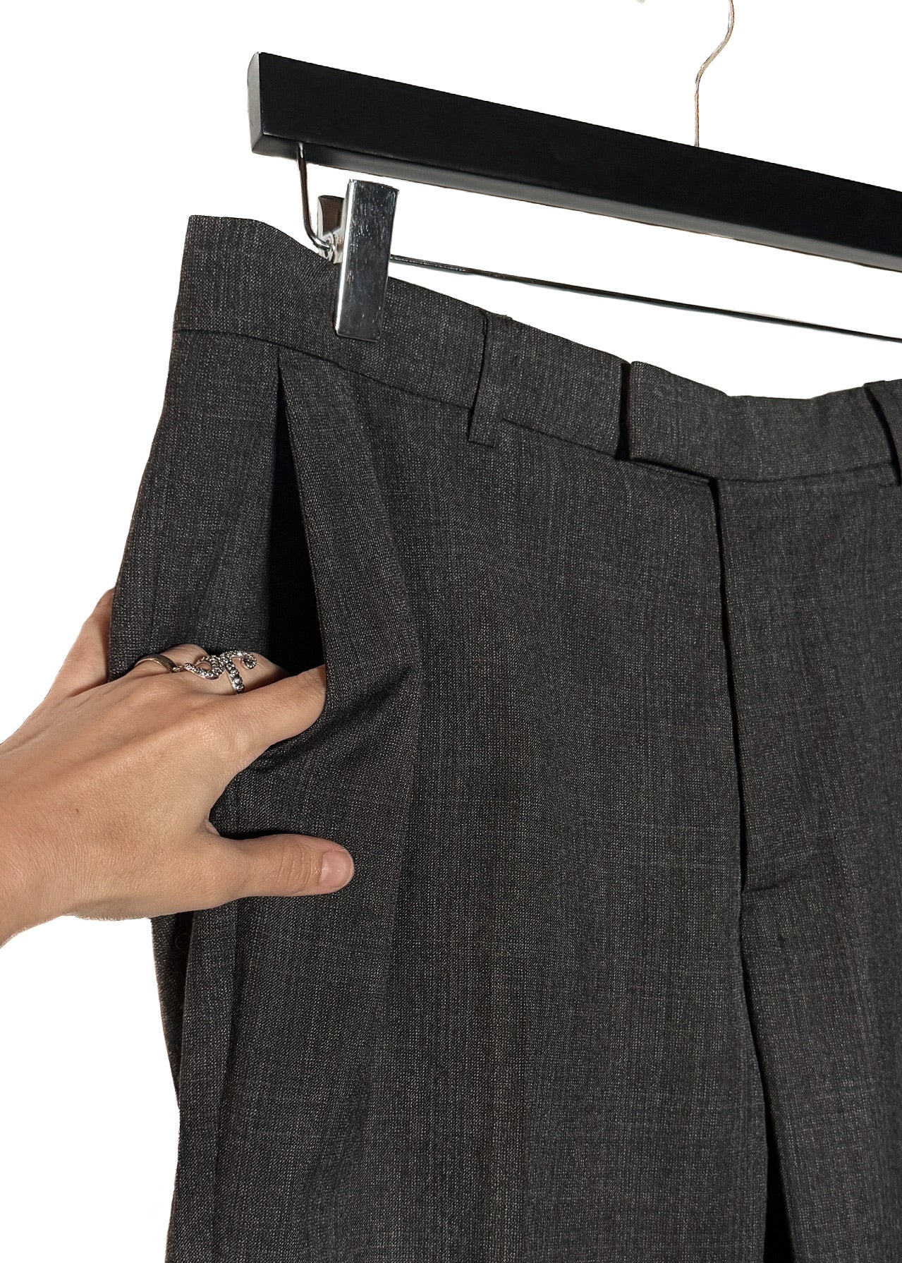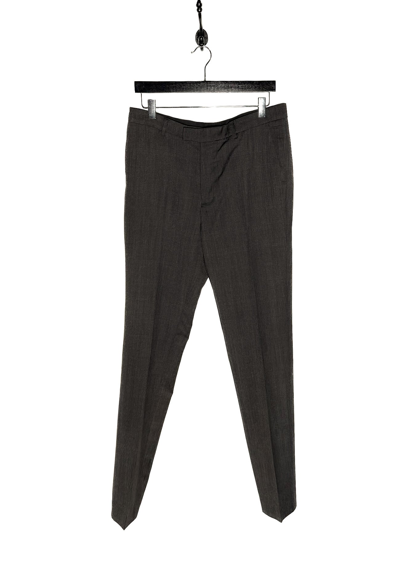 Straight slim fit. Mid-rise. Tapered leg. Charcoal subtly checkered wool. Clean front with single pleat. Concealed zip and hook closure. Side slash pockets. Single back welt pocket. Fully lined with Raf Simons waistband tape. Autumn Winter 2007–2008 collection. Made in Romania.