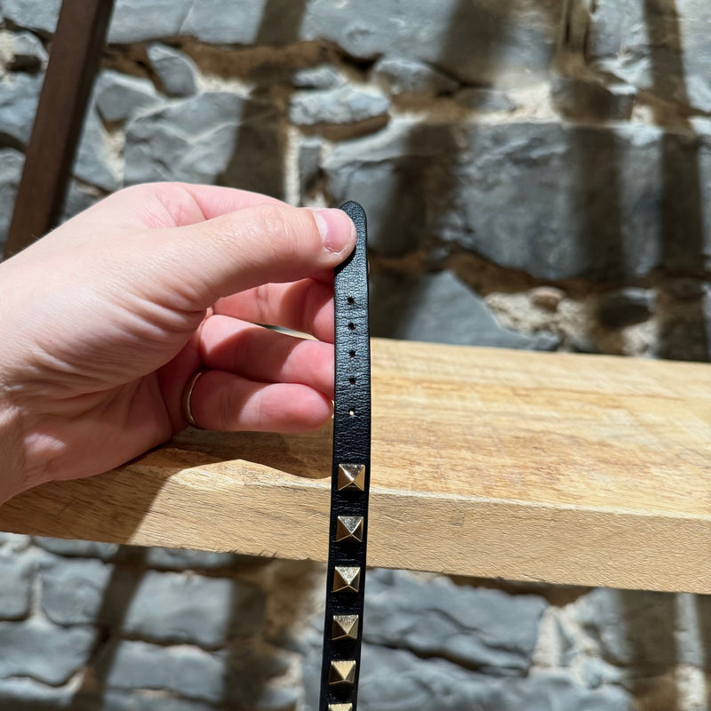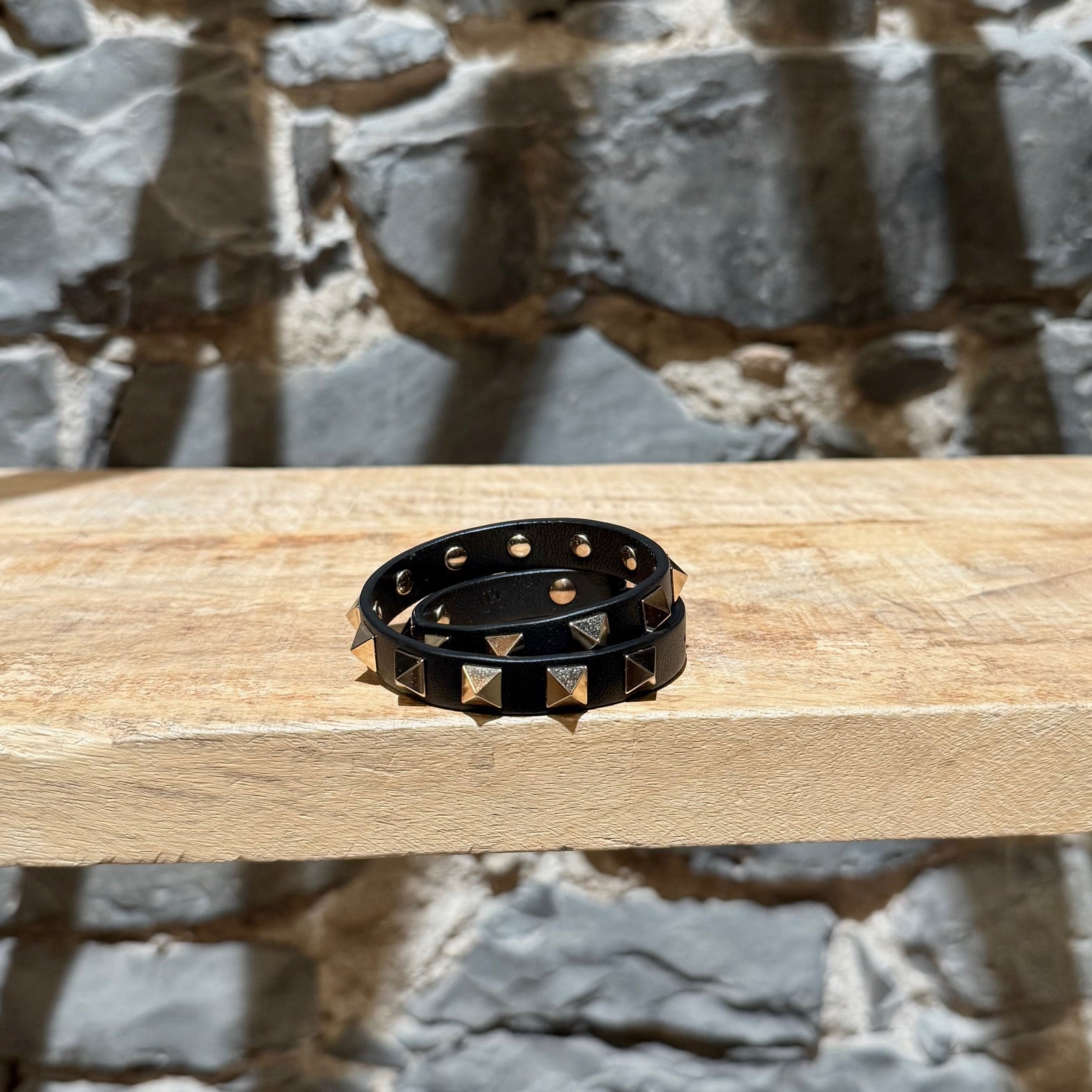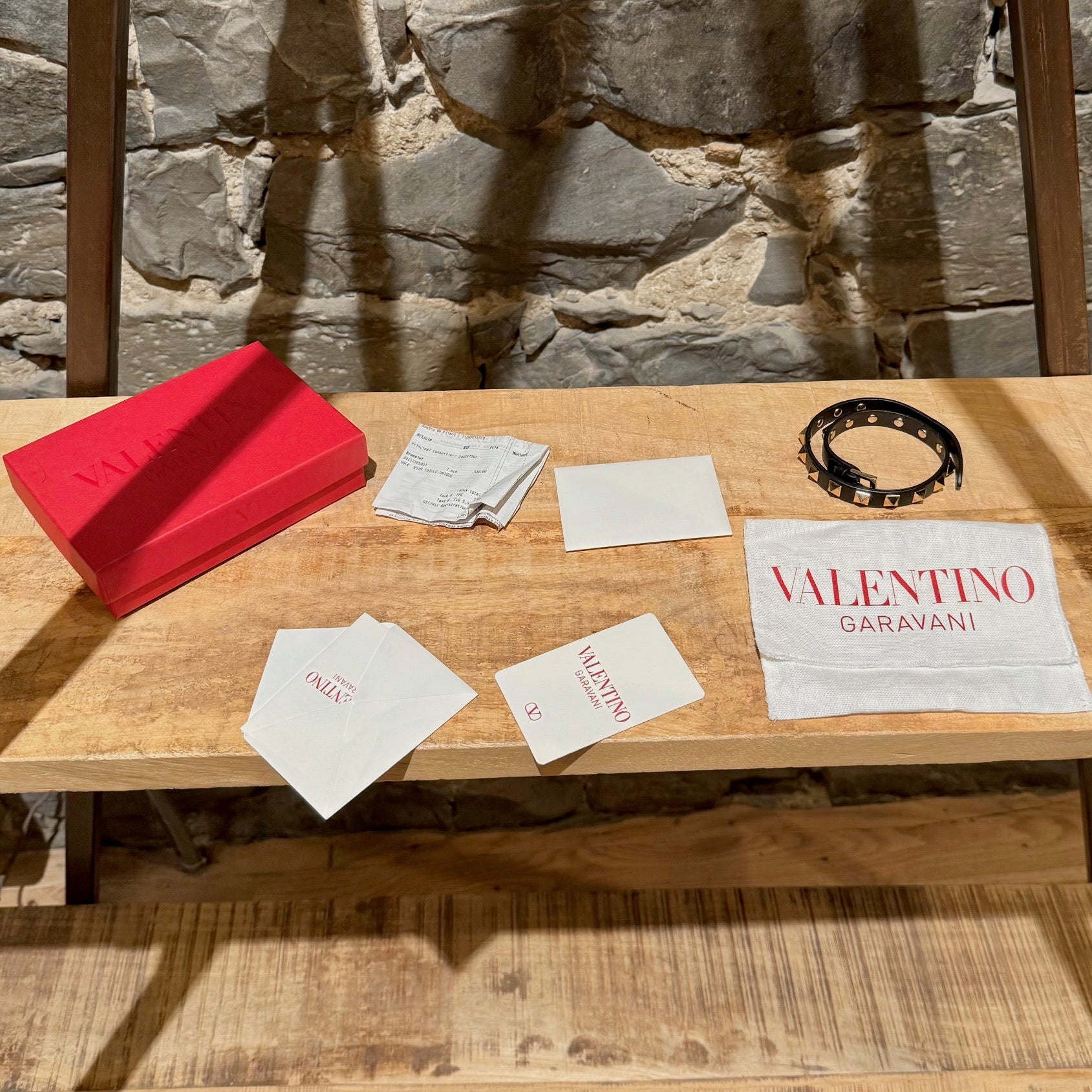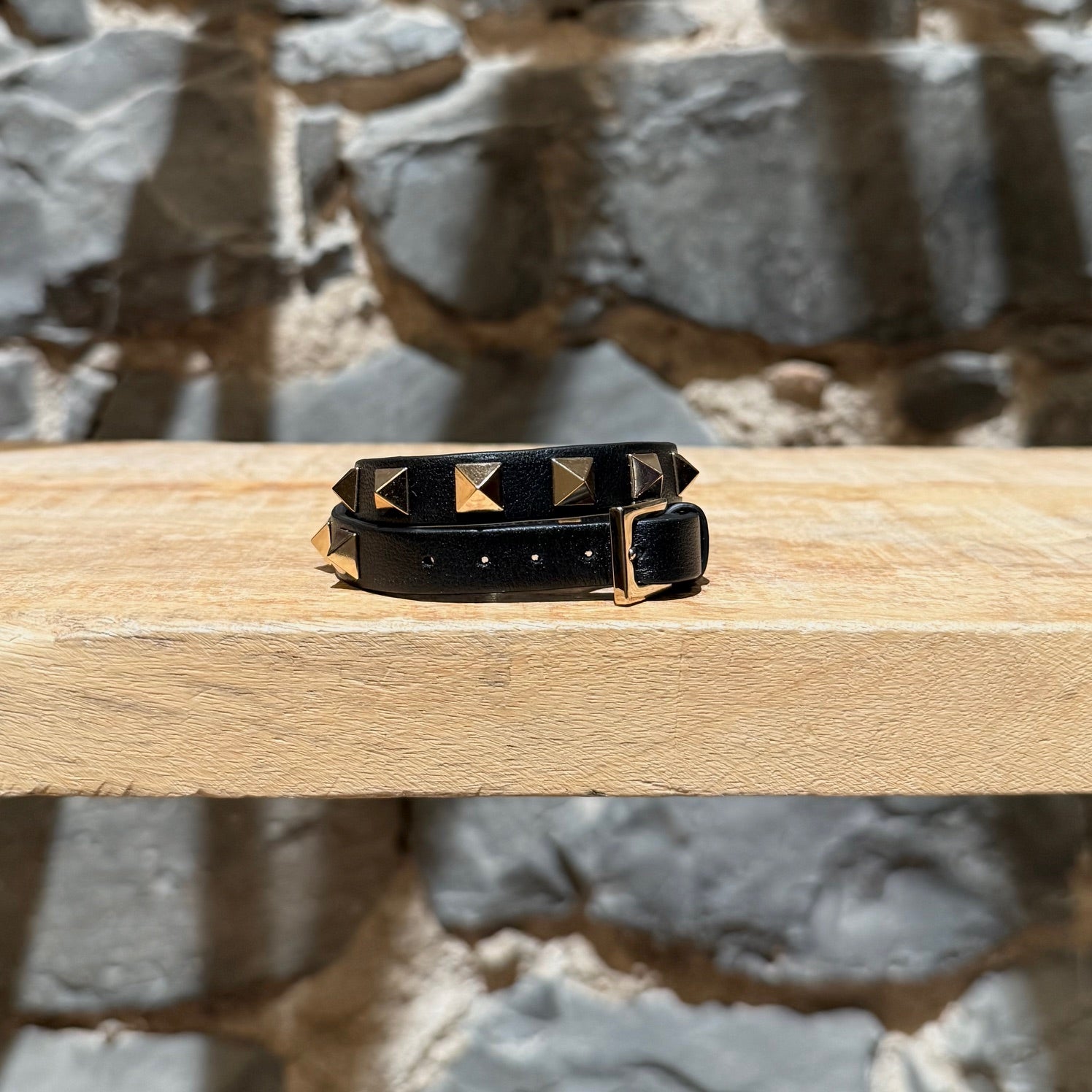 Valentino Double Wrap Leather Rockstud Bracelet. Black smooth leather. Signature pyramid-shaped metal studs in light gold-tone. Double tour design. Adjustable with branded buckle closure. Made in Italy. Comes with Valentino box, dustbag, tag, original receipt, and brand cards.