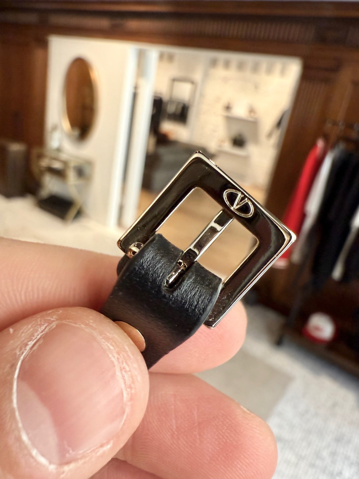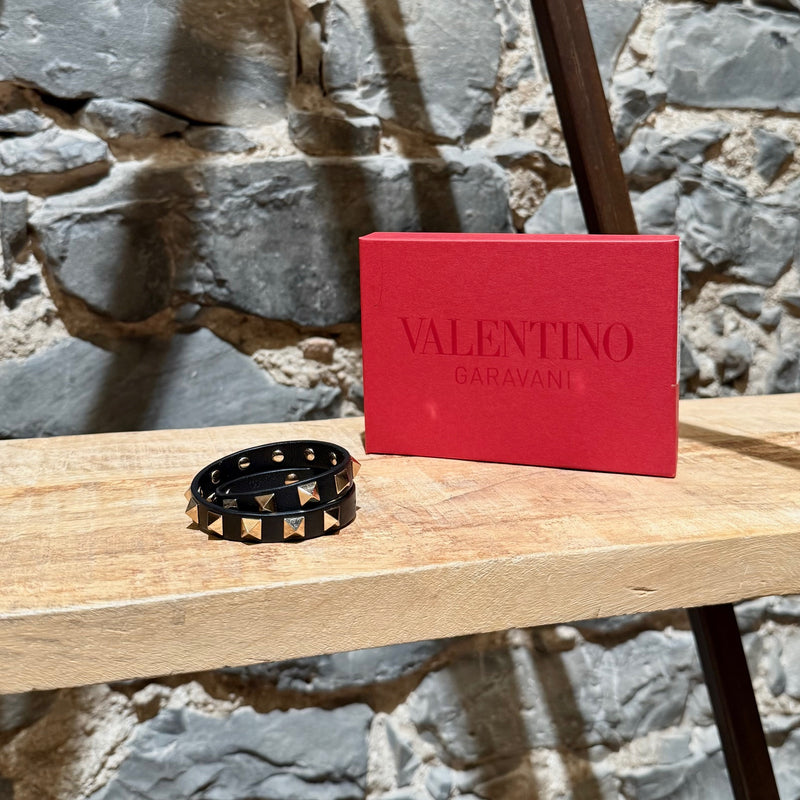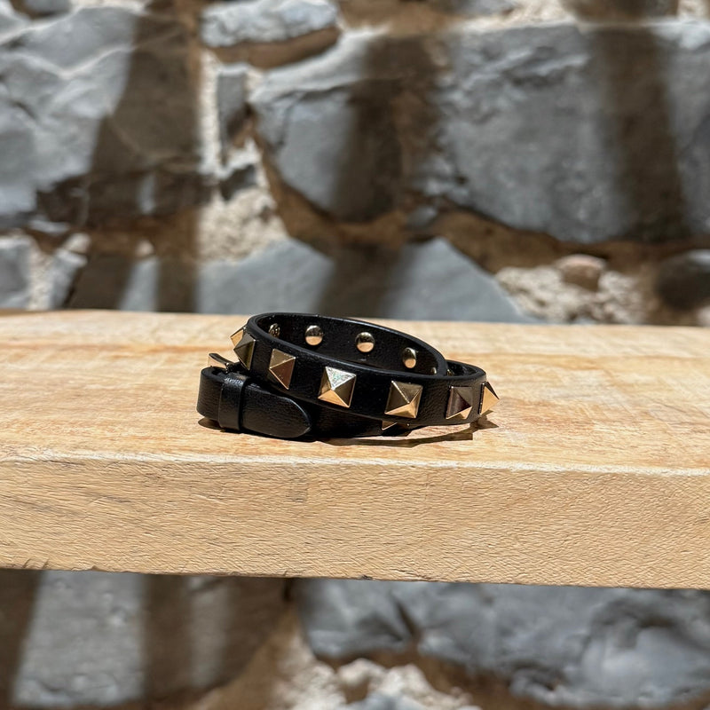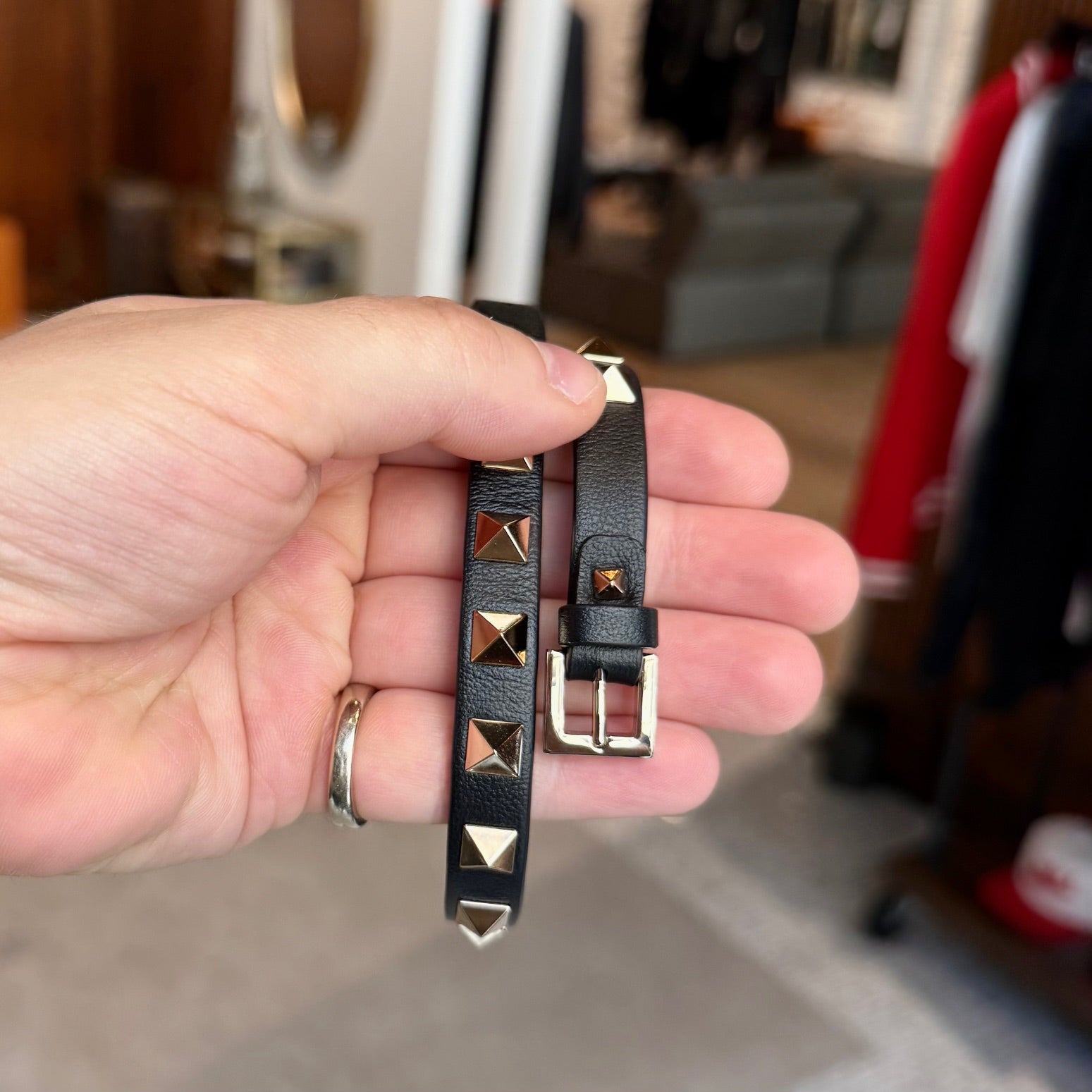 Valentino Double Wrap Leather Rockstud Bracelet. Black smooth leather. Signature pyramid-shaped metal studs in light gold-tone. Double tour design. Adjustable with branded buckle closure. Made in Italy. Comes with Valentino box, dustbag, tag, original receipt, and brand cards.